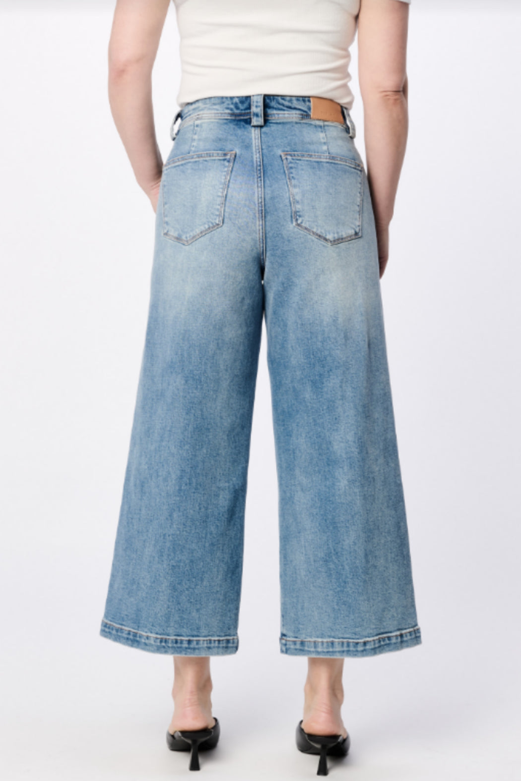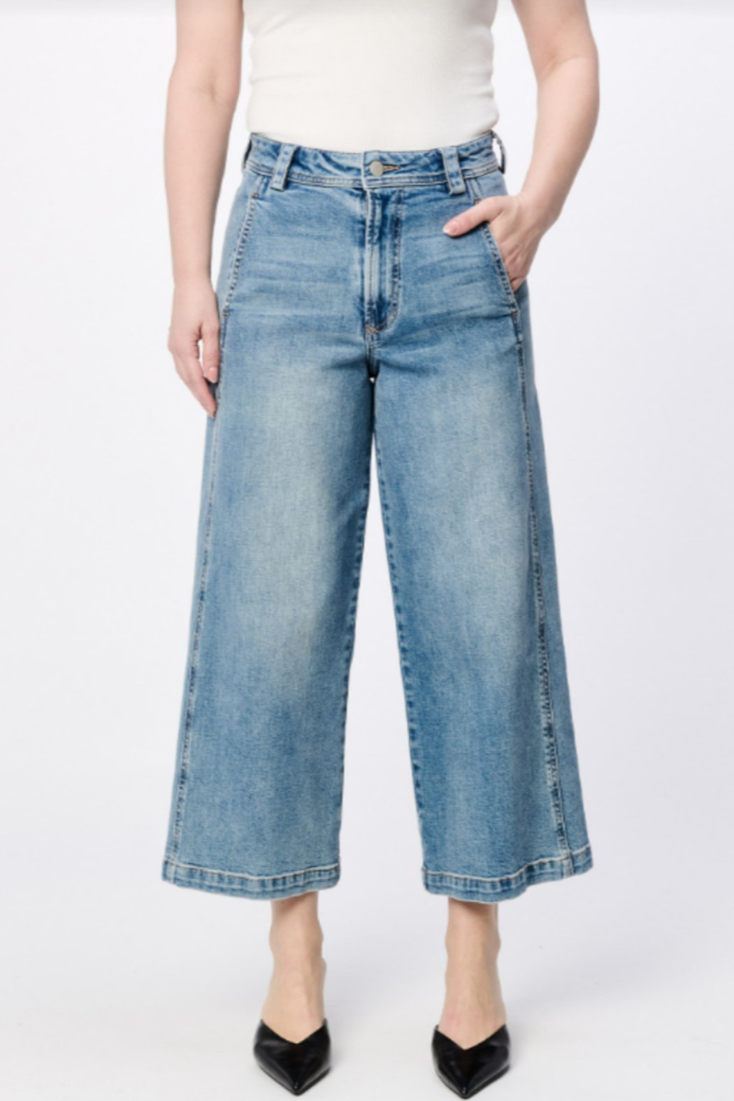 The perfect blend of modern women's fashion and comfortable with our Audrey wide leg jeans in Surfwind, featuring a flattering high-rise fit, a chic drop clean hem and form lifting back dart.