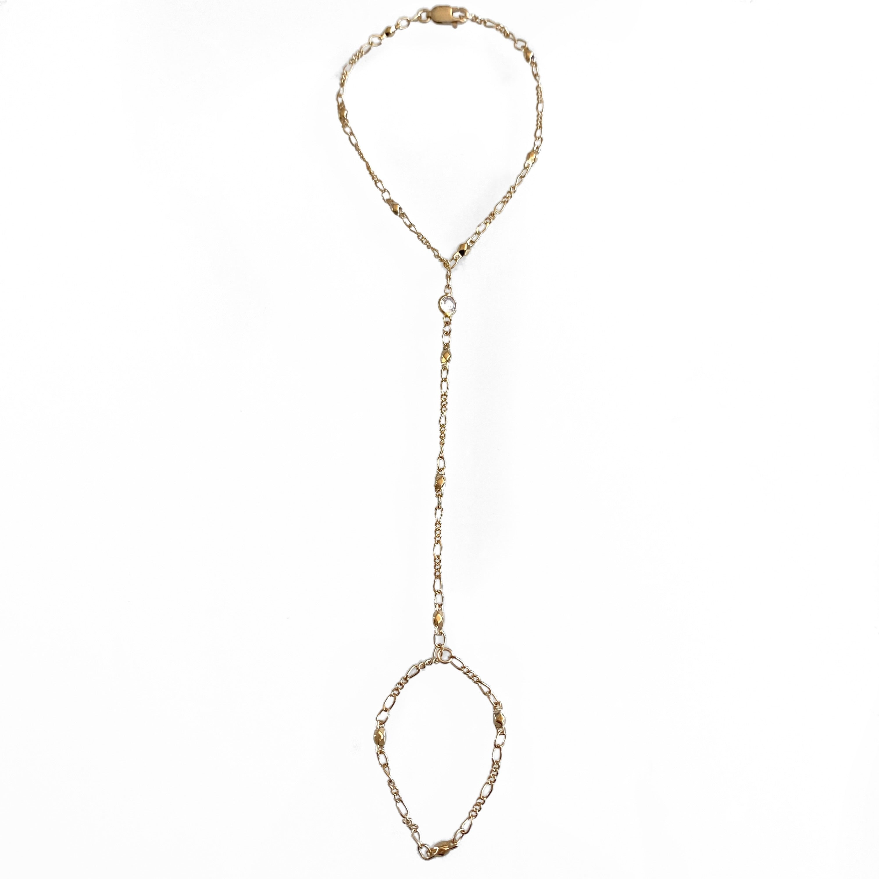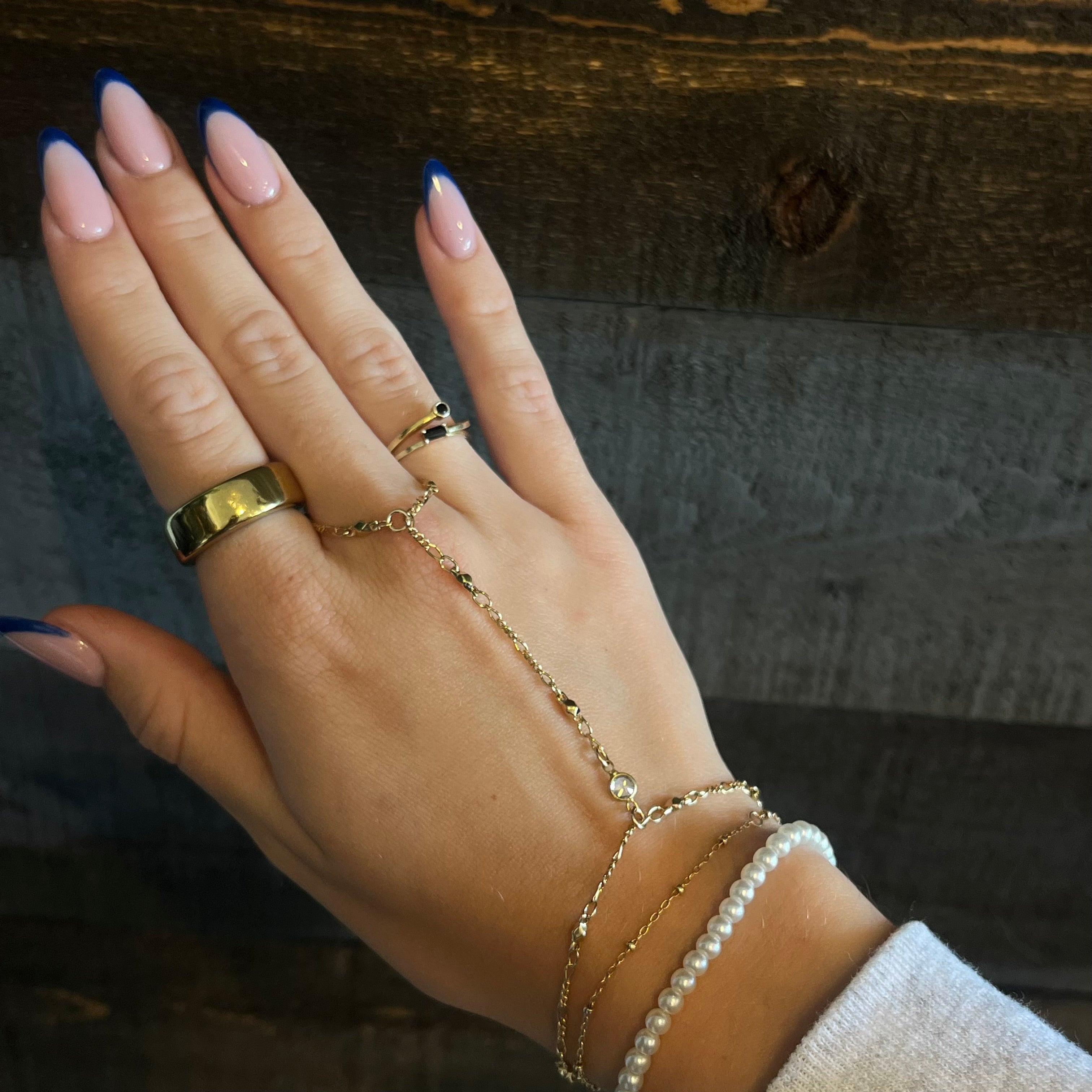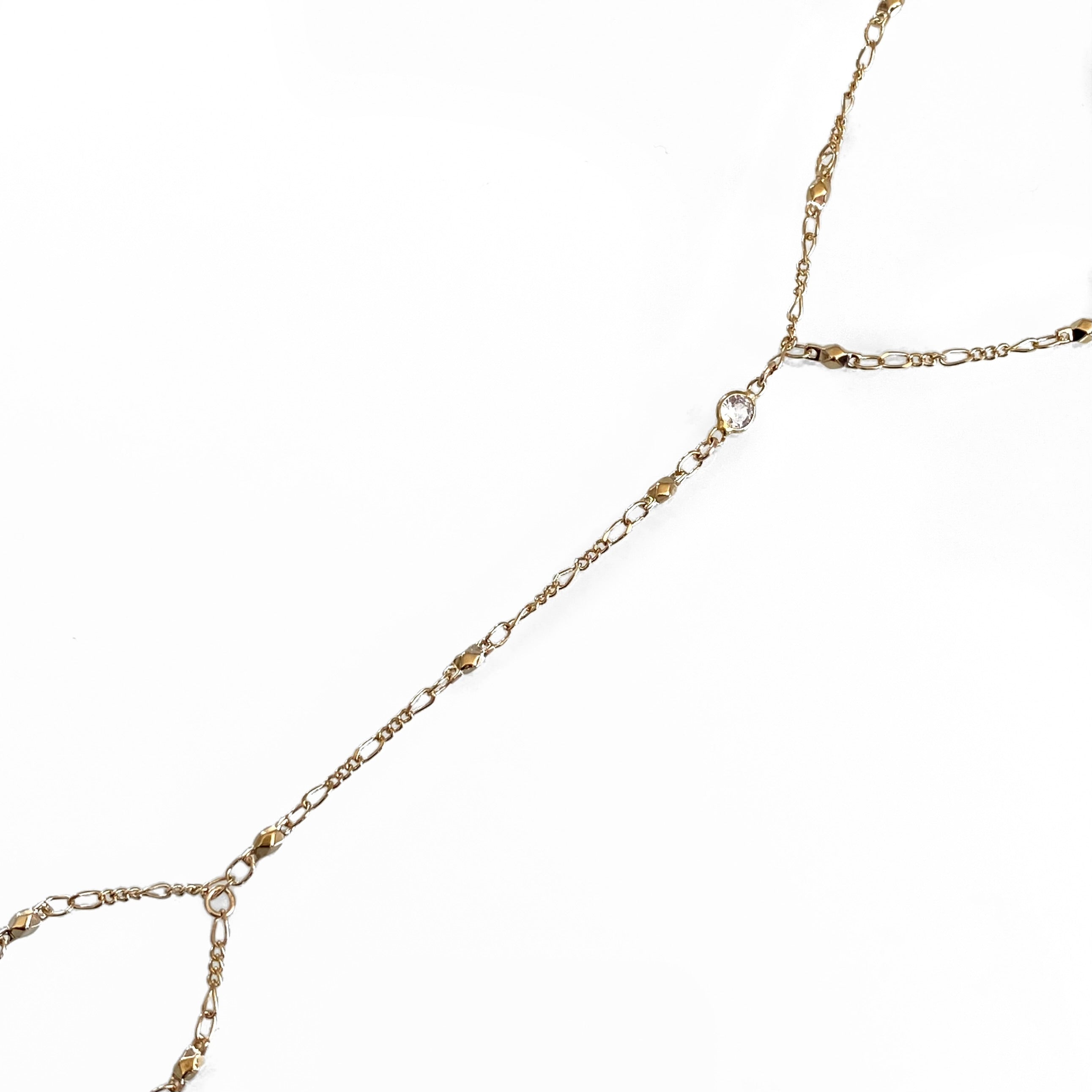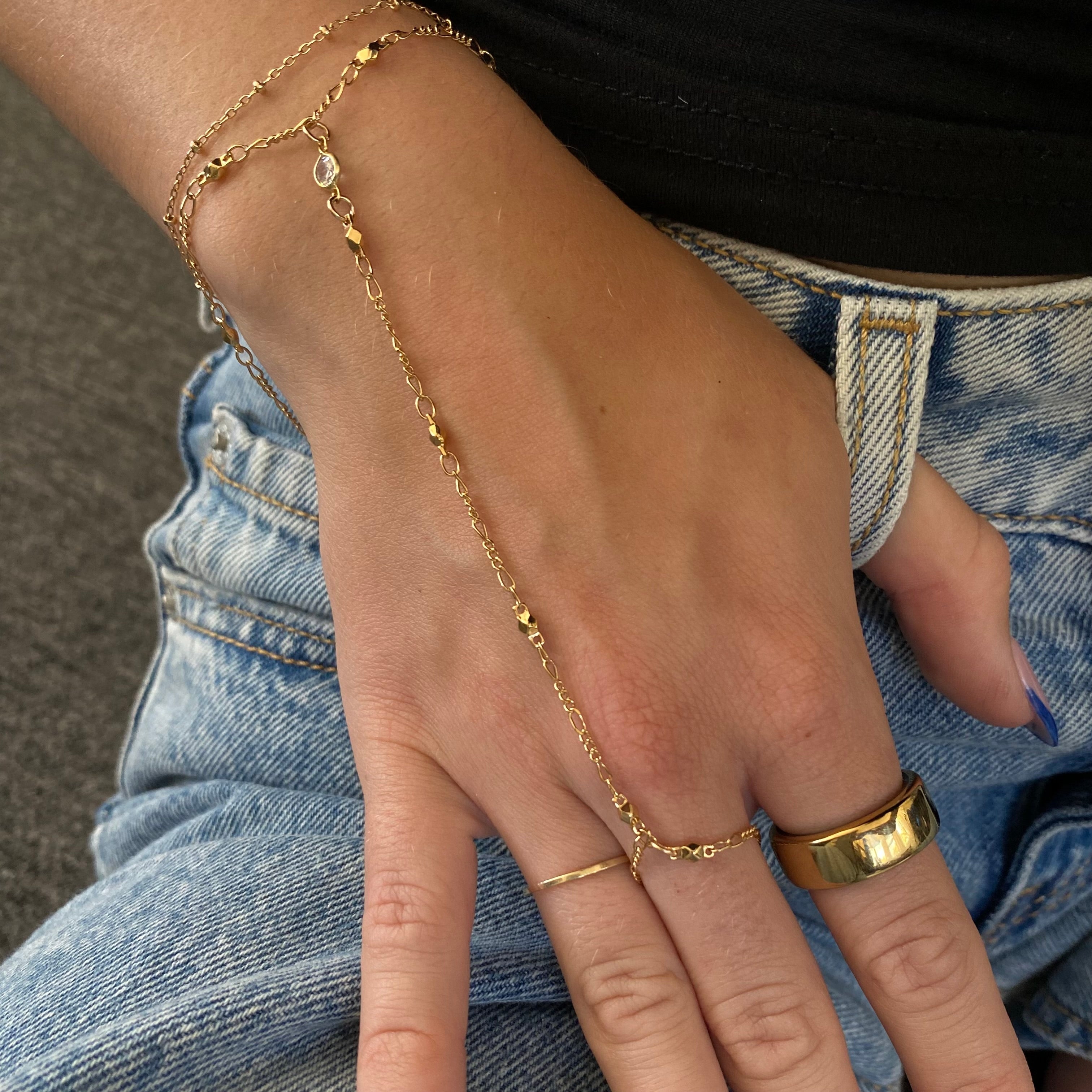 The August Hand Chain is an essential accessory. Its sleek design features a single sparkling CZ stone, crafted with gold-filled chain, making it the perfect elegant touch for your seasonal wardrobe.