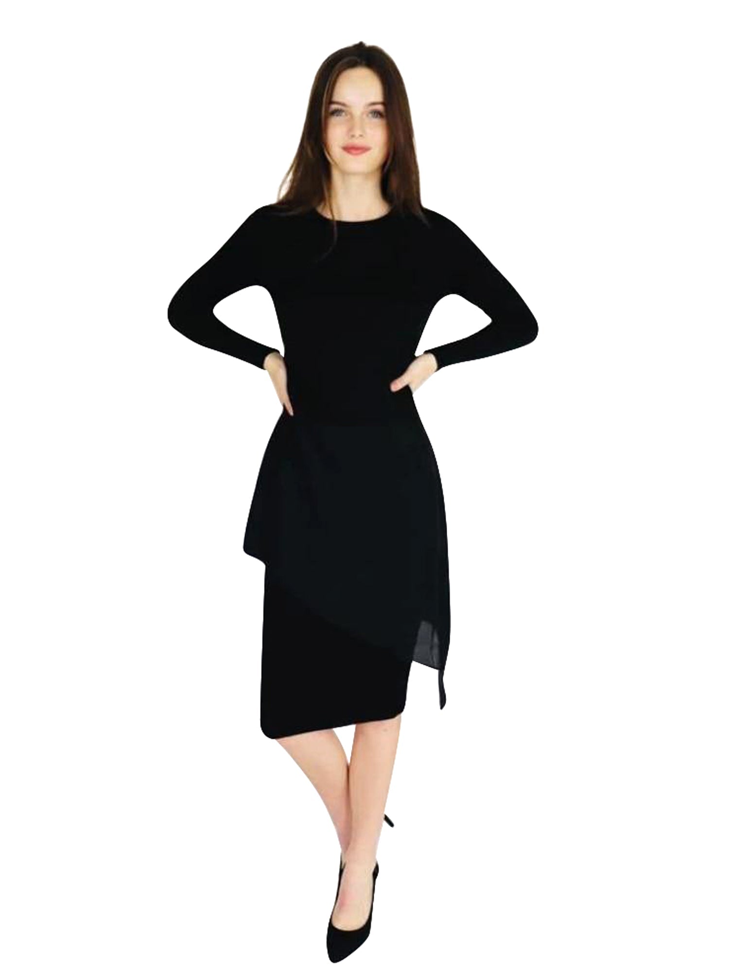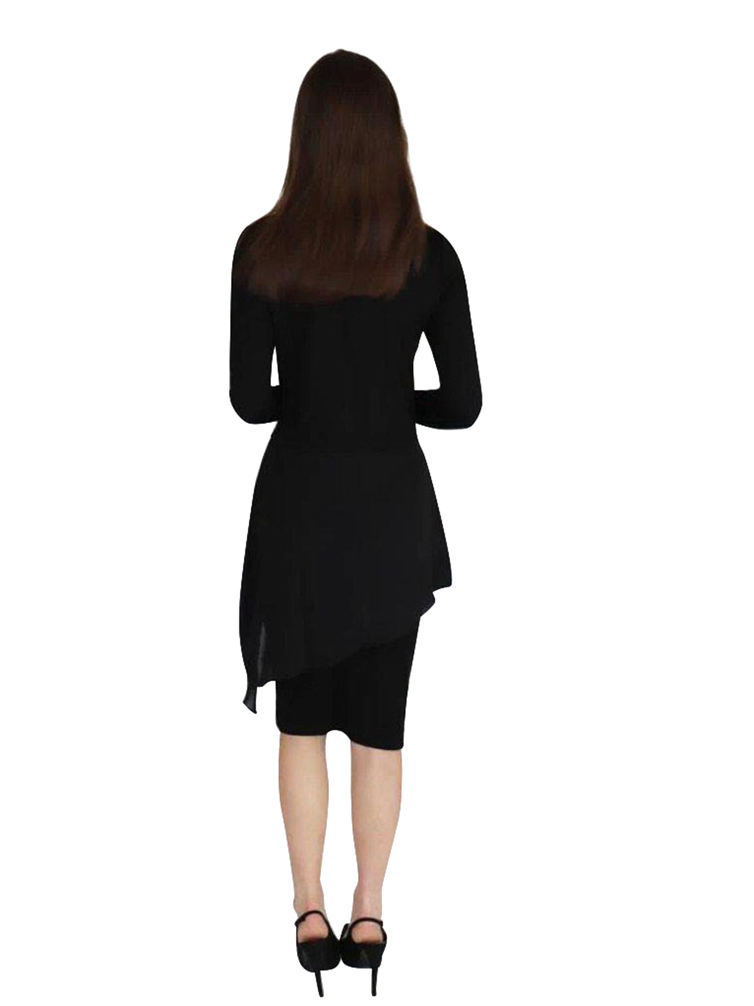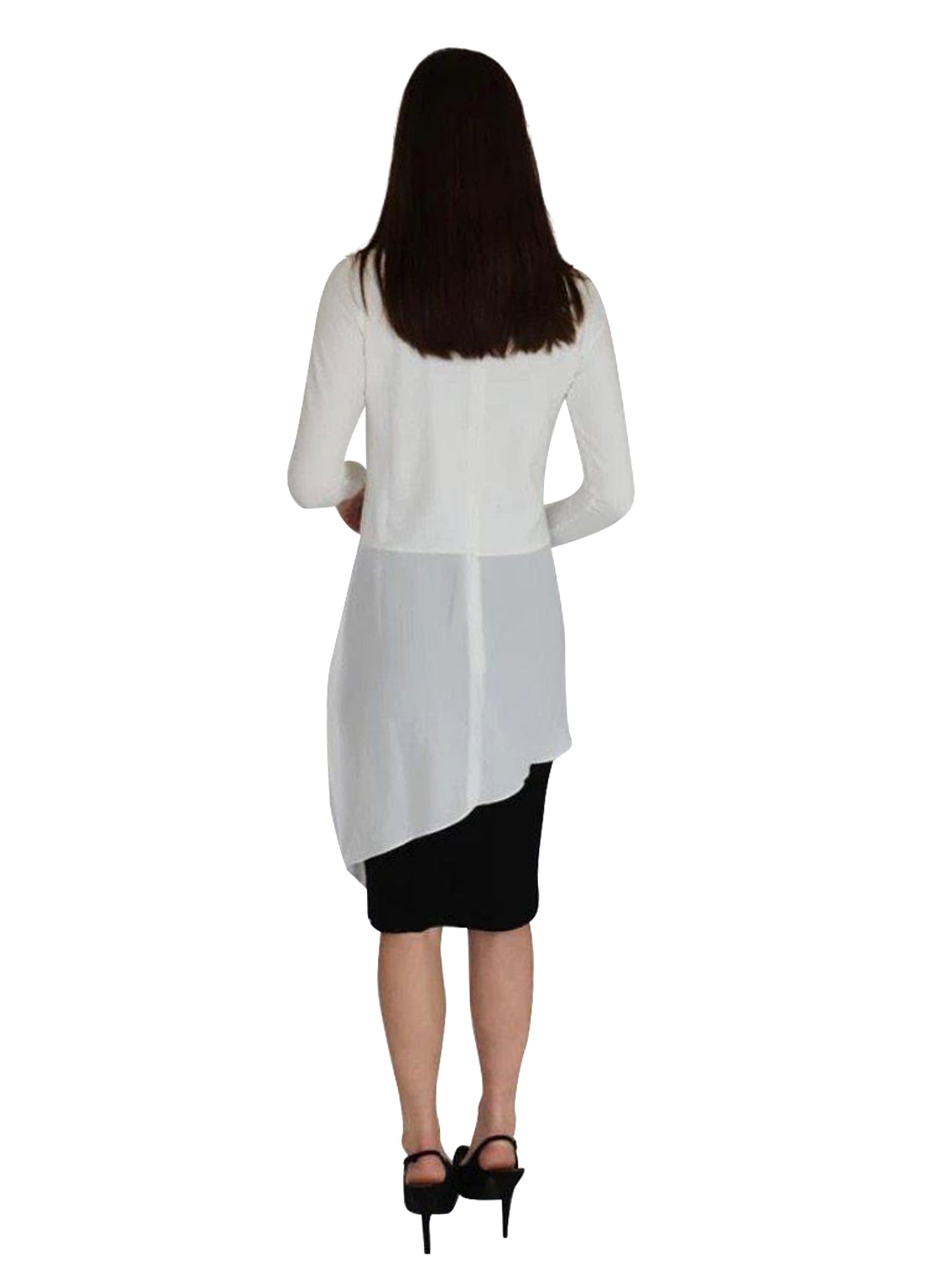 This top has a long overlay and has a chiffon bottom with an asymmetric hem.