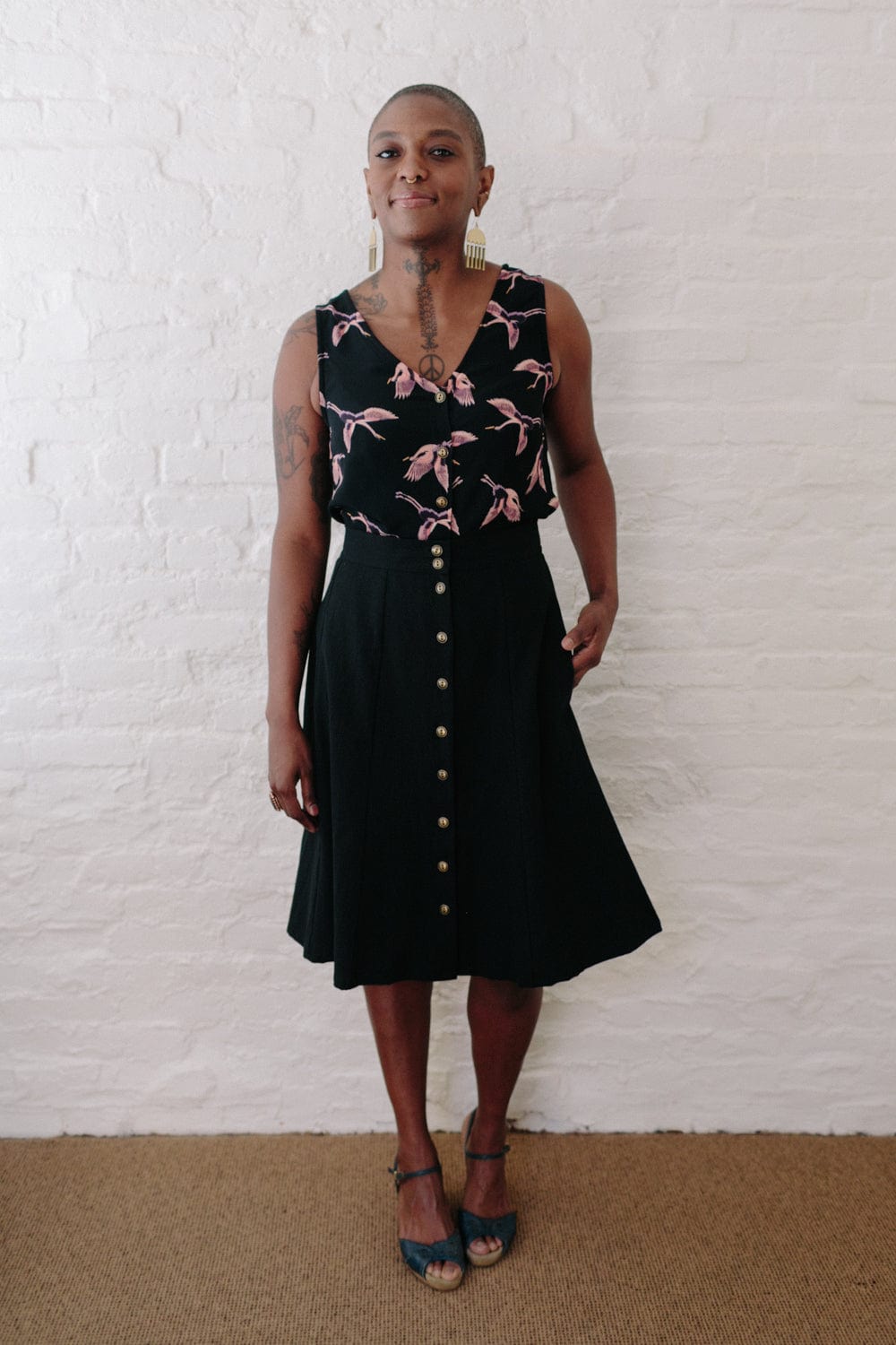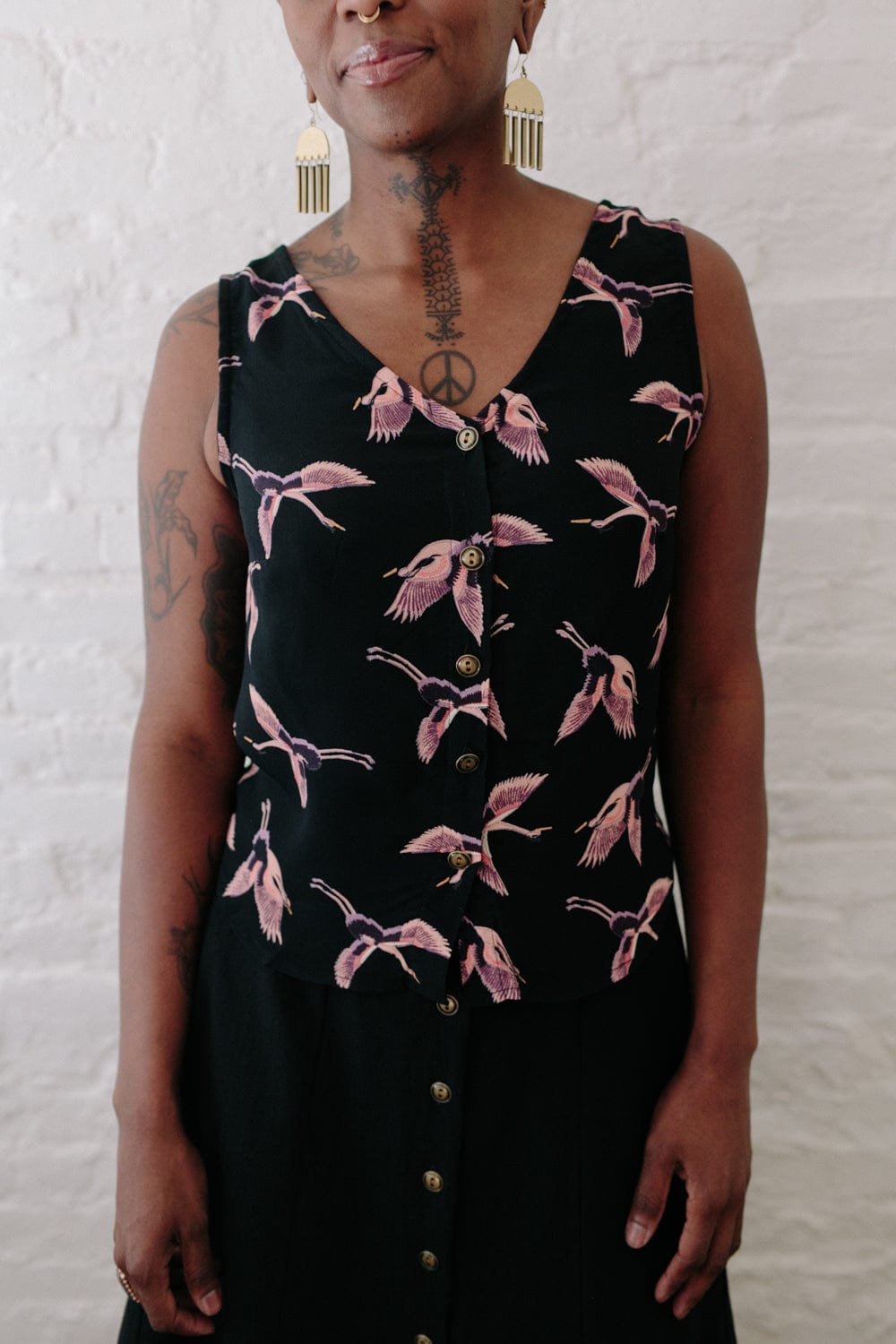 Light weight & easy to wear, can be tucked in or hang free. Raised slightly at the side seams for a fit that flatters. Button down center front with 5 vintage brass buttons.