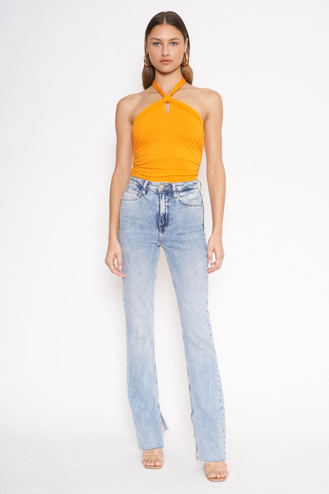 The Azalea halter top bodysuit. Dress it up with light denim jeans and nude heels.
