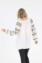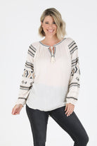 This off-white garment is crafted from 100% rayon and features an Aztec print with long sleeves and a front tie.