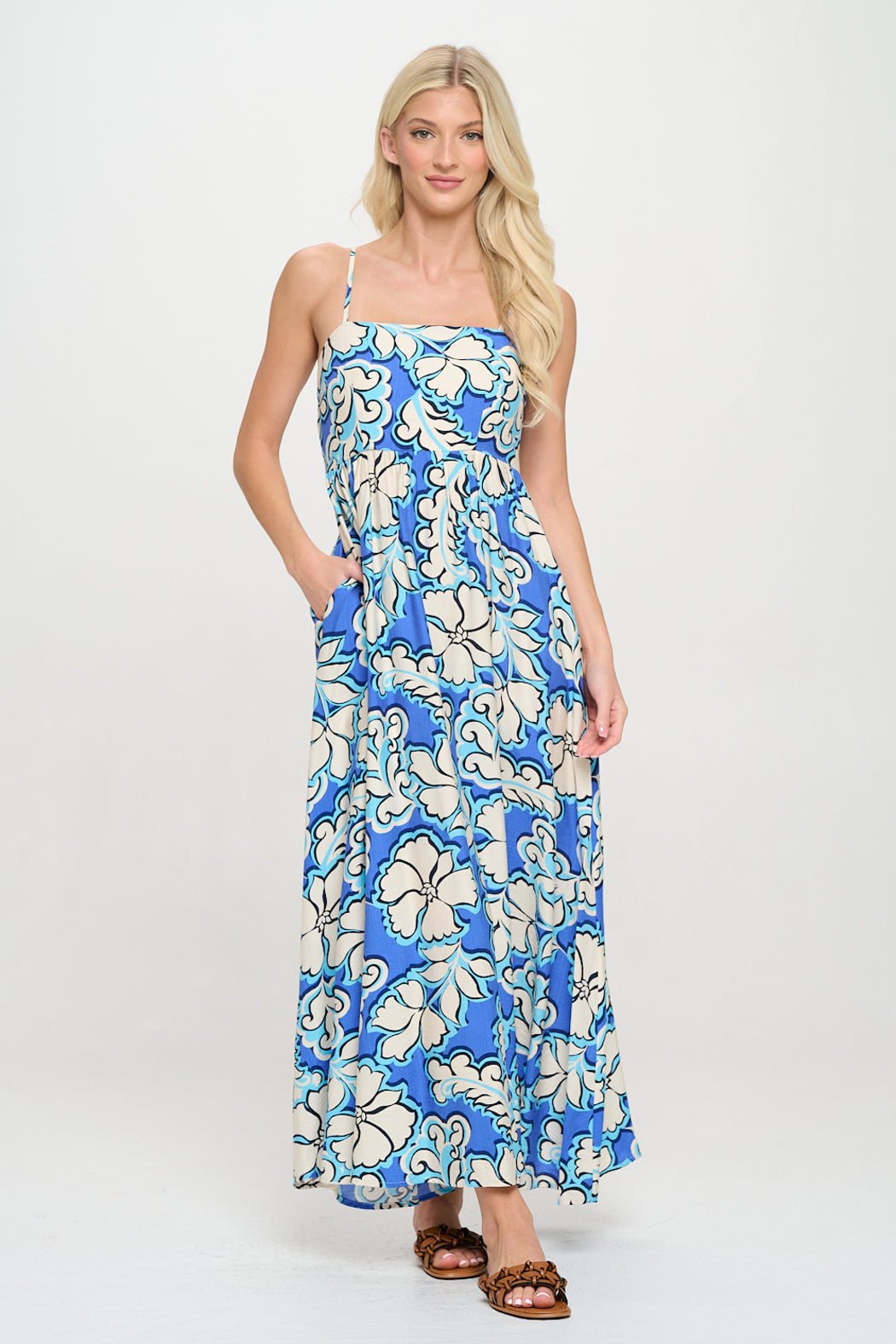 Turn heads in this vibrant blue floral maxi dress, featuring an all-over bold print and a flattering empire waist. Designed with adjustable spaghetti straps and hidden pockets for effortless ease, this flowy silhouette is perfect for sunny getaways, resort wear, or garden parties.