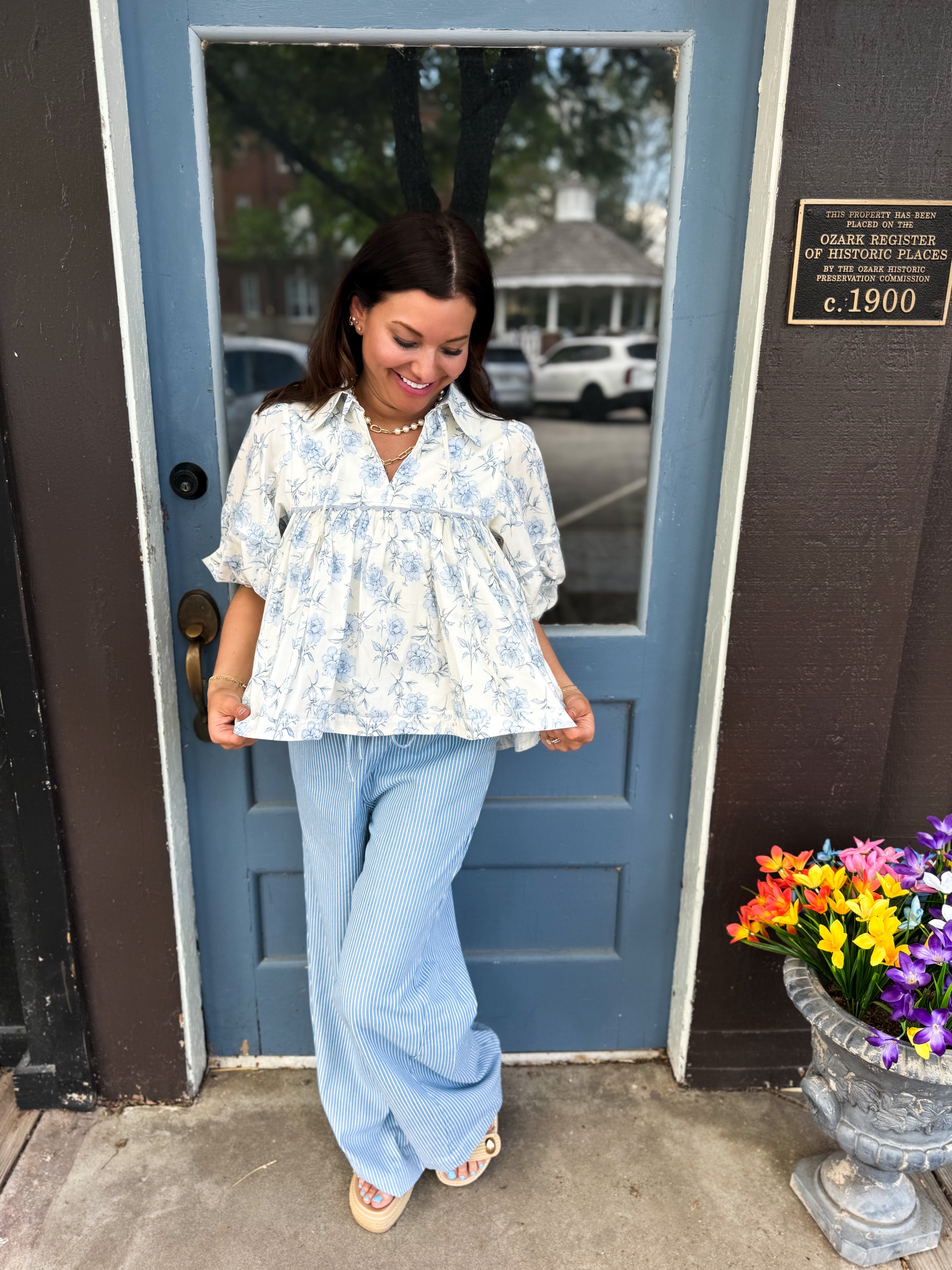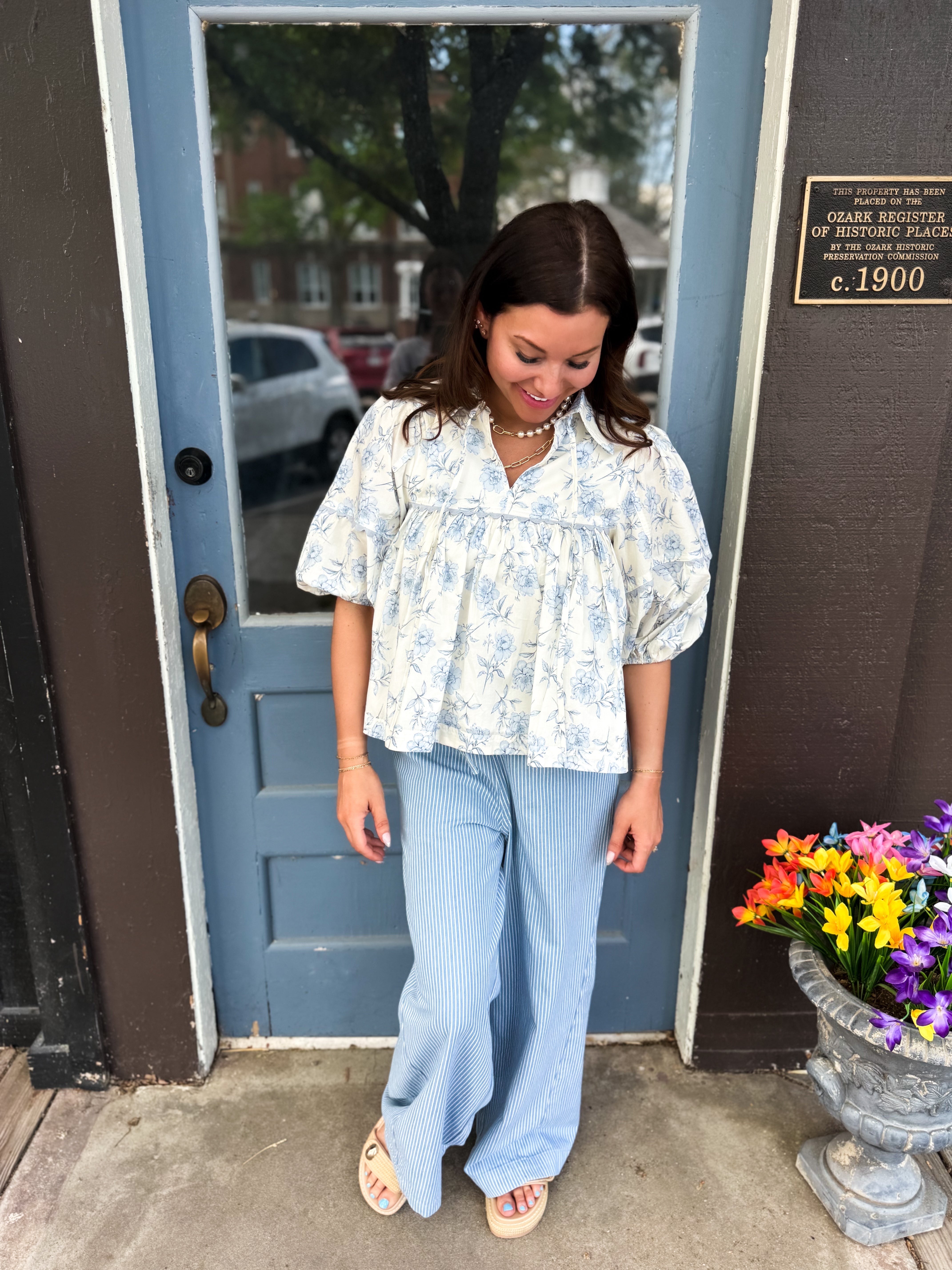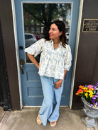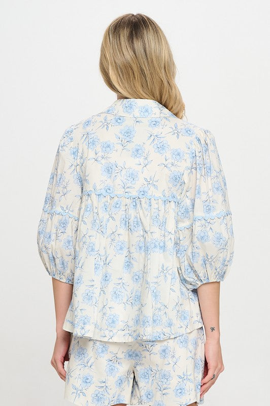 Feminine floral blouse featuring a collared neckline with tie detail, flowy babydoll silhouette, and puff sleeves with subtle lace trim. Lightweight woven fabric makes this an effortless piece for spring and summer. Perfect for pairing with denim, skirts, or tailored shorts for a chic daytime look.