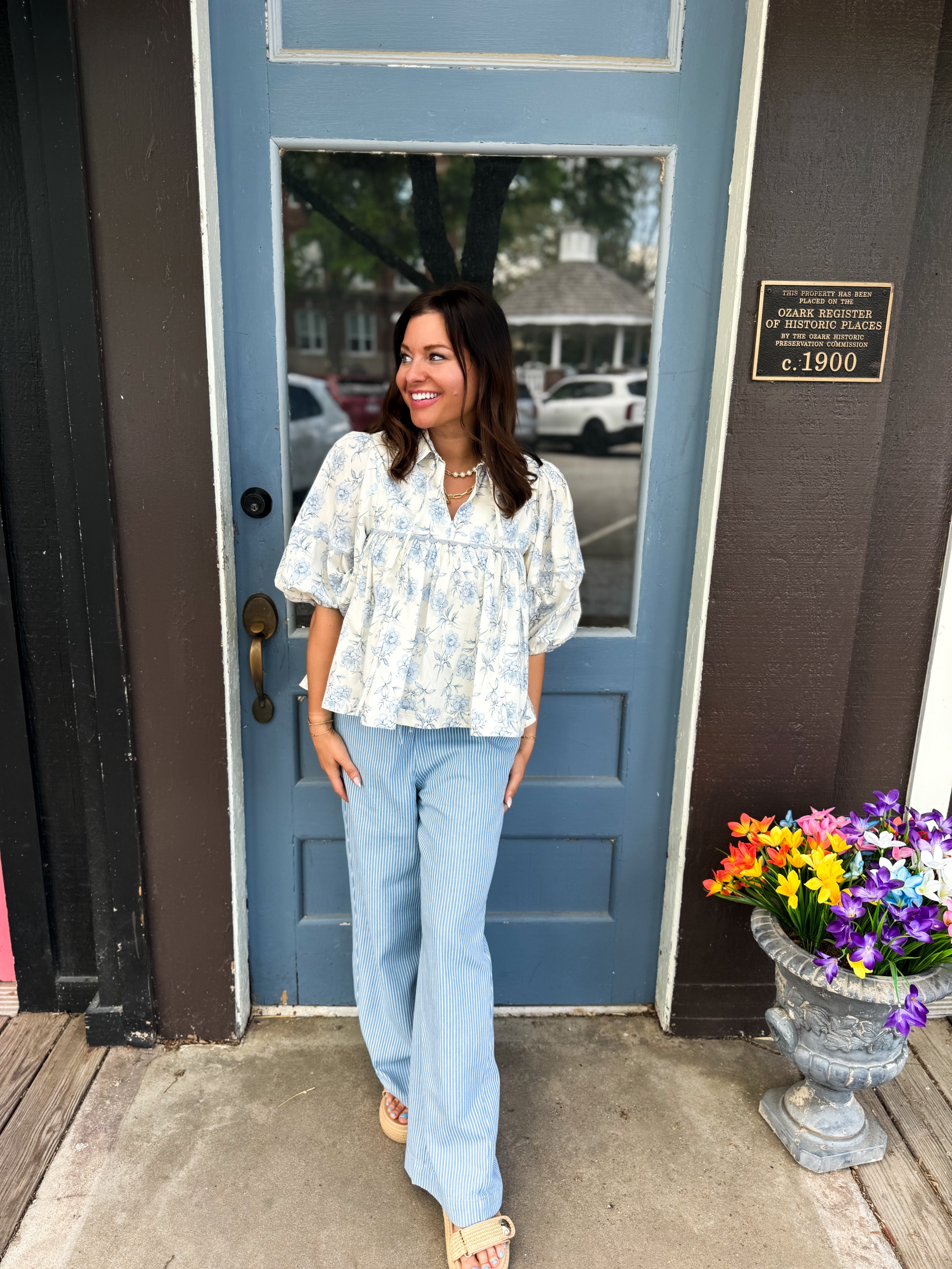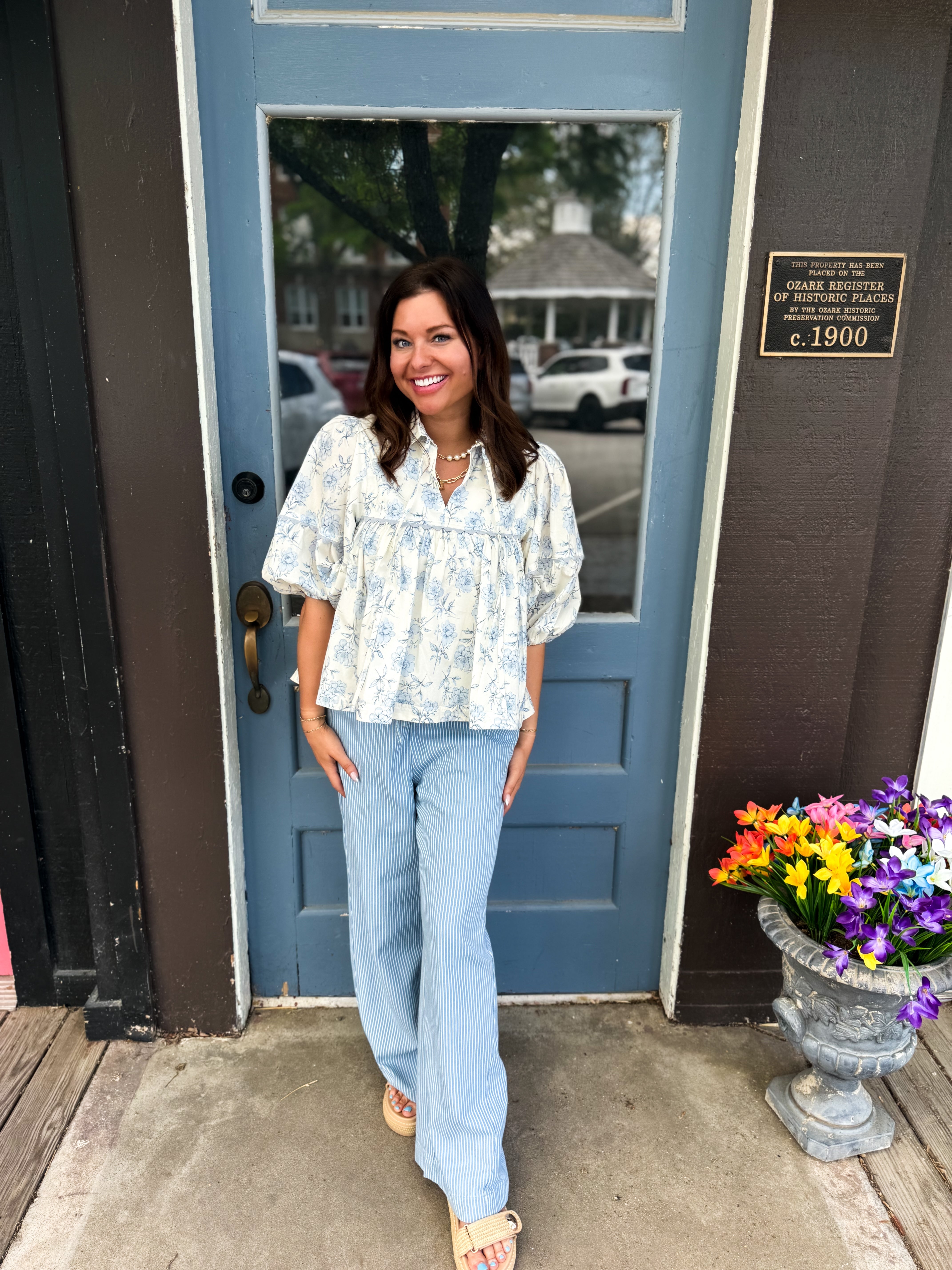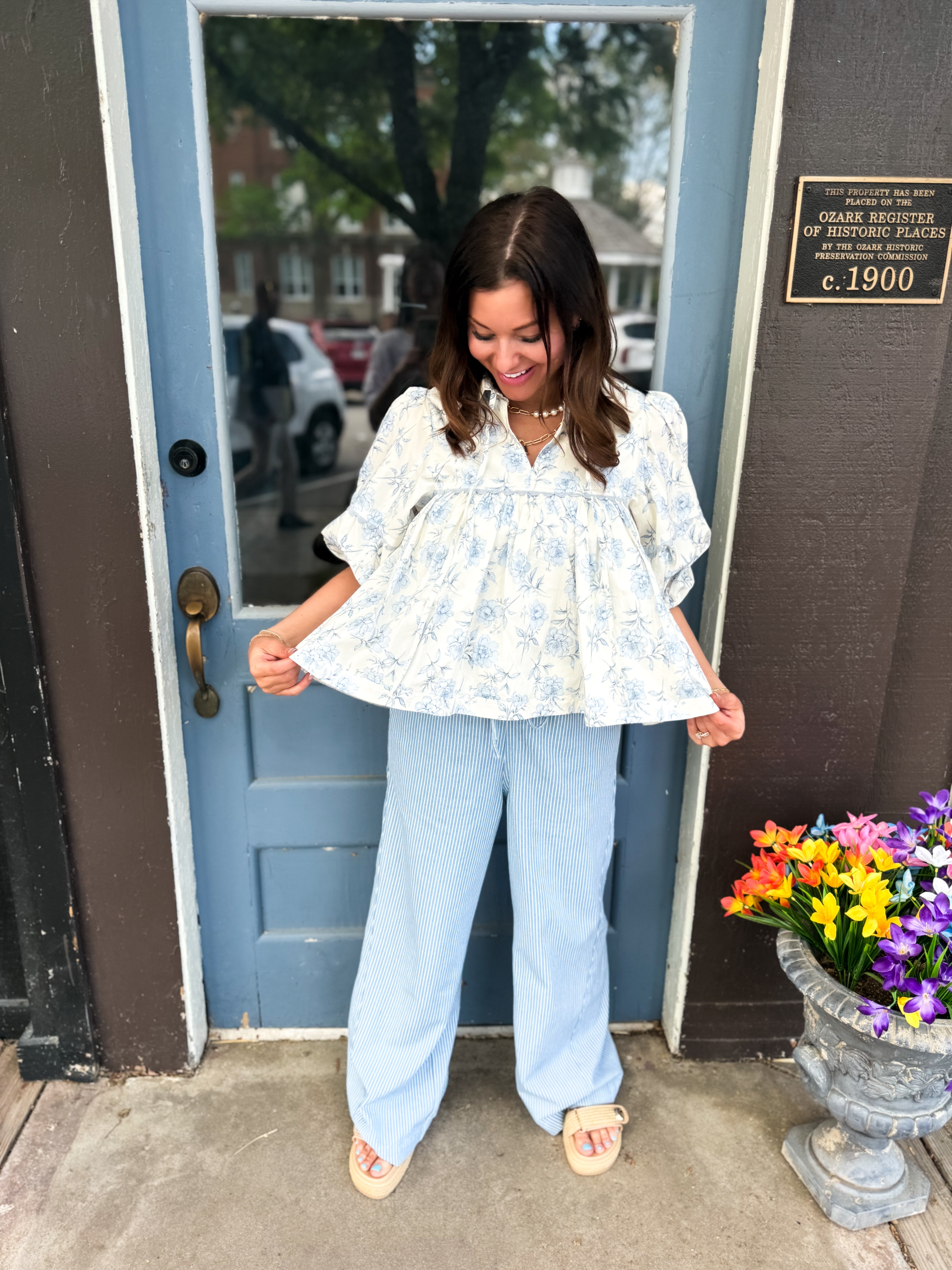 Feminine floral blouse featuring a collared neckline with tie detail, flowy babydoll silhouette, and puff sleeves with subtle lace trim. Lightweight woven fabric makes this an effortless piece for spring and summer. Perfect for pairing with denim, skirts, or tailored shorts for a chic daytime look.