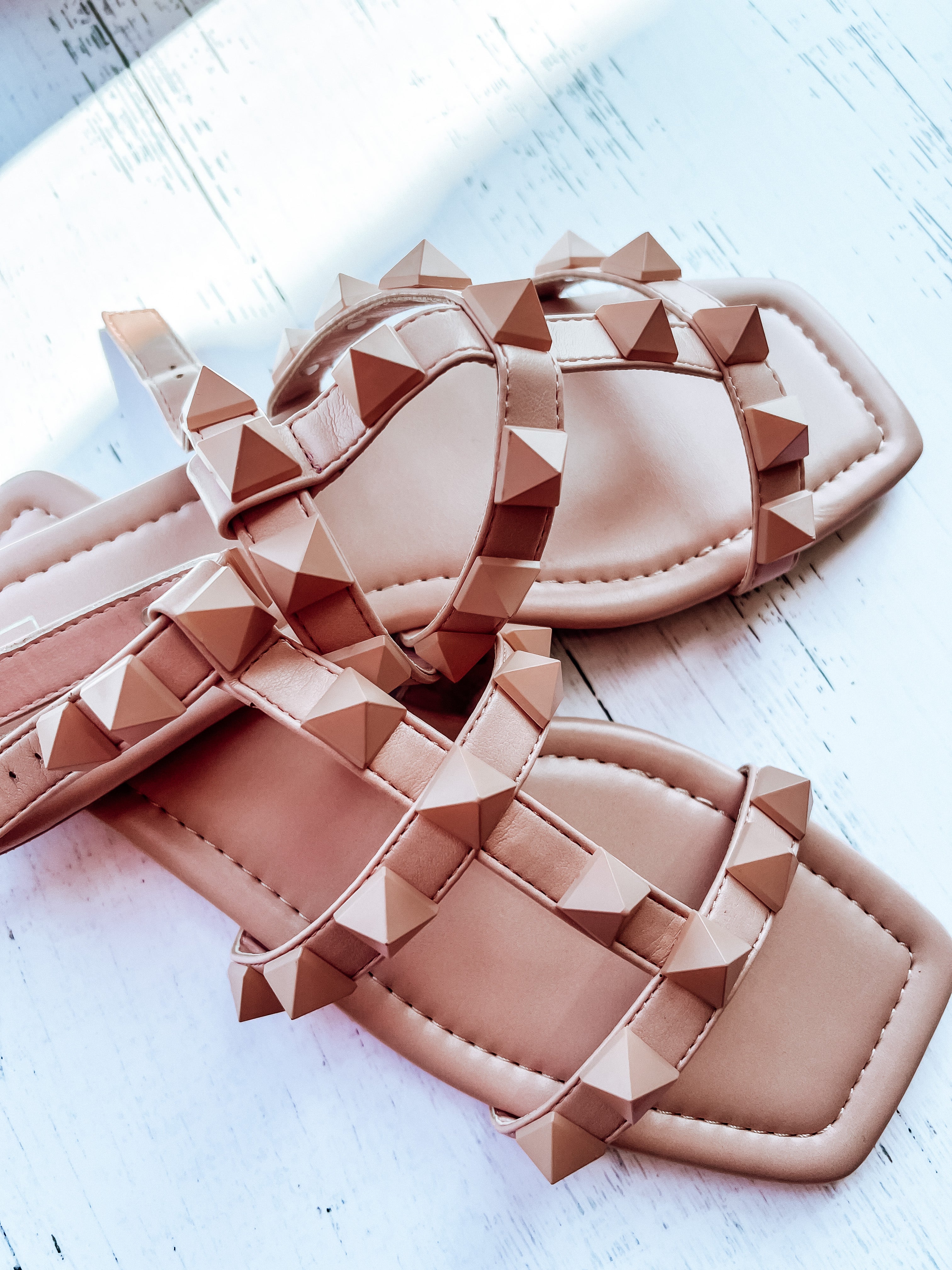 Our BABE studded flat sandal is crafted from supple faux leather and decorated with matching color pyramid-shaped embellishments along the straps. Wear yours with swimwear or denim cut-offs.