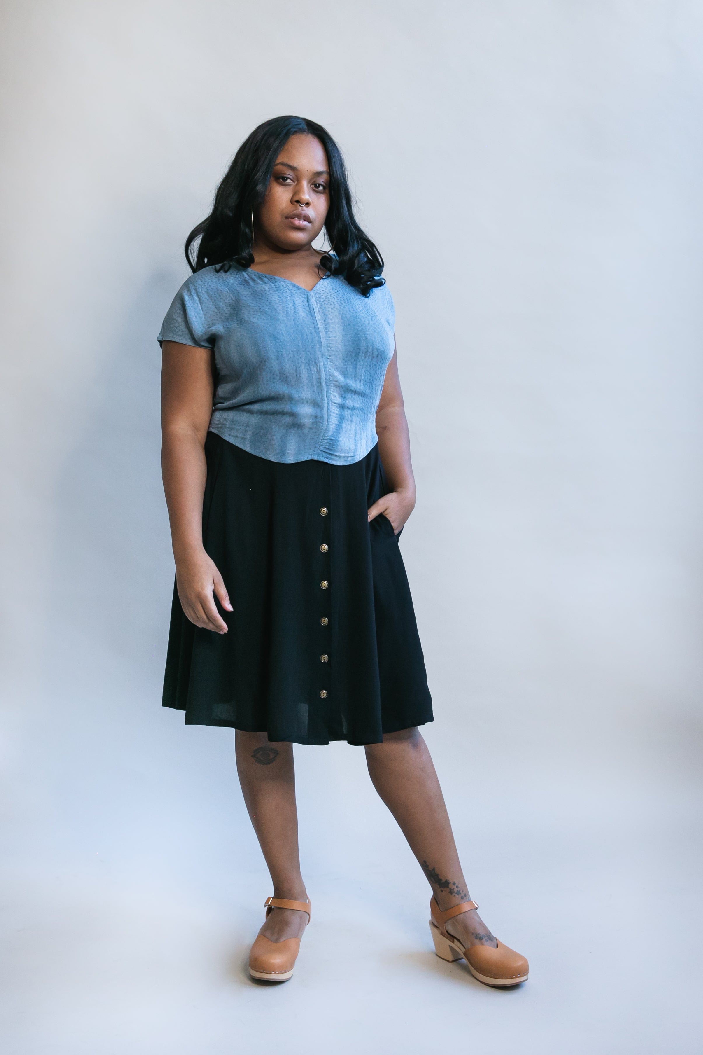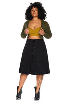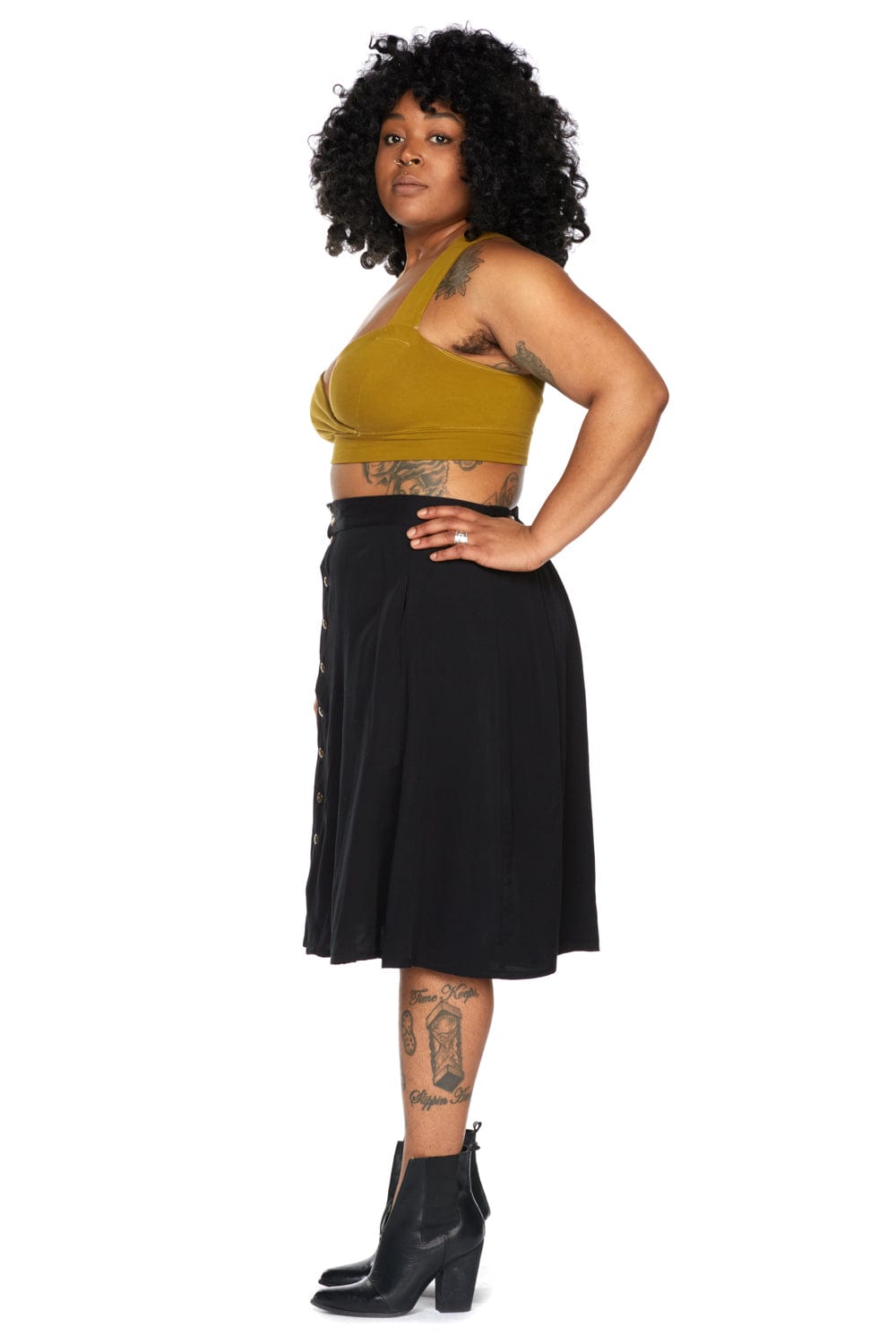 The Bae Skirt a bell shaped wardrobe staple. Features our signature brass buttons in a front closure. Extra inside button to keep the high waist line from pulling so the buttons won't gap on you. Elastic stretch on the back side for breathing and eating in comfort. Perfect knee length for the active femme. Princess seams with hidden side seam pockets.
