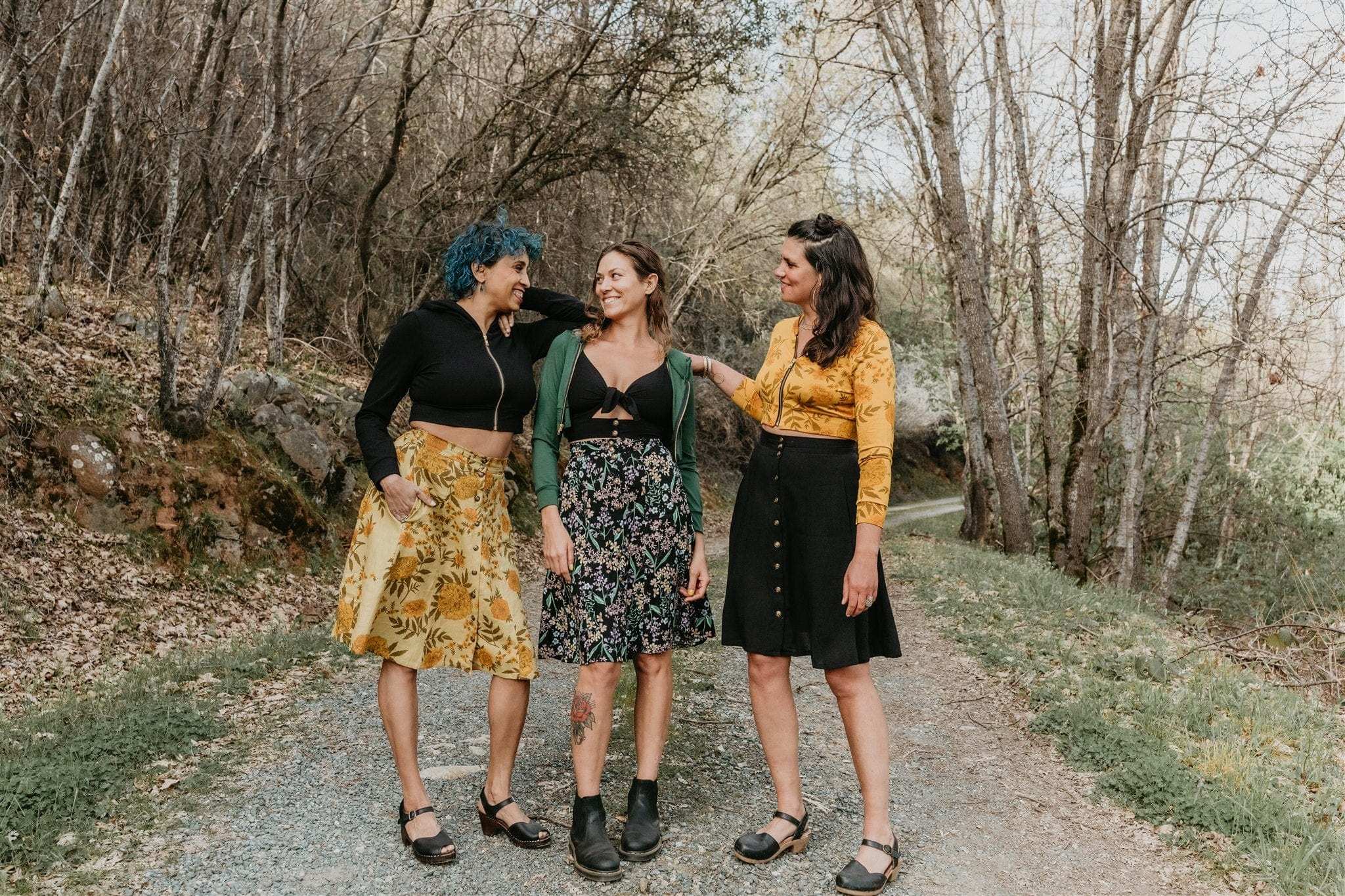 The Bae Skirt a bell shaped wardrobe staple. Features our signature brass buttons in a front closure. Extra inside button to keep the high waistline from pulling so the buttons won't gap on you. Elastic stretch on the back side for breathing and eating in comfort. Perfect knee length for the active femme. Princess seams with hidden side seam pockets.