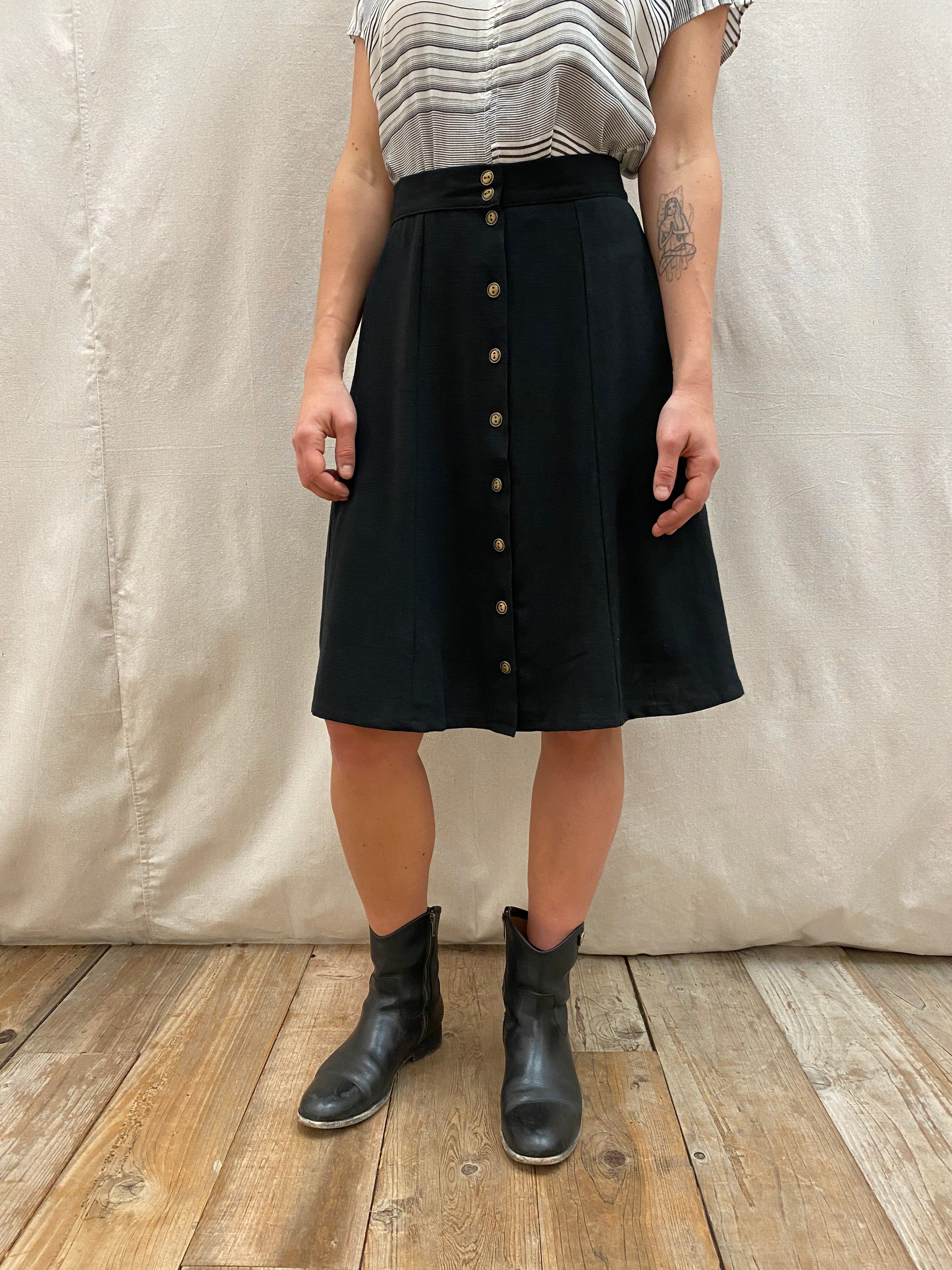 The Bae Skirt a bell shaped wardrobe staple. Features our signature brass buttons with a center front closure. Extra inside button to keep the high waist line from pulling so the buttons won't gap on you. Elastic stretch on the back side for breathing and eating in comfort. Perfect knee length for the active femme. Princess seams with hidden side seam pockets.