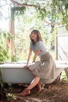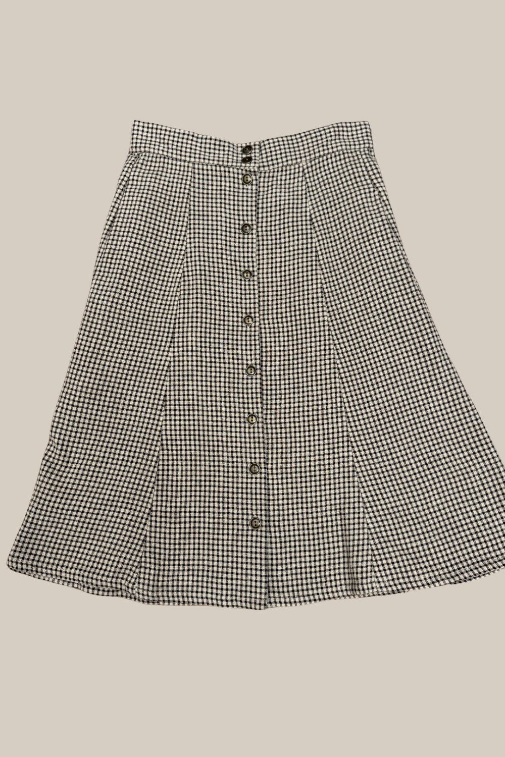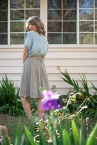 The Bae Skirt a bell shaped wardrobe staple. Features our signature brass buttons in a front closure. Extra inside button to keep the high waistline from pulling so the buttons won't gap on you. Elastic stretch on the back side for breathing and eating in comfort. Perfect knee length for the active femme. Princess seams with hidden side seam pockets.