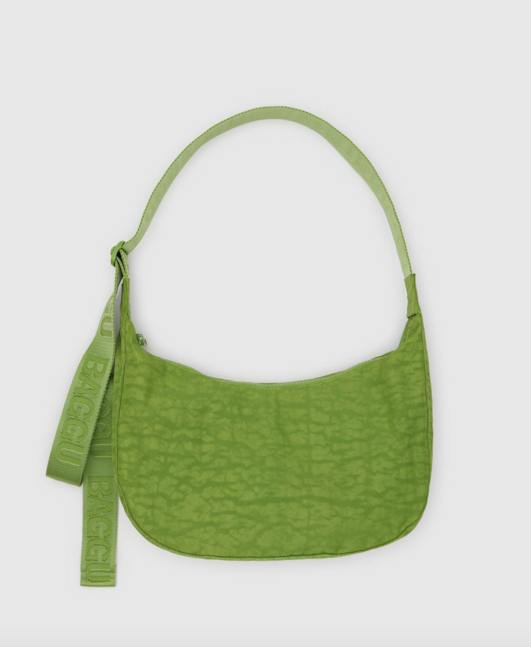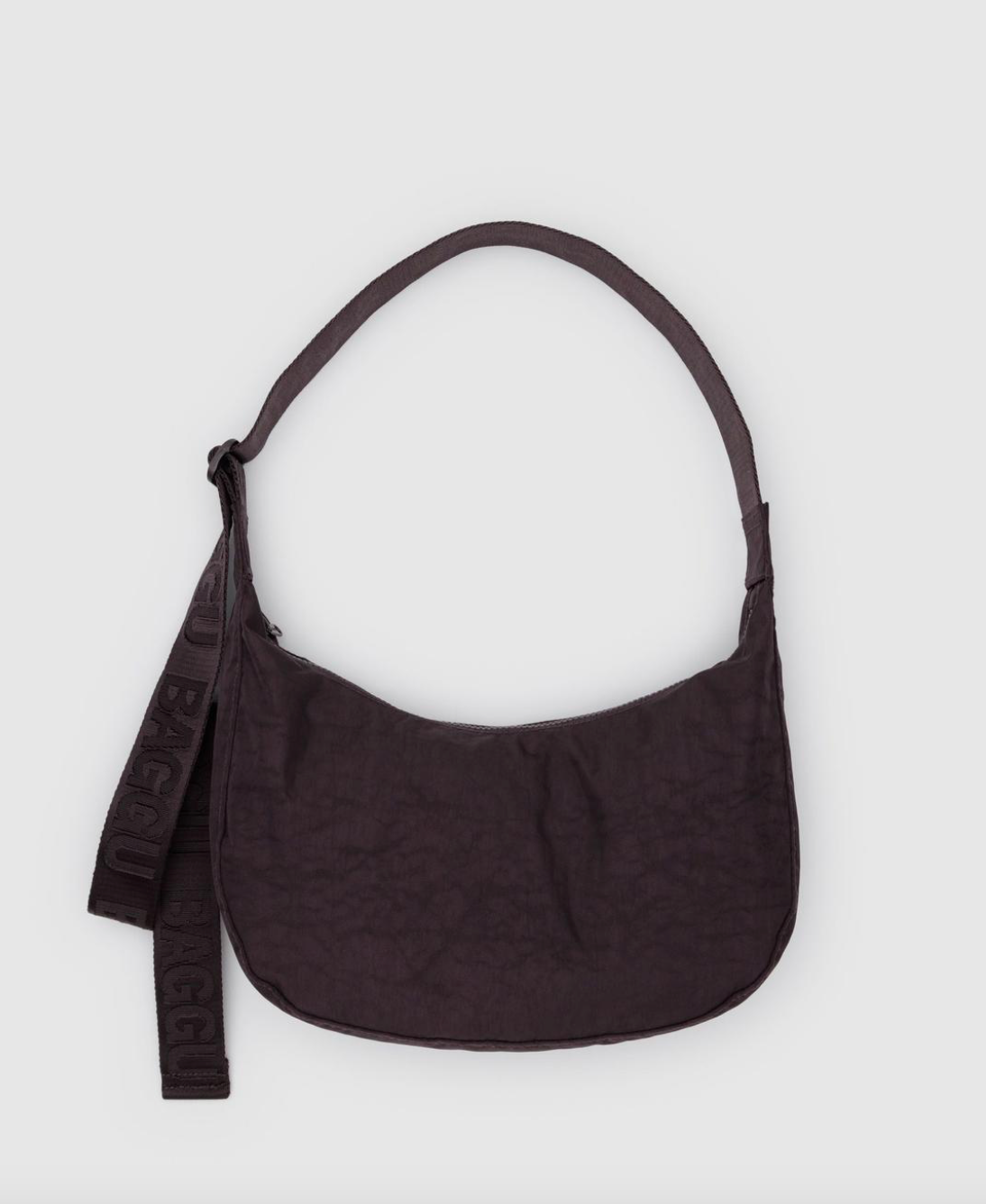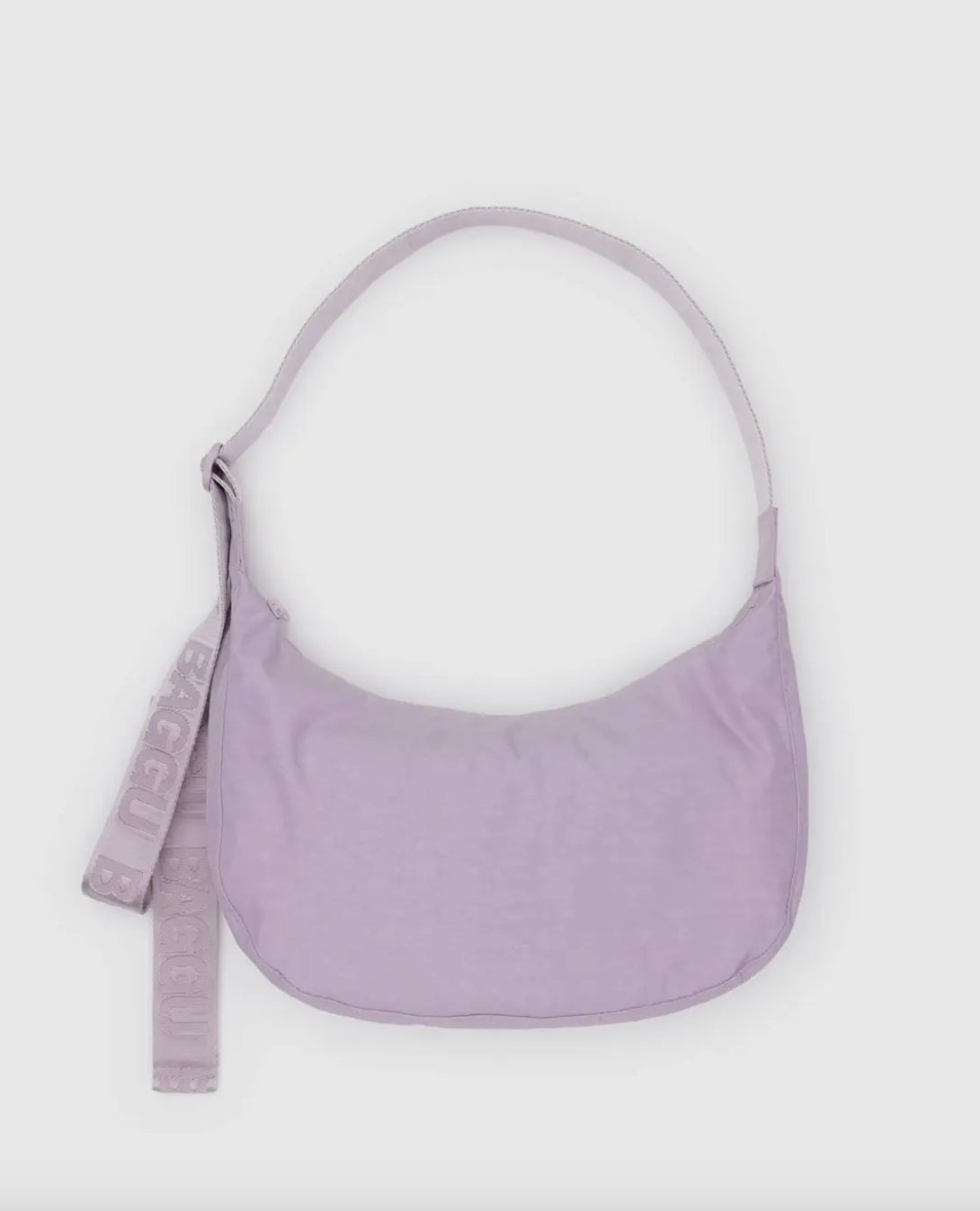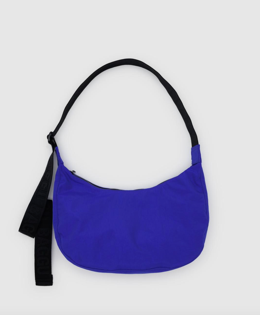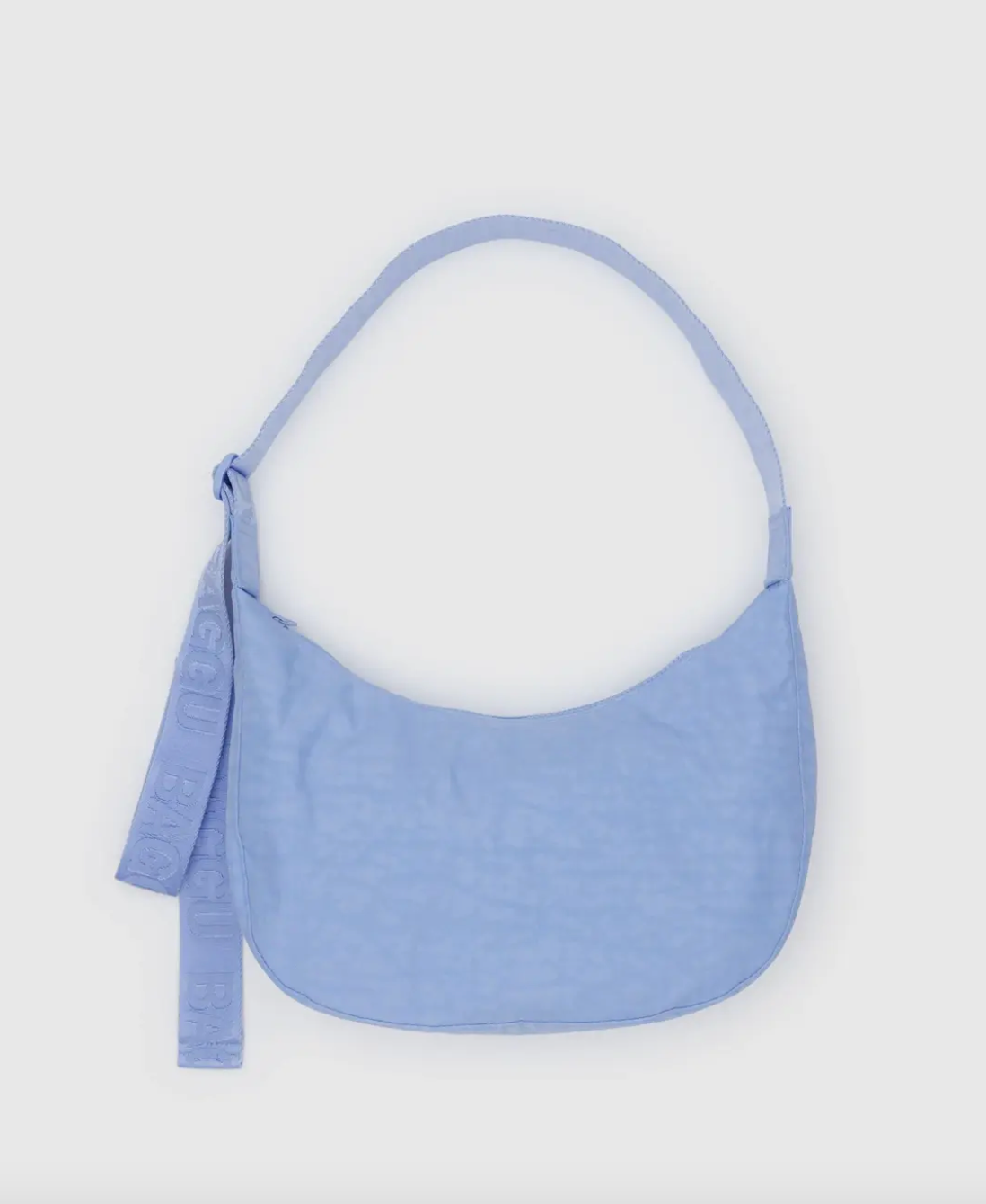 The Baggu Medium Nylon Crescent Bag is a versatile and stylish choice for carrying your essentials and more. With an adjustable tonal logo strap, it can be worn over the shoulder or crossbody for a hands-free experience. Made of recycled materials, it also features two interior pockets for easy organization. Machine washable and durable, it's perfect for everyday use.
