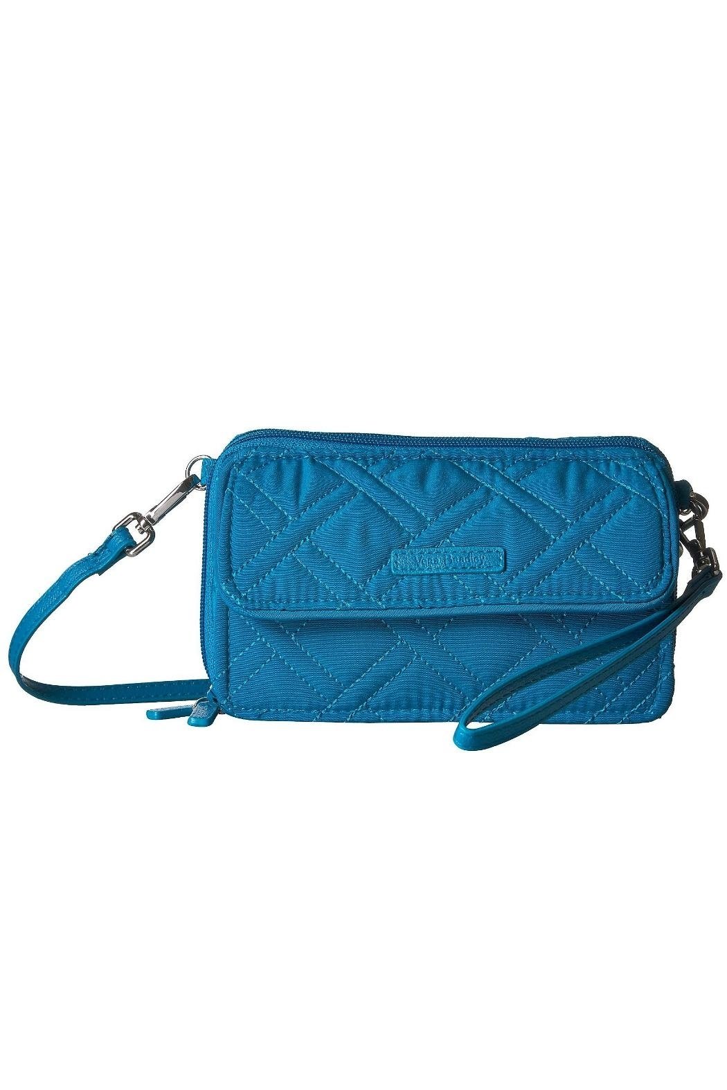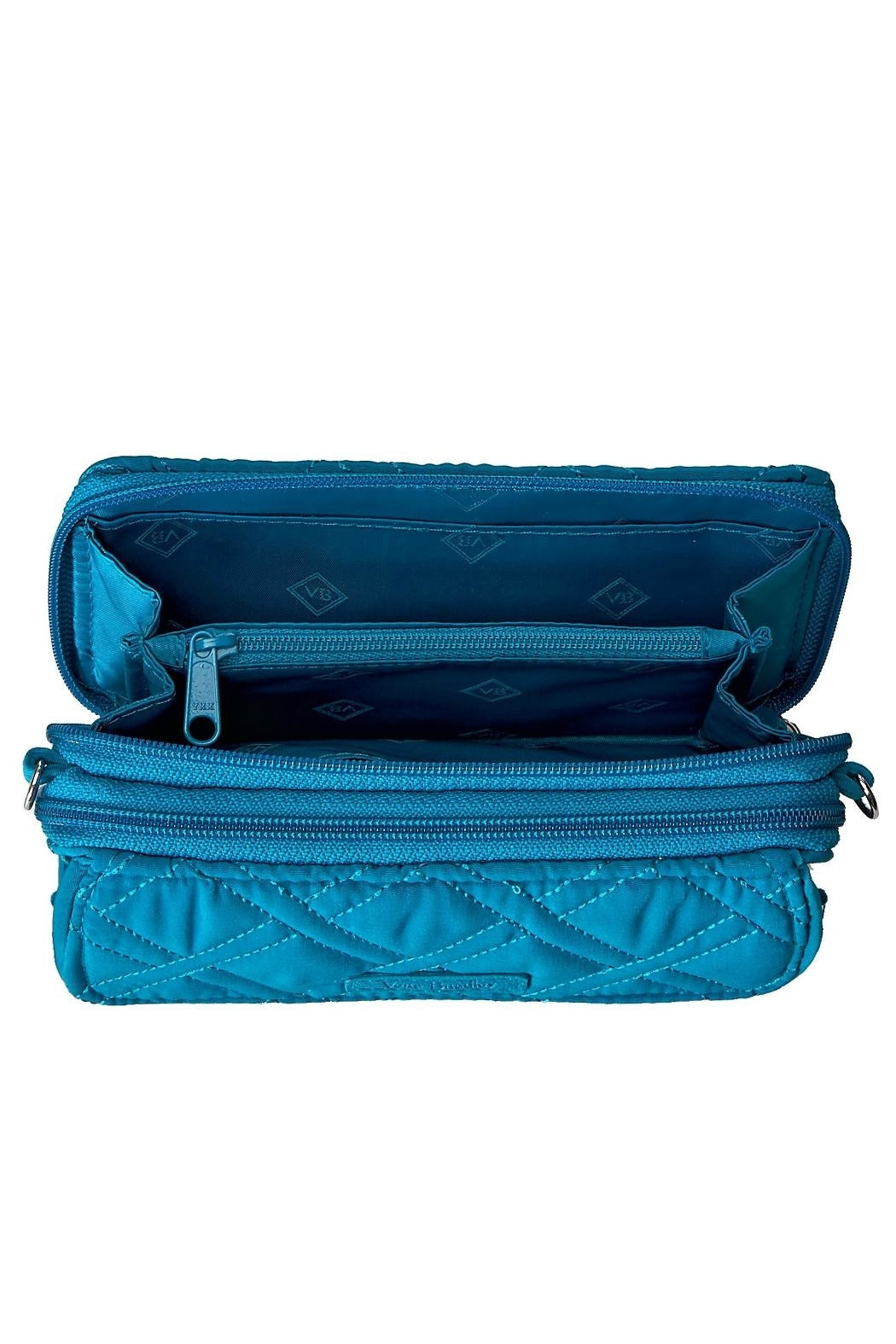 This is the Vera Bradley RFID All In One Crossbody in the color Bahama Bay. Protect your information with this RFID technology so you can have fun and stay fabulous. 3-WAY WEAR: This little bag is designed for hands free movement and the adjustable crossbody strap allows you to wear this bag across your body from your shoulder to opposite hip, or simply hung from one shoulder, and it comes with a wrist strap allowing you to wear it from your wrist as well. Magnetic snap closure on the front exterior compartment which holds a phone up to 6". One zippered compartment has a built-in wallet which includes a large bill pocket, 8 credit card slips, 3 more slip pockets, and an ID window. The back zippered compartment has 2 bill pockets, two pleated pockets and a zippered coin pocket. Find other Bahama Bay bags and accessories on the Mimi's Gift Gallery boutique page.