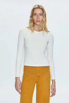 Fitted lightweight rib knit tee with an elevated, wardrobe essential sensibility. Designed with a crewneck, long sleeves, and a hem length that grazes the waistband for a sleek silhouette.