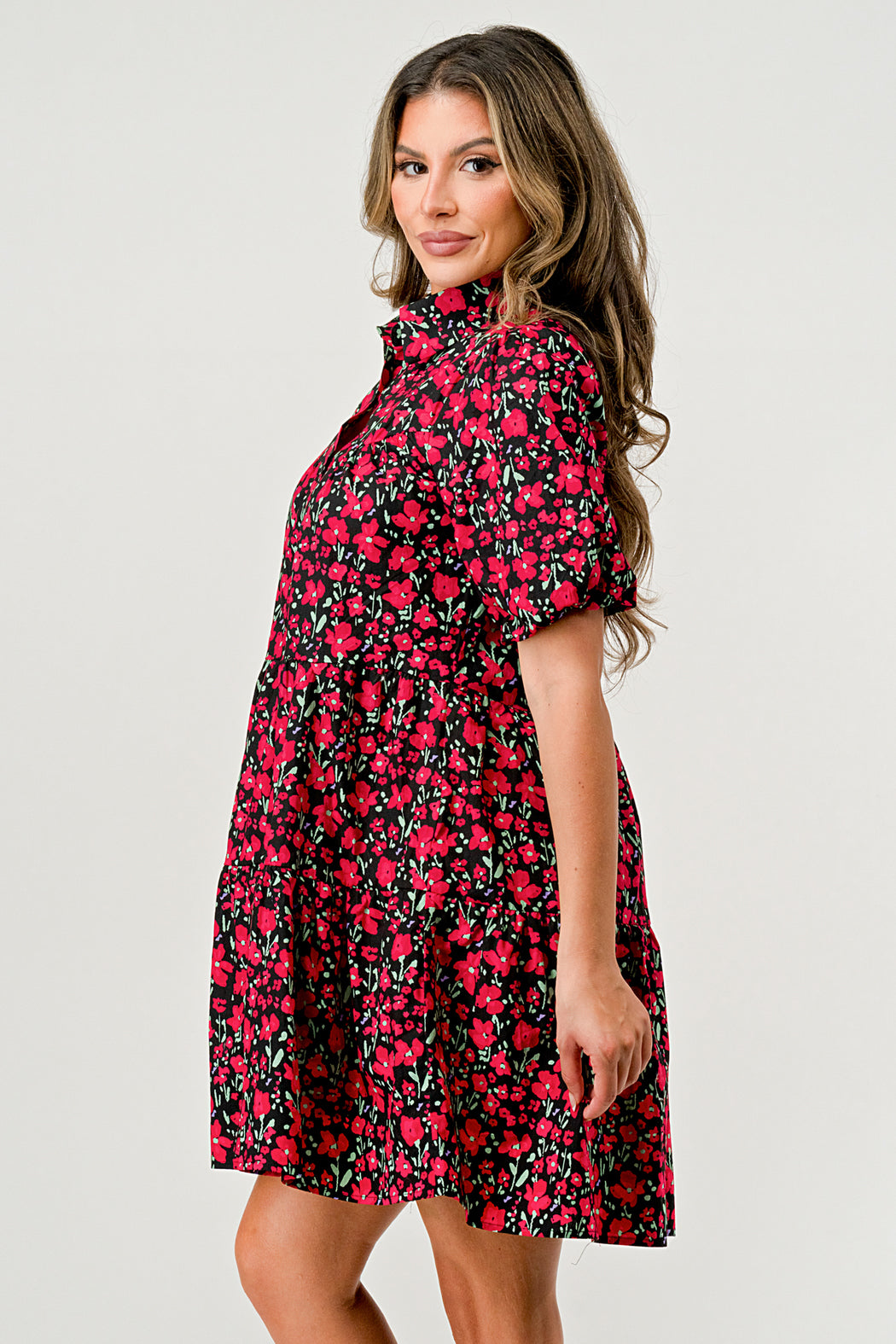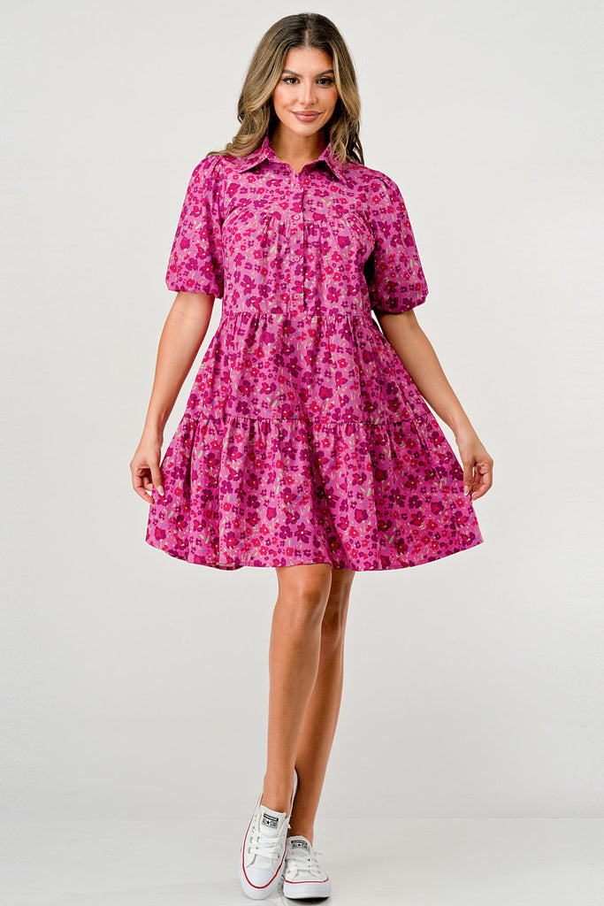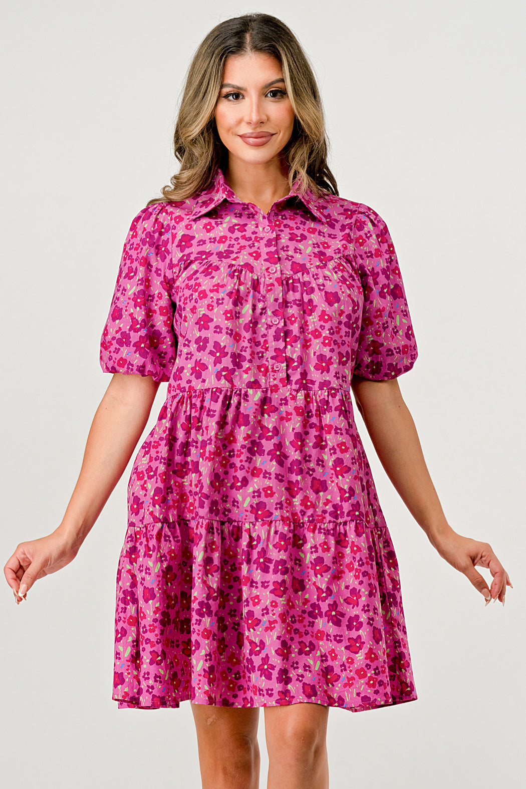Balloon sleeve collar and button front tiered A-line dress with poplin floral print