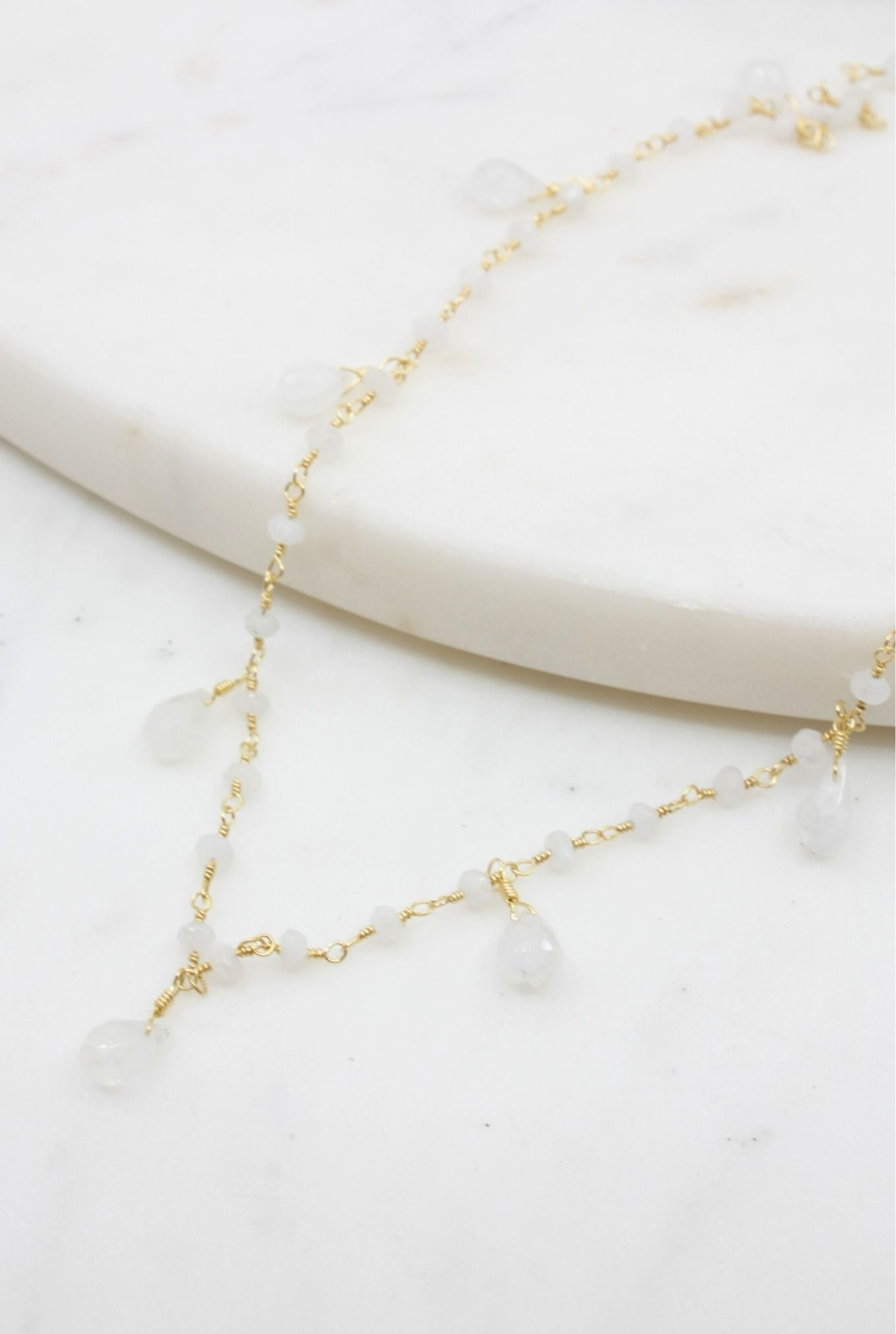 A vermeil and moonstone beaded chain with 9 moonstone teardrops in 1" increments. This necklace is great for layering.