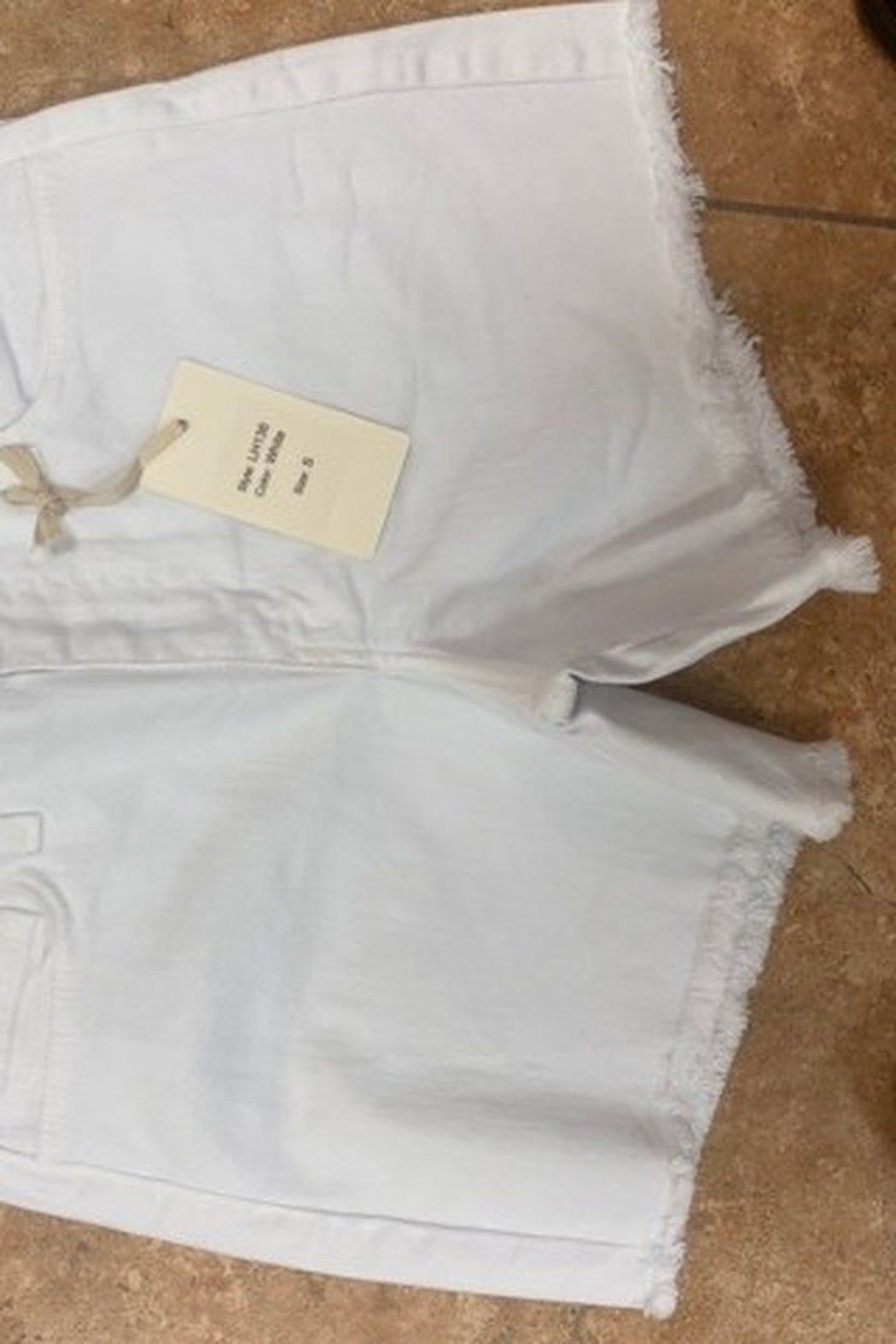 These denim shorts have a zipper and button closure, two front pockets and two back pockets and they have an unfinished hem line. 9 1/2" Rise; 5 1/2 " Inseam