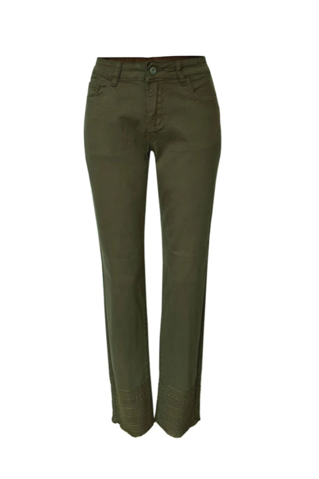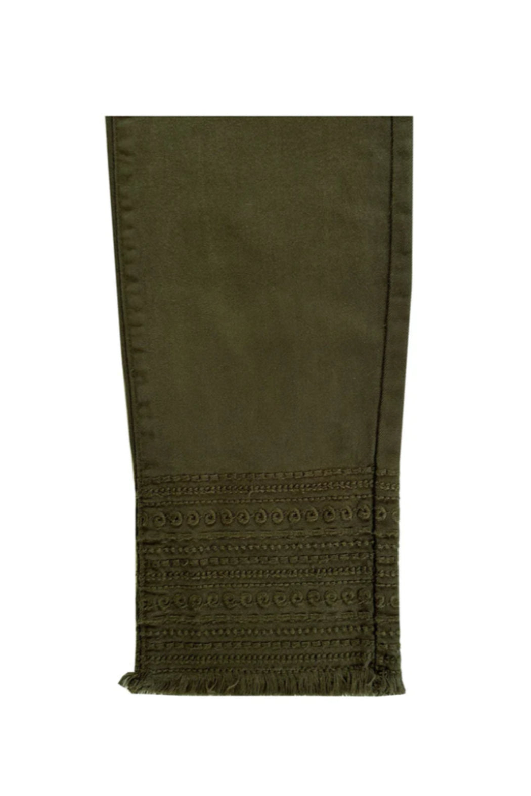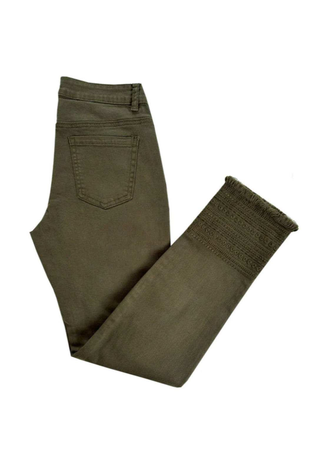 Tasteful boho detailing trims the cuffs of these super soft mid rise paints. Stretch makes these not your average cotton blend. These can be worn four seasons and pair well with our matching Perfidia Jackets for column dressing appeal.