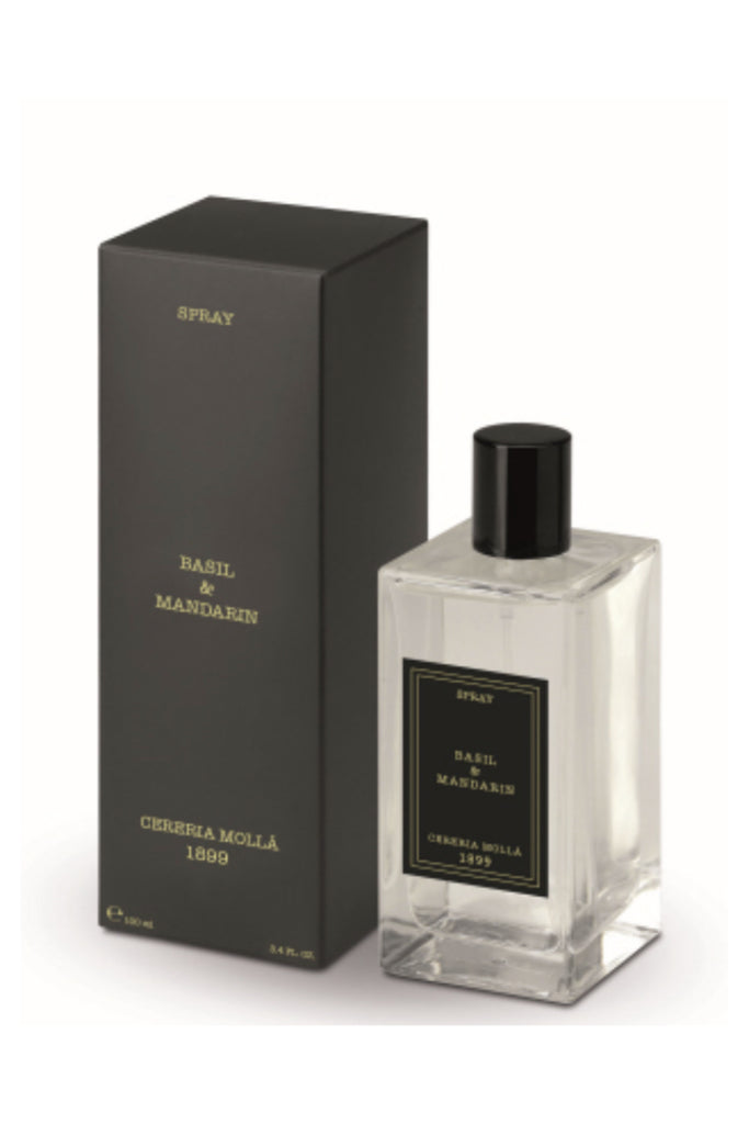 Cereria Molla Basil & Mandarin Rooms Spray: fragrance that provides an initial energetic chord mix of the citrus notes of Lemon, Lima and Tangerine, accompanied by a predominant floral aroma of Ivy and white Jasmine, with a seductive finish thanks to its woody oriental notes.