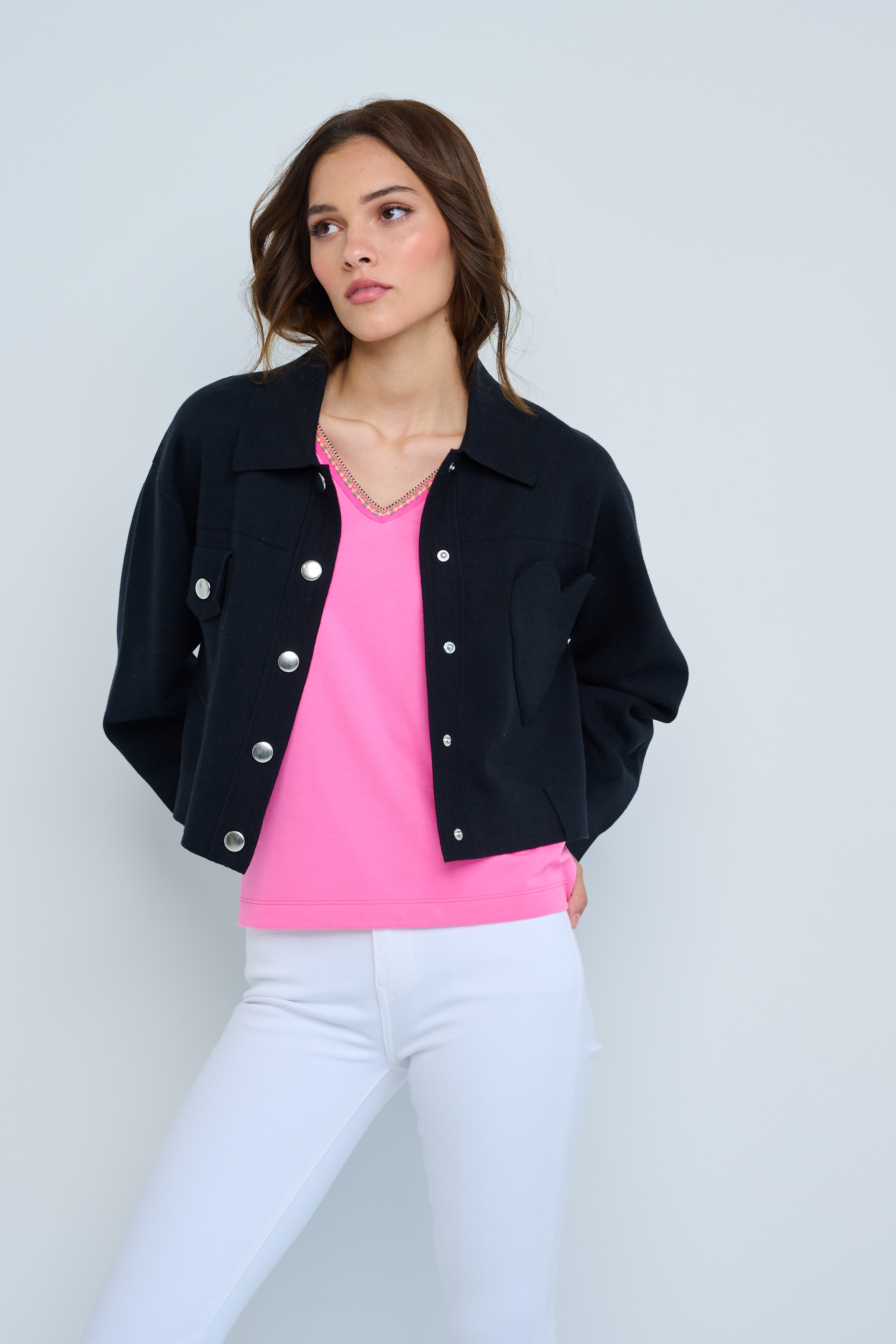 This jacket is more than just a pretty face. The stretchy cotton blend ensures you'll stay cozy and confident, while the silver snap front and heart-shaped pocket add eye-catching style. Whether you're grabbing coffee with friends or heading to the office, the Beat Goes On Jacket will have you looking and feeling your best.