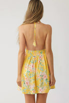 A breezy mini dress that features a back tassel detail, front v-neckline and allover print.