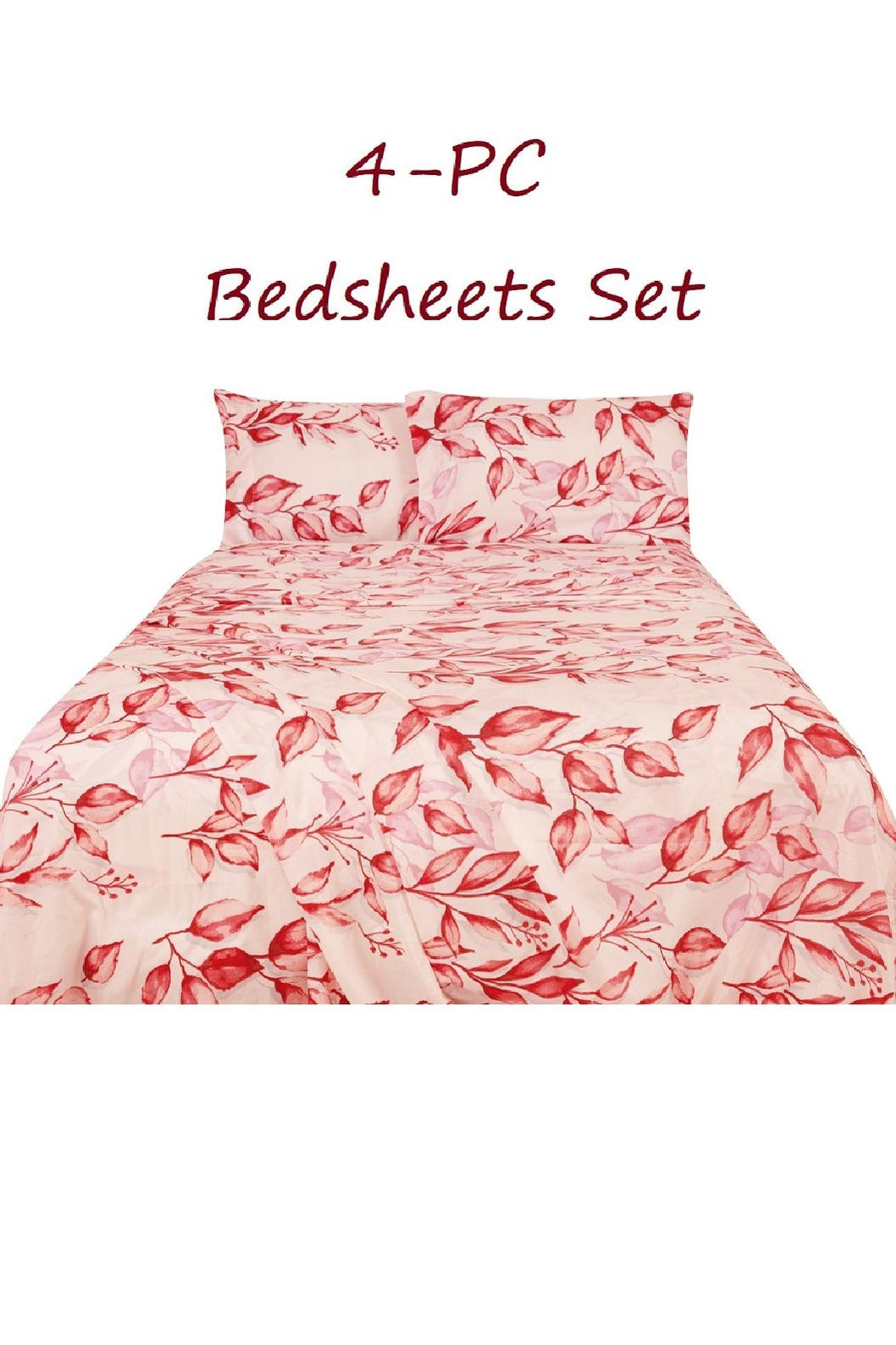Bed Sheets Set 4-Pc Light Red Base With Red Leaves Full Queen King Size