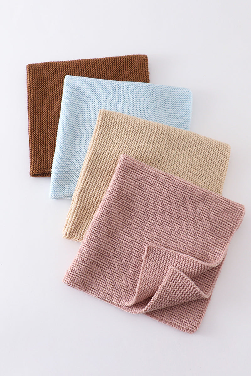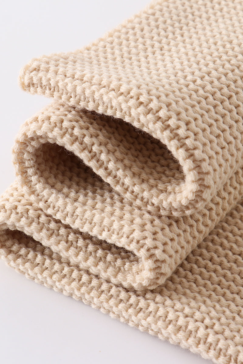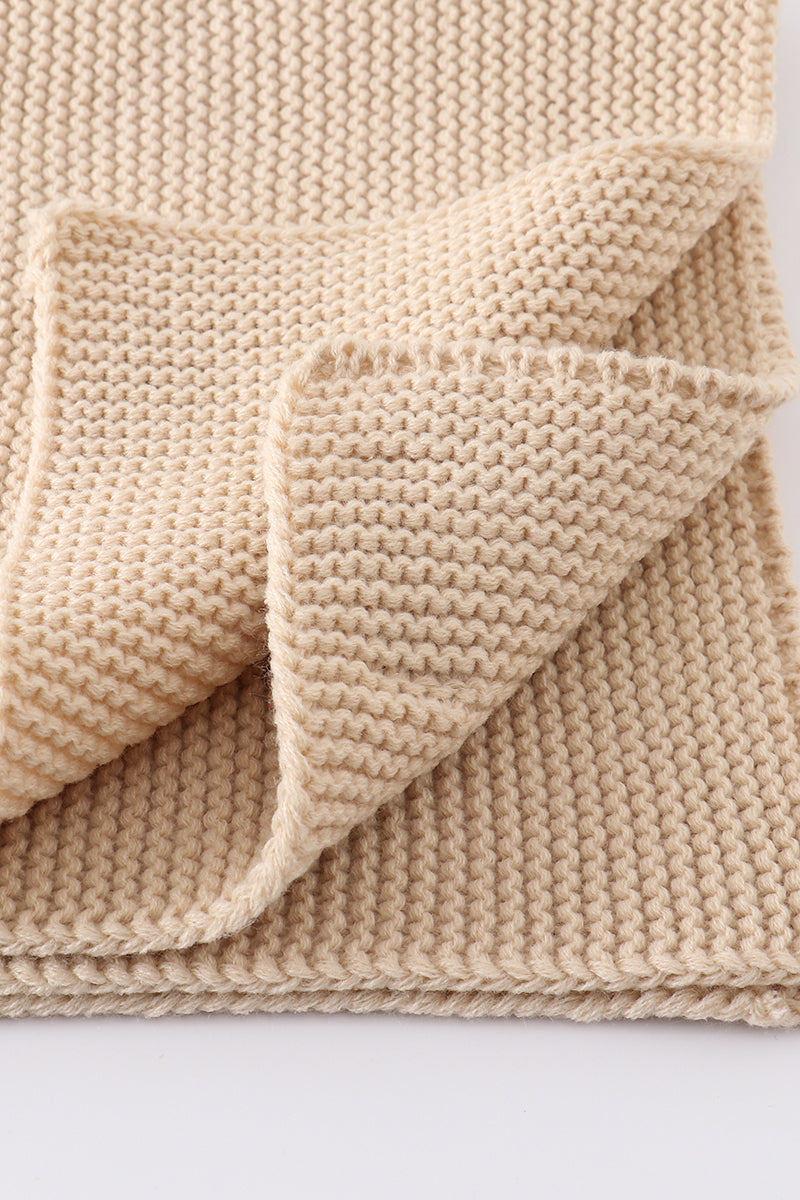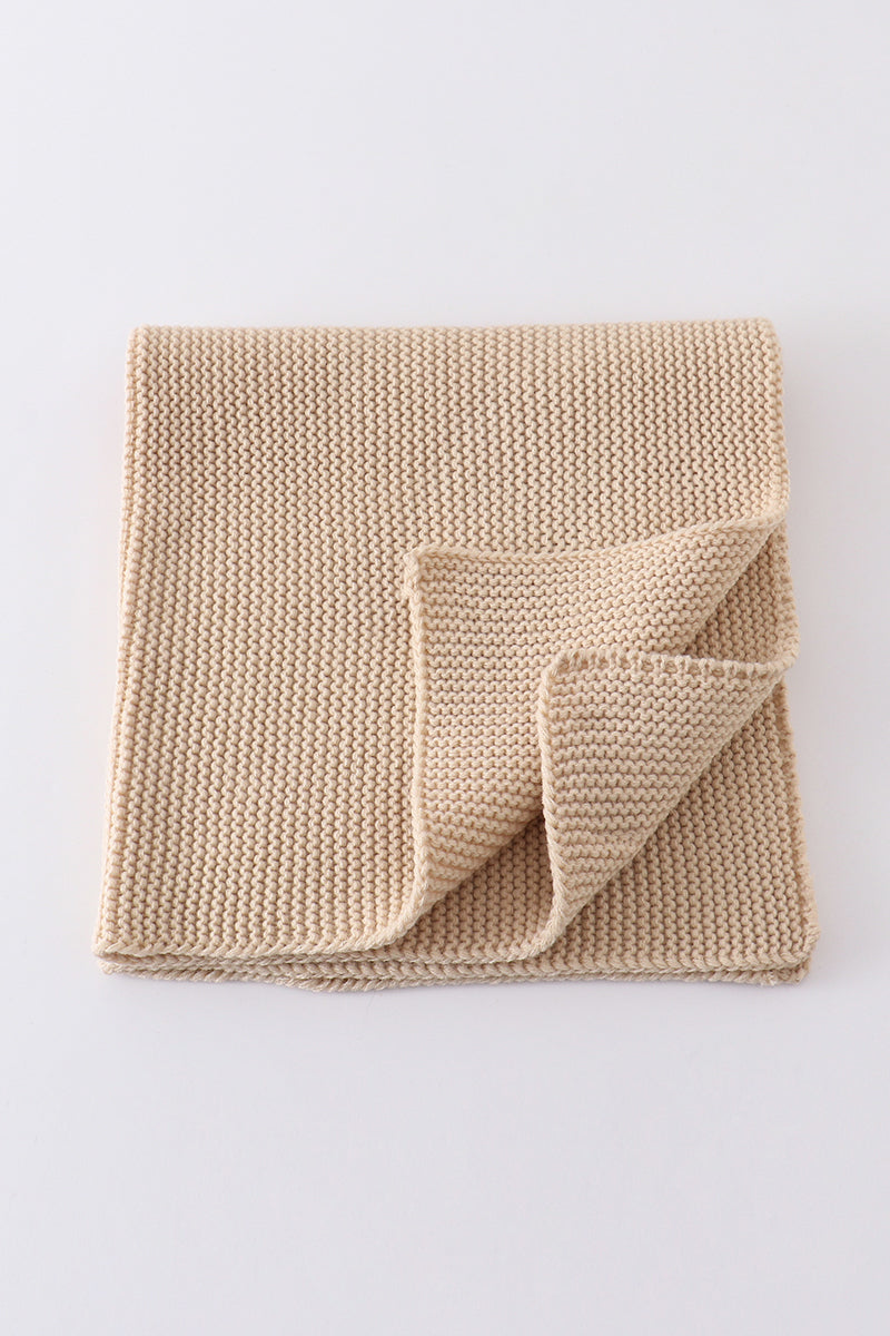 "Cuddle up your little one in our soft, beige knitted blanket. Perfect for snuggles, naps, and stroller rides, this blanket will keep your baby warm and cozy. No more fussing with scratchy or uncomfortable fabrics, our knitted blanket is gentle on delicate skin."