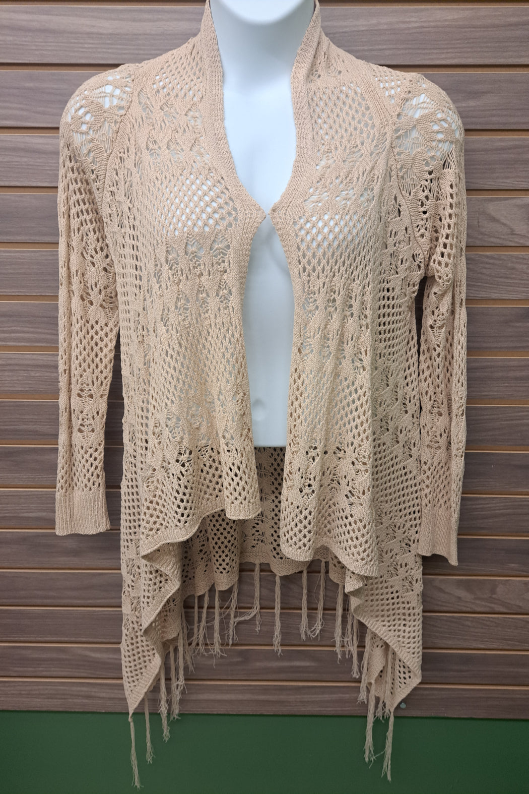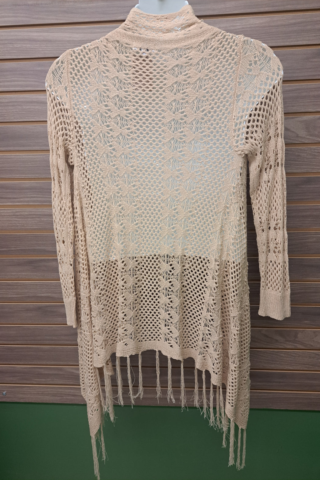 Beige crocheted open sweater with fringe