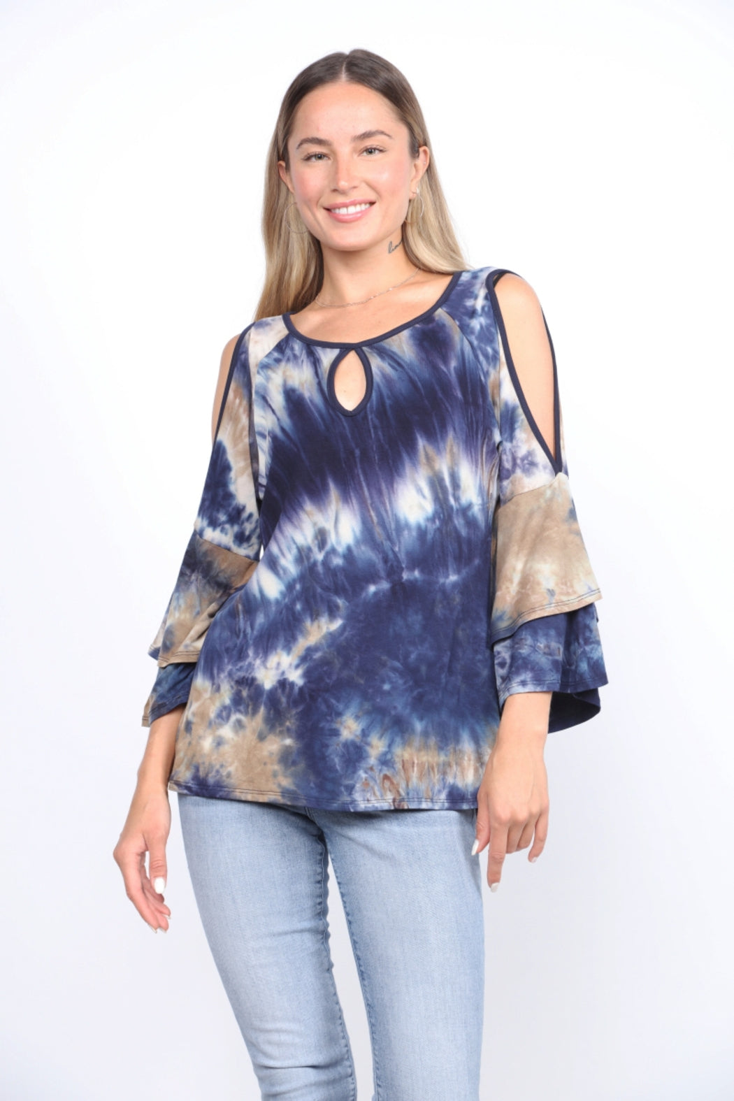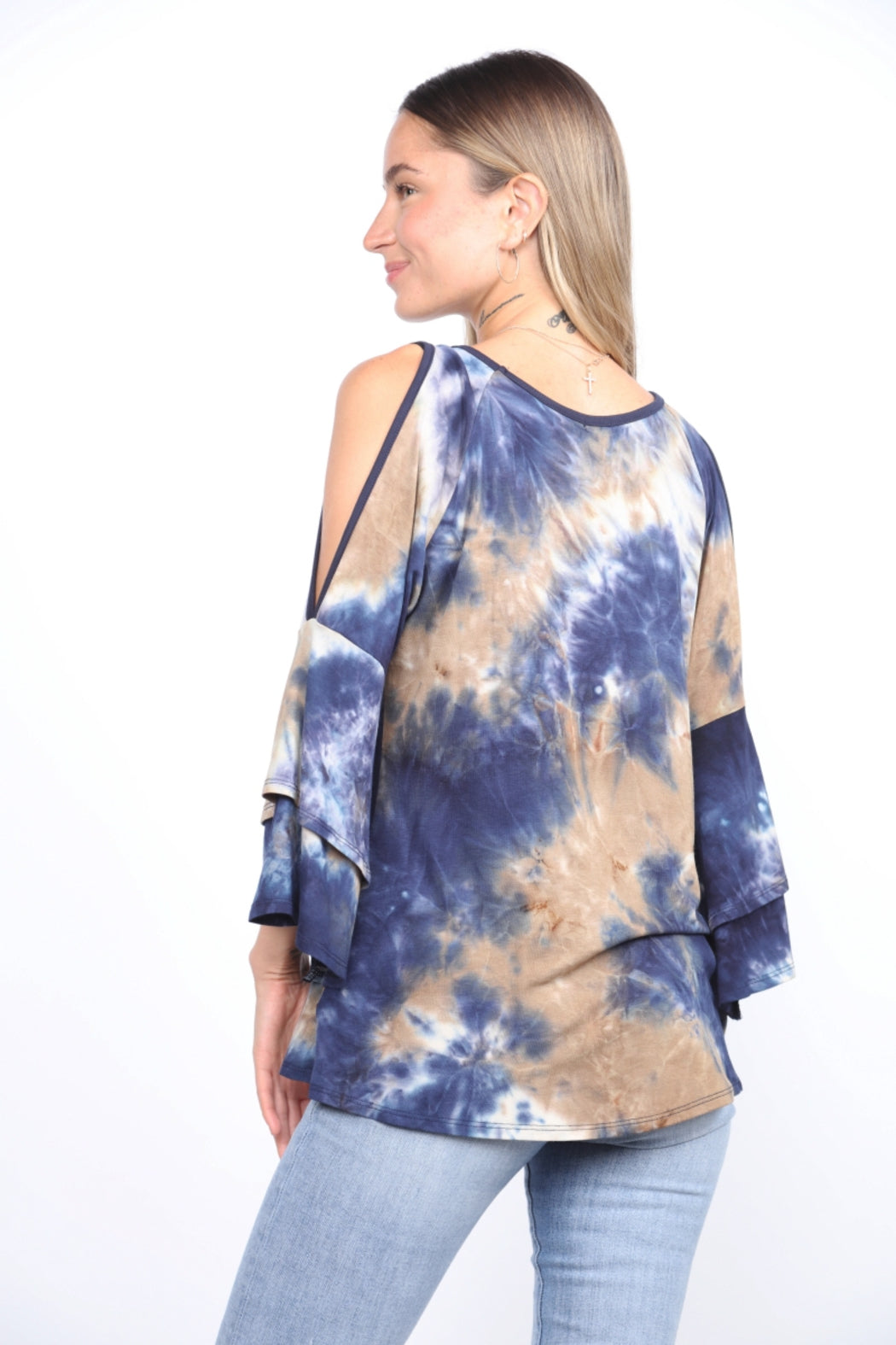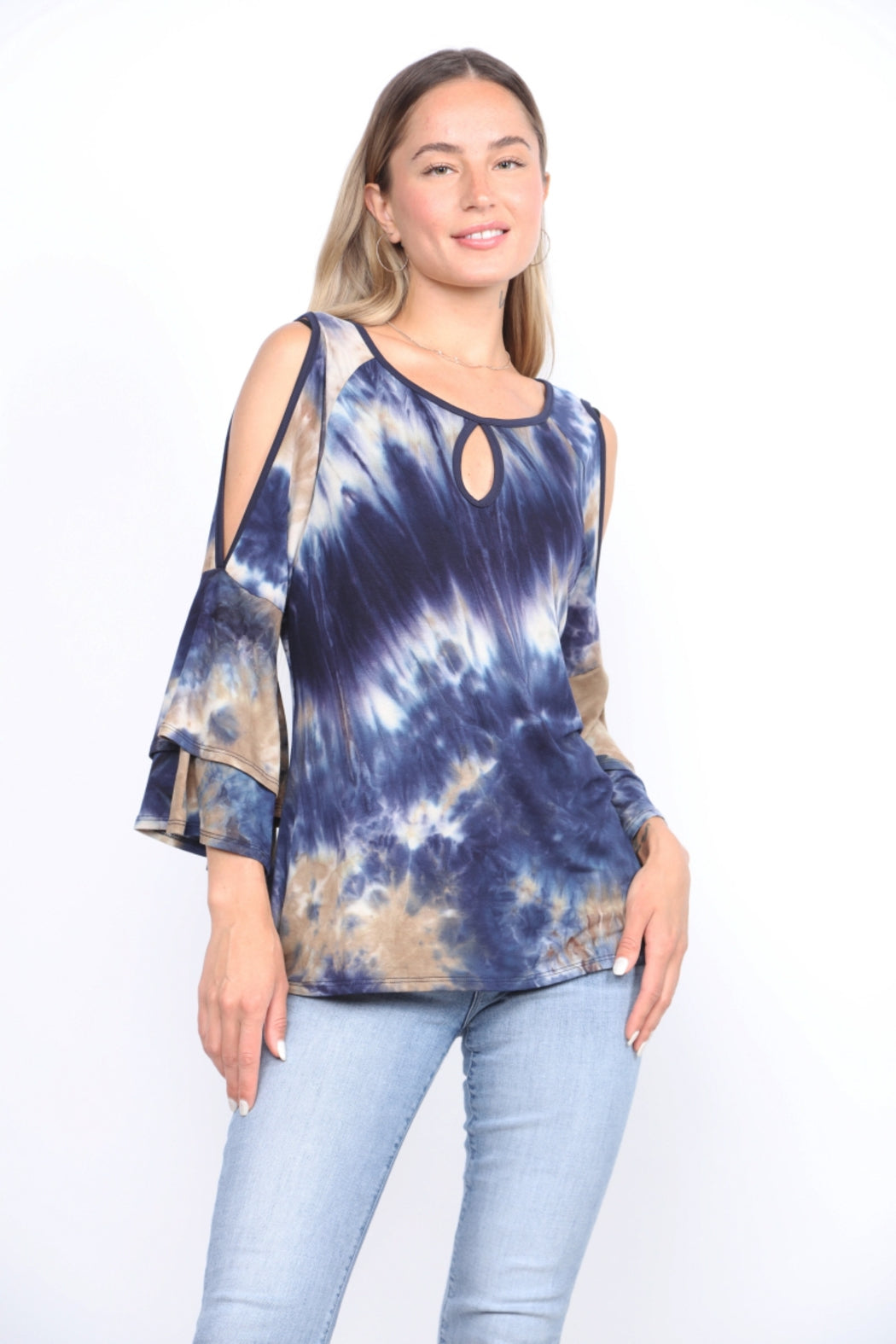 This Bell sleeve tie dye top with keyhole is perfect for a fashion-forward and stylish look. Featuring a unique and eye-catching tie dye finish, its bell sleeves add a touch of elegance. The keyhole detailing on the neckline provides an added dimension of sophistication.