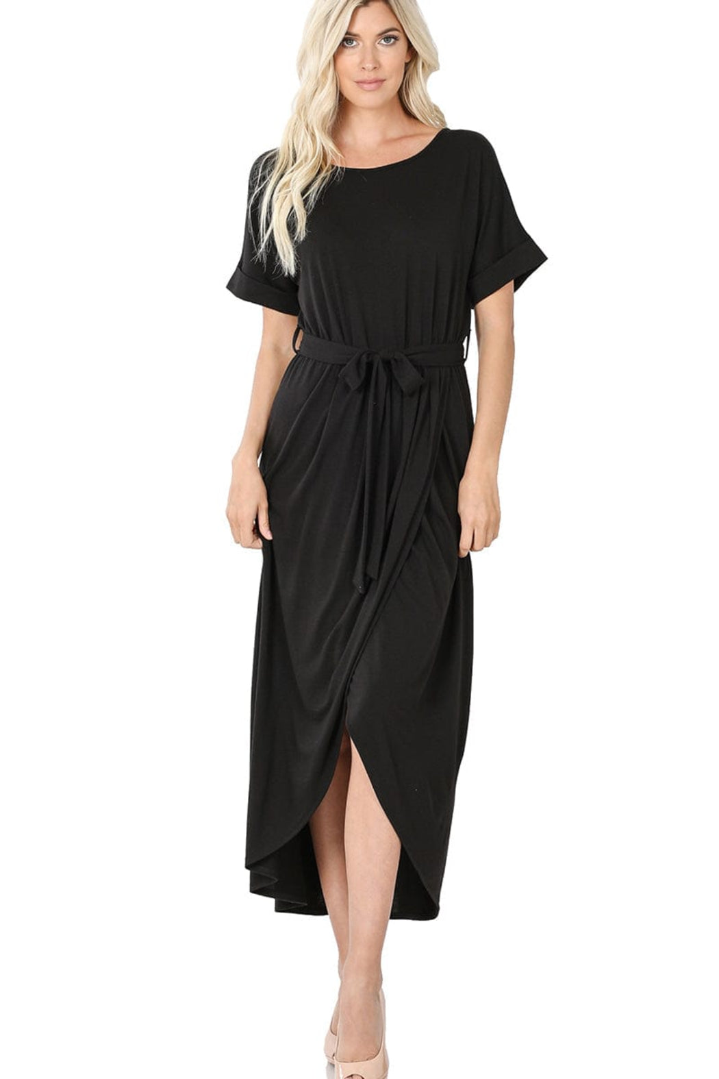 This Belted Short Sleeve Tulip Dress is perfect for any occasion. The classic belted design gives you a sharp look, and the lightweight fabric is comfortable and breathable, making it ideal for summer days. Enjoy a flattering fit and timeless style with this fashion staple.