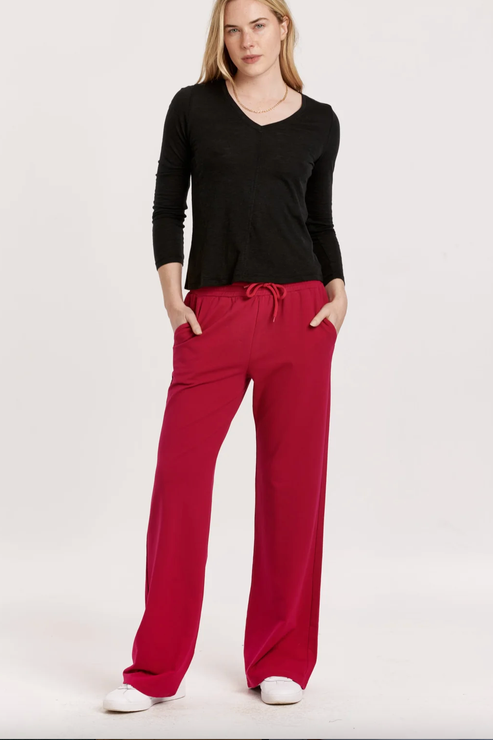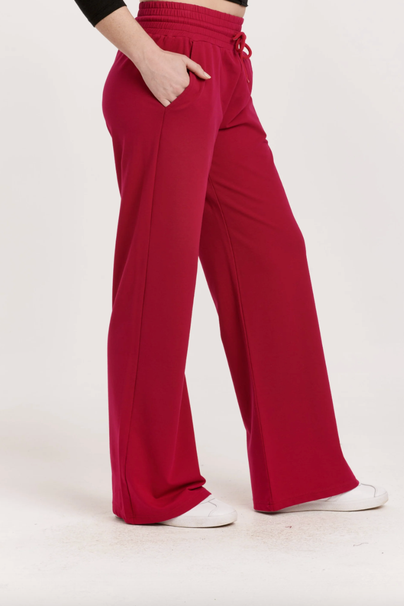 Wide leg pant, relaxed cut with slant pockets & drawcord elastic waist in french terry. Solid color knit on relaxed fit. Timeless treasure! Looking ever relaxed & comfy, so loved that you'll never swap it out.
