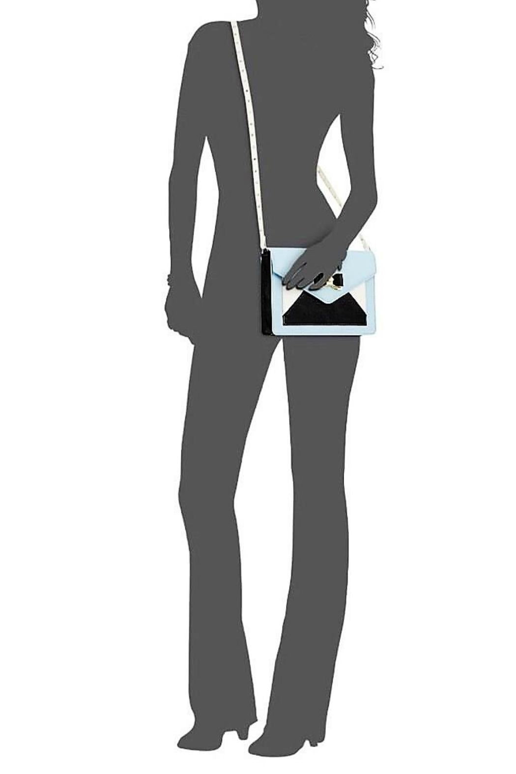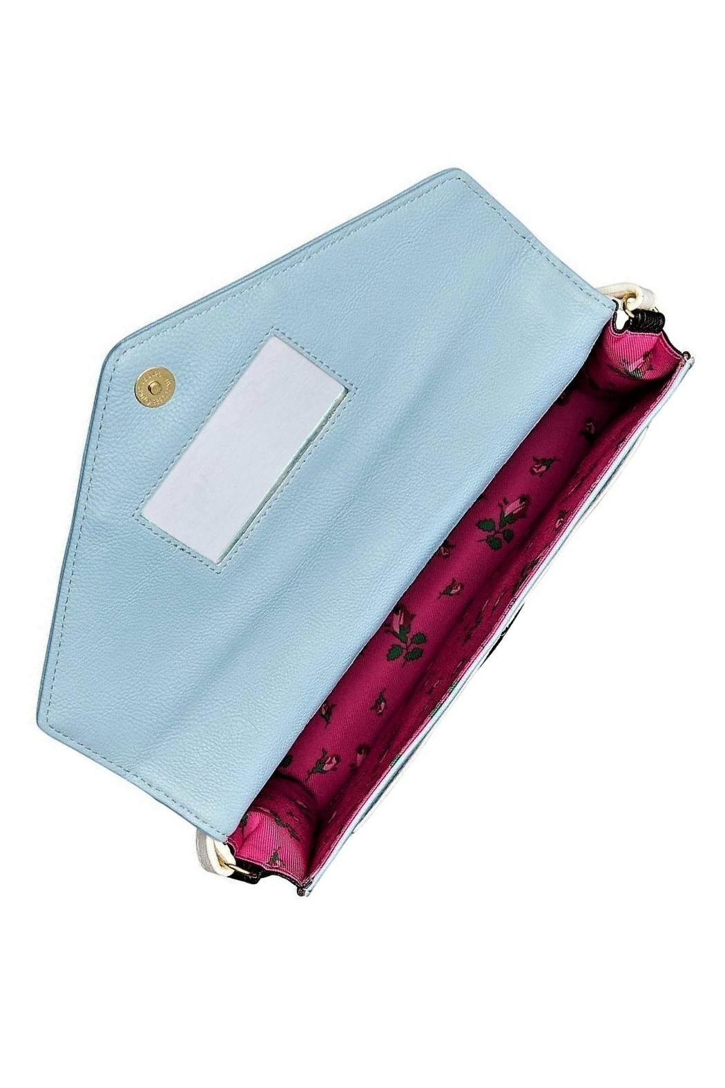 Meet the Betsey Johnson Crossbody Envelope in Blue! Use the strap if you need a shoulder or crossbody bag; tuck it inside if you need a clutch! Black, white and pale blue exterior colors. Magnetic snap flap closure, with mirror inside flap. Slip pocket under flap on bag front. Pink rosebud Betsey Johnson fabric lining. 1/2" wide strap in white accented with pearl, gold, & heart shape studs. Find other Betsey Johnson bags and accessories on the Mimi's Gift Gallery boutique page.