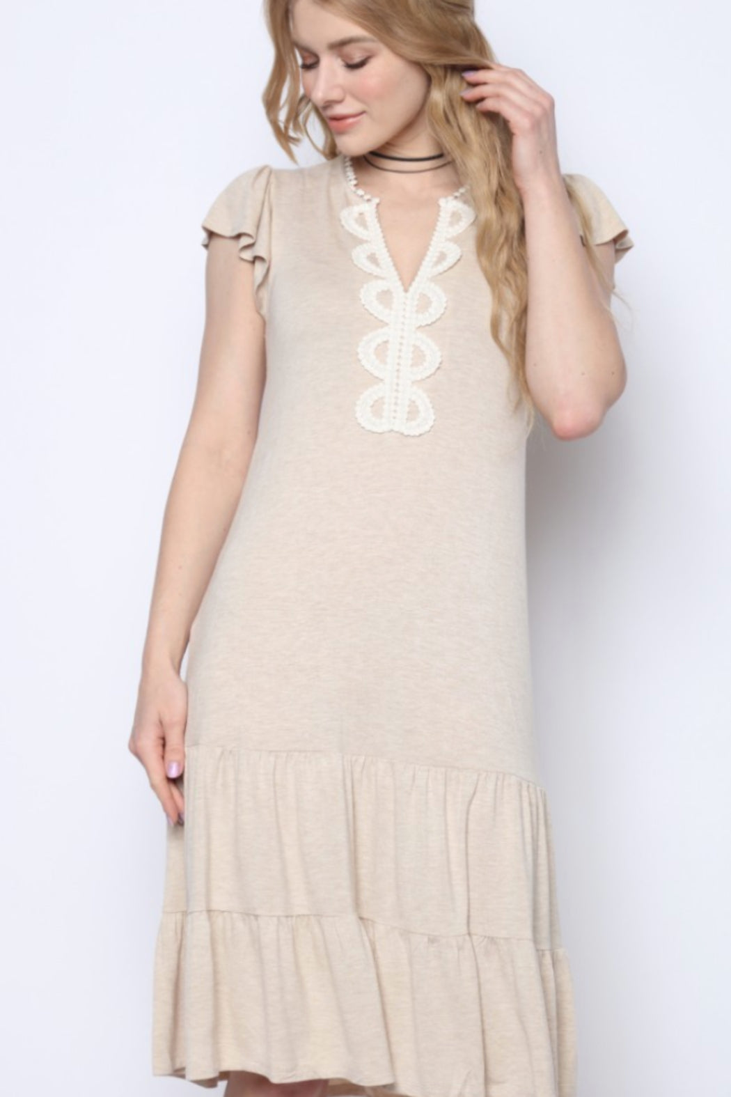 Tiered midi dress with lace trim accent