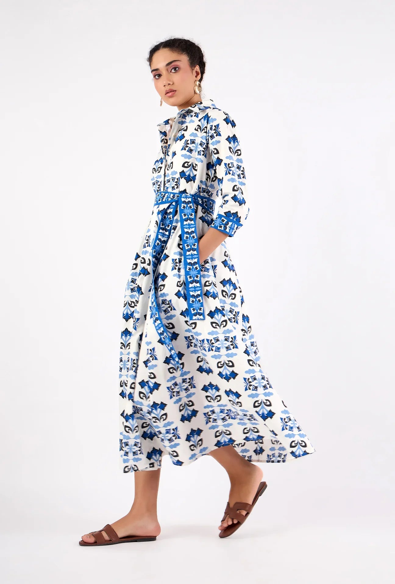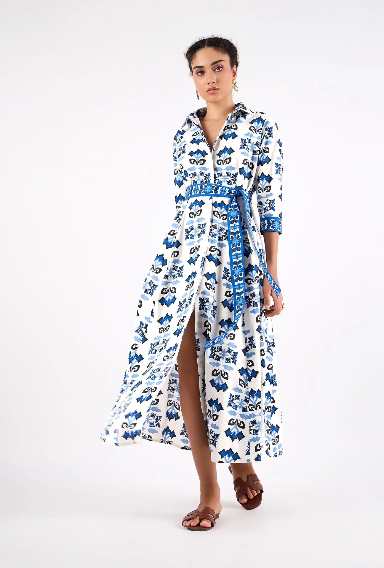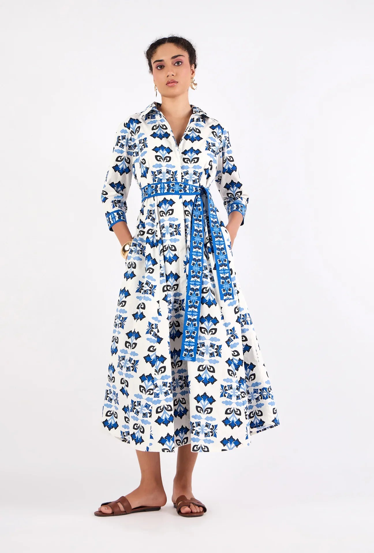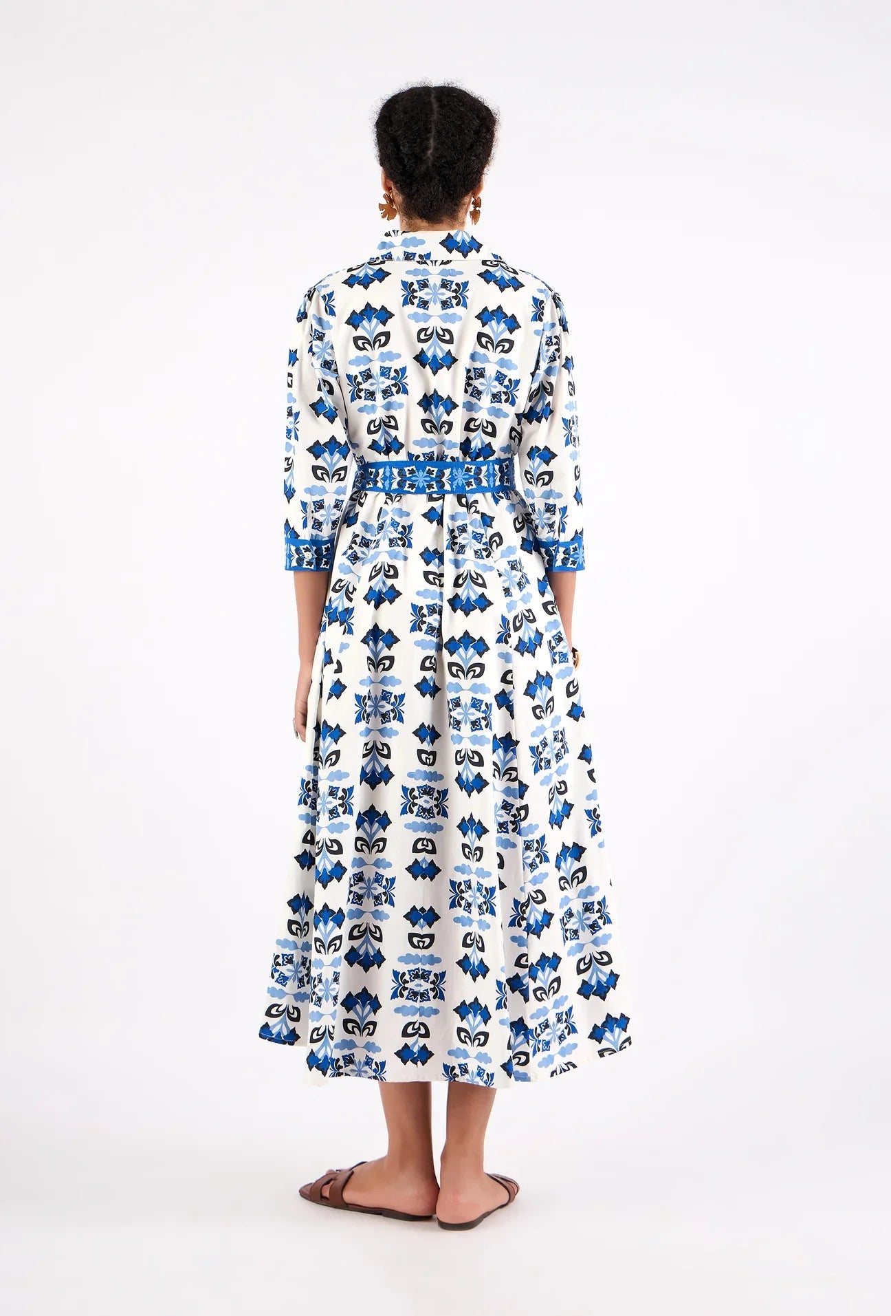 Emily is a classic shirt dress with an elegant ease and a flattering, effortless silhouette. The dress buttons down at the front and features 3/4 sleeves. Emily is crafted from breathable premium Cotton Poplin. Taking cues from the spectacular butterflies native to the Pyrenees, this design uses simple flower and butterfly motifs to create a captivating geometric pattern.