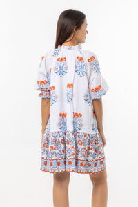 This effortlessly breezy mid-sleeve dress is crafted from the highest quality cotton is seasonal must-have, featuring a relaxed, flattering fit and a stunning mix of blue and orange prints. Chic yet easygoing, it’s perfect for warm, endless summer days. Wear it as a dress or a stylish cover-up for a versatile, carefree look.