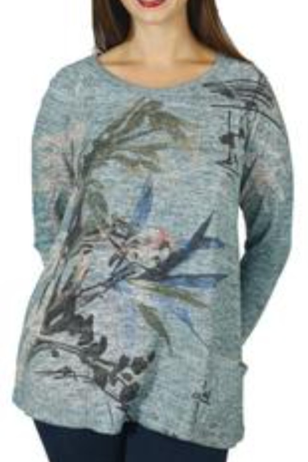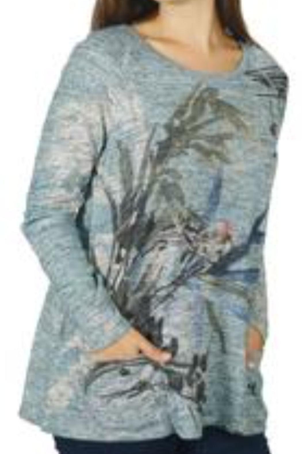 This lightweight sweater is made out of a soft and fuzzy two tone knit imprinted with an attractive artwork. Not scratchy at all thanks to the blend of rayon and cotton fibers. Perfect on its own as a light sweater, but roomy enough for layering. Raglan sleeves for ease of movement.