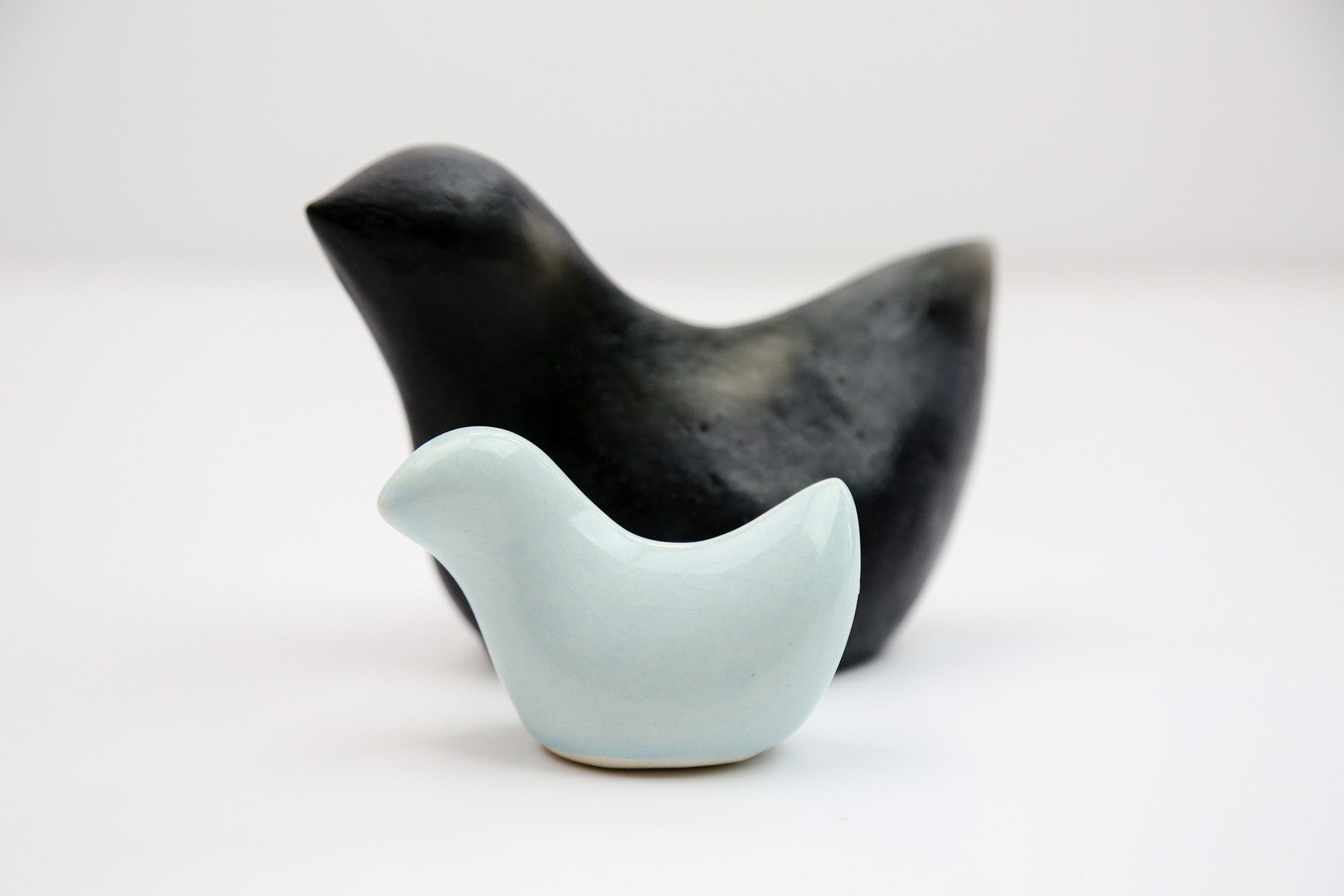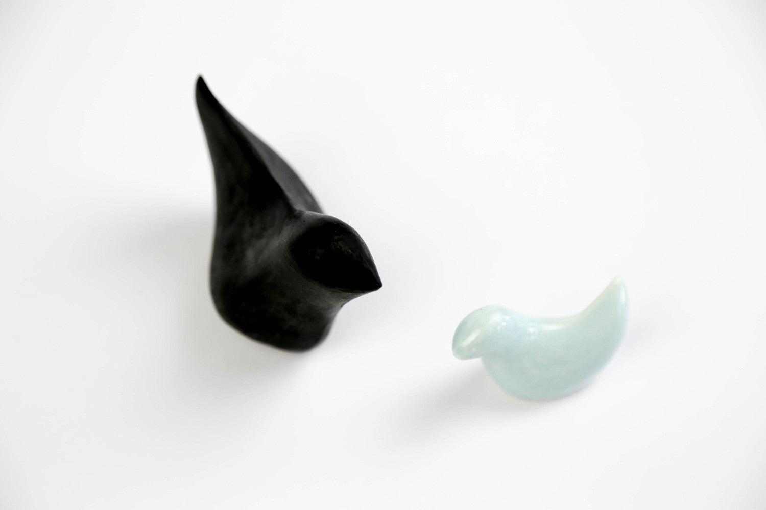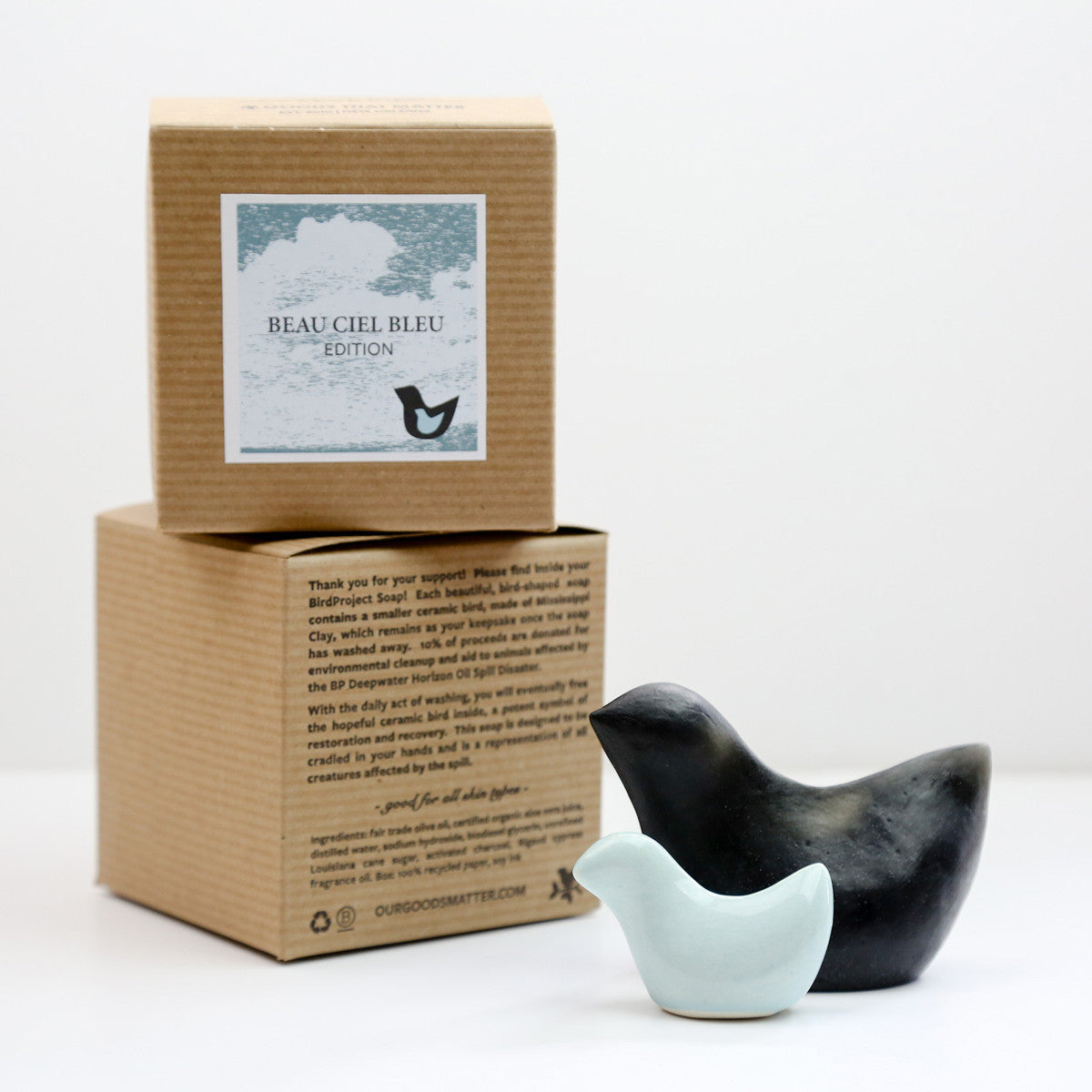 Each black, bird-shaped soap contains a blue, ceramic bird, handmade from Louisiana Clay, which remains as a keepsake once the outer soap has washed away.