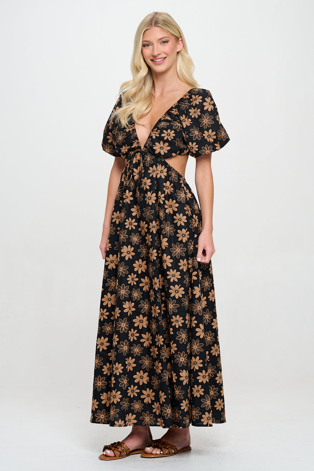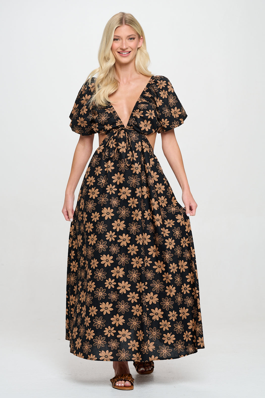 Step into bohemian elegance with this striking cut-out maxi dress. The dress showcases a deep V-neckline and dramatic puff sleeves, giving it a vintage-inspired flair. The rich black fabric is adorned with a unique all-over floral print in earthy tones, making it a standout piece for any wardrobe. The side cut-outs add a modern twist, offering a flattering and fashion-forward silhouette. Perfect for outdoor events, casual gatherings, or festival wear, this dress combines comfort and style in one chic package.