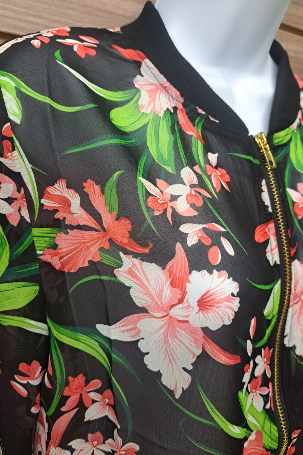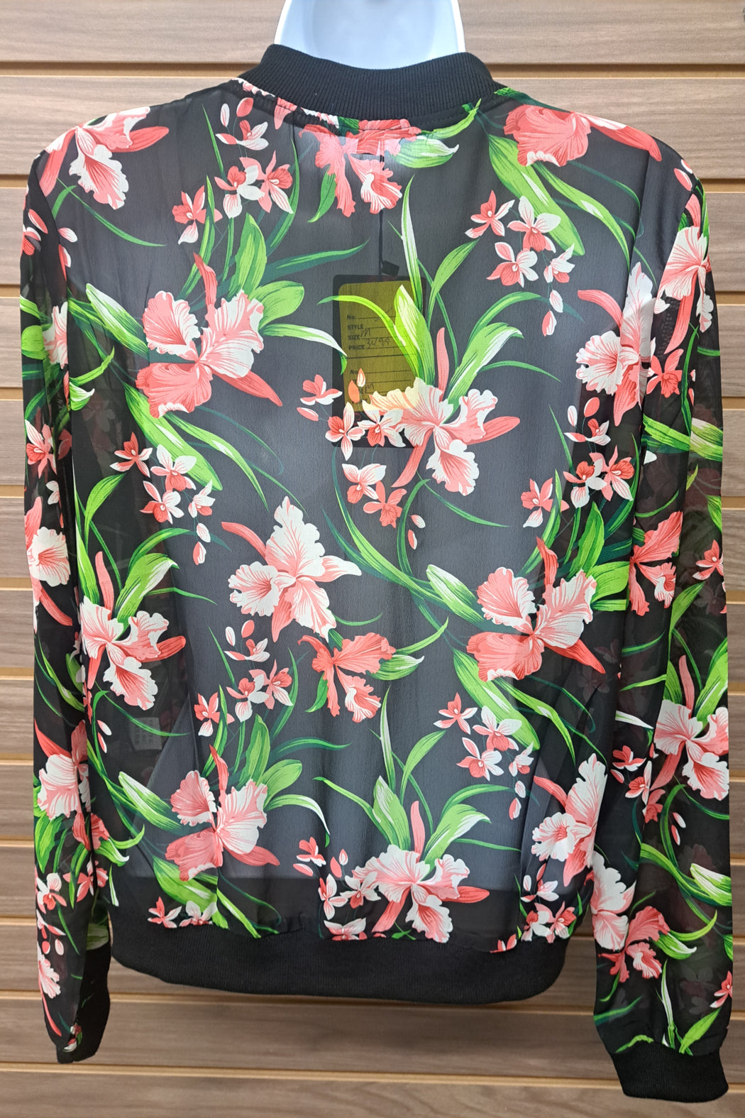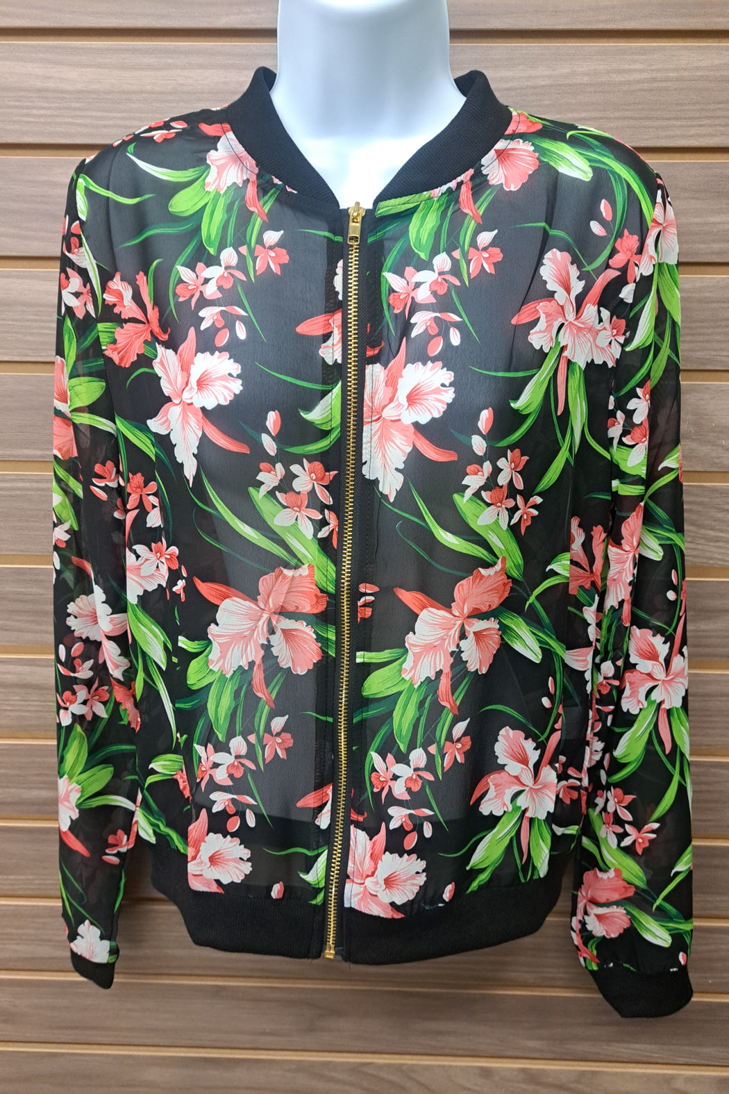 This stylish Black Floral Jacket is made of 100% poly material and features a zip up closure. The sheer, floral fabric is designed to make a fashion statement while also providing comfort. Perfect for adding a bit of flair to your everyday wardrobe.