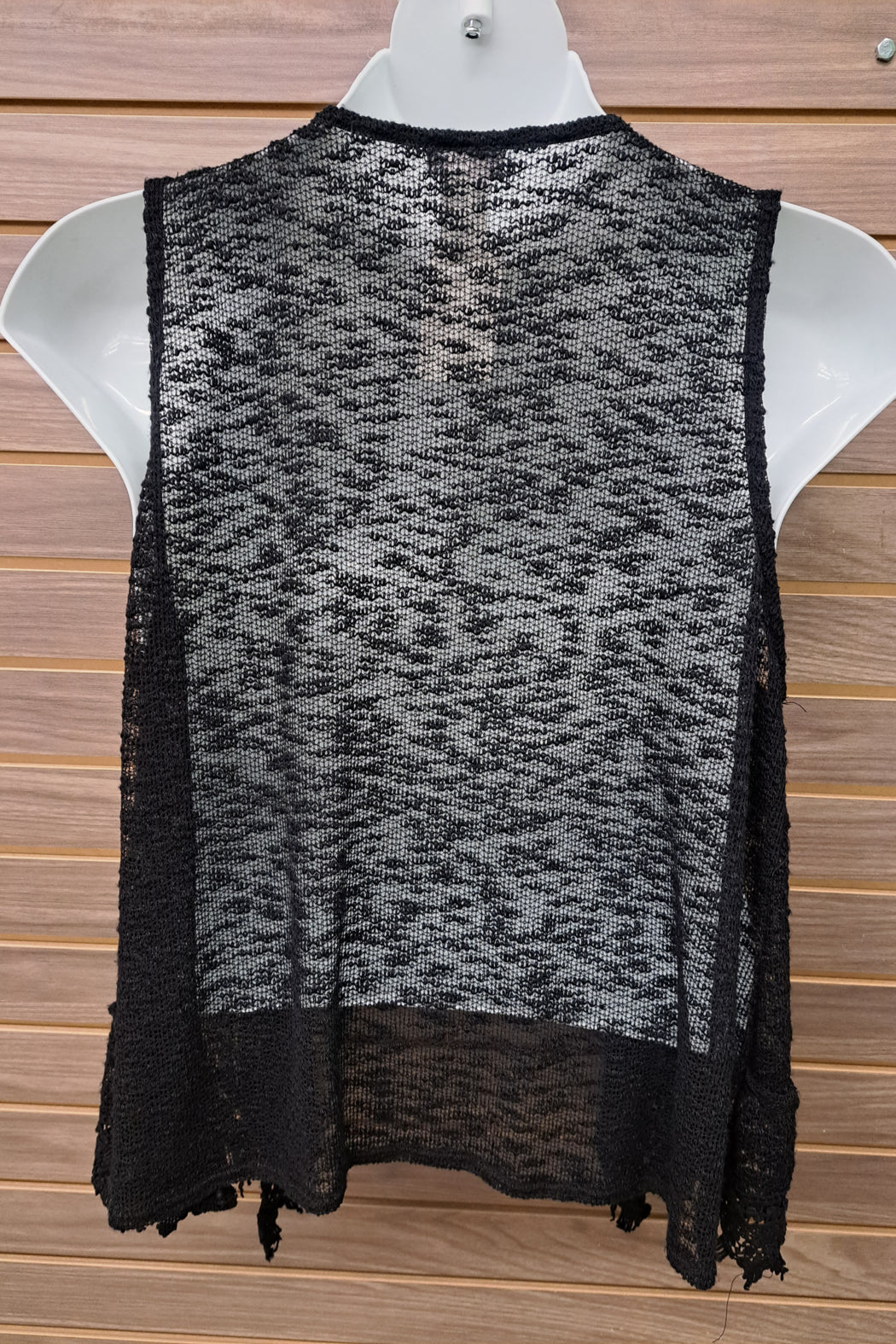 This black vest features a modern design with a sheer knit and lace bottom. Perfect for any occasion, this combination of materials offers a stylish and sophisticated look.