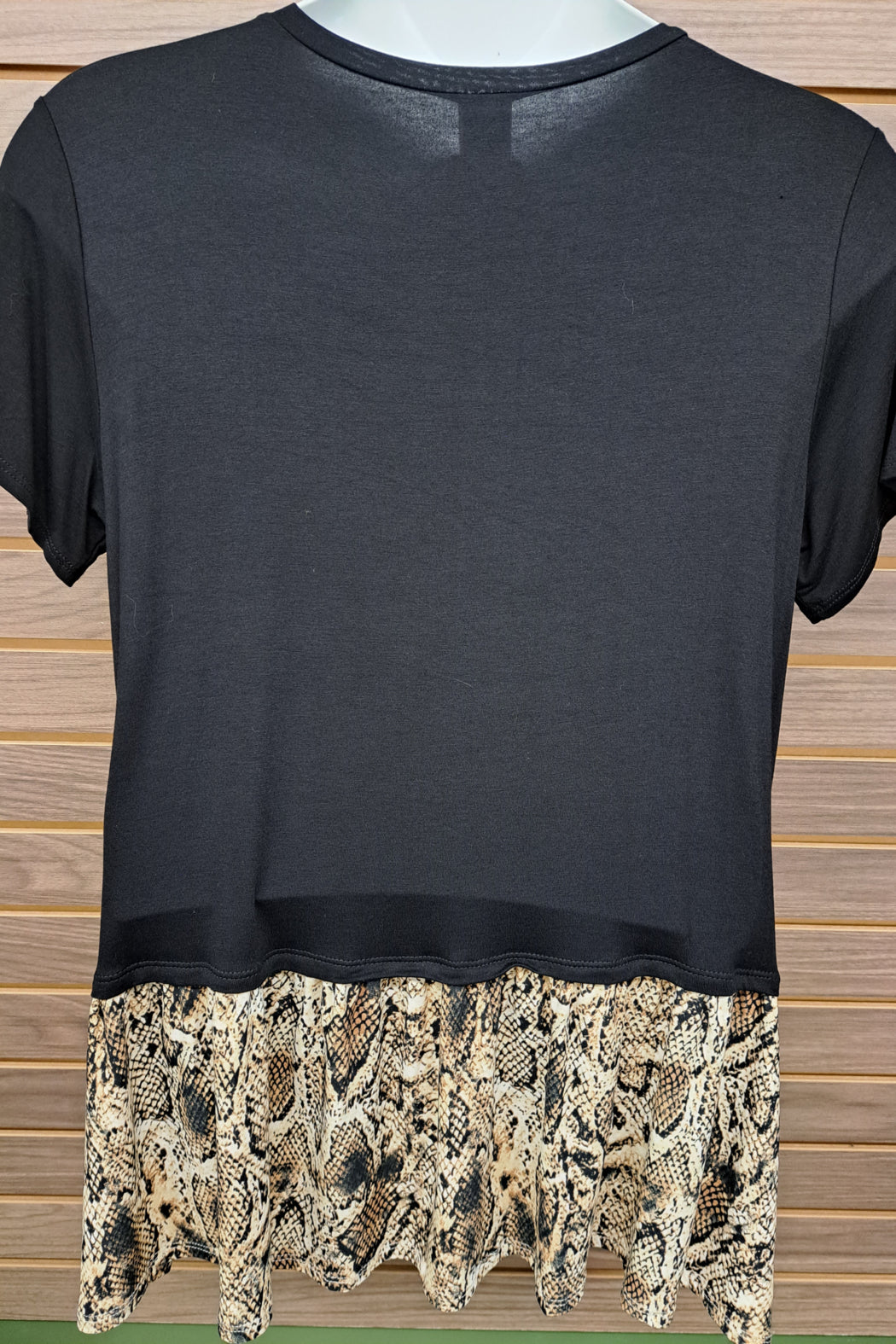 This Black Leopard Ruffled Bottom Long T-Shirt is the perfect combination of comfort and style. Crafted with lightweight, breathable fabric, you'll stay comfortable all day long. The ruffled bottom hemline adds a stylish touch to this classic leopard print. A must-have for any wardrobe.