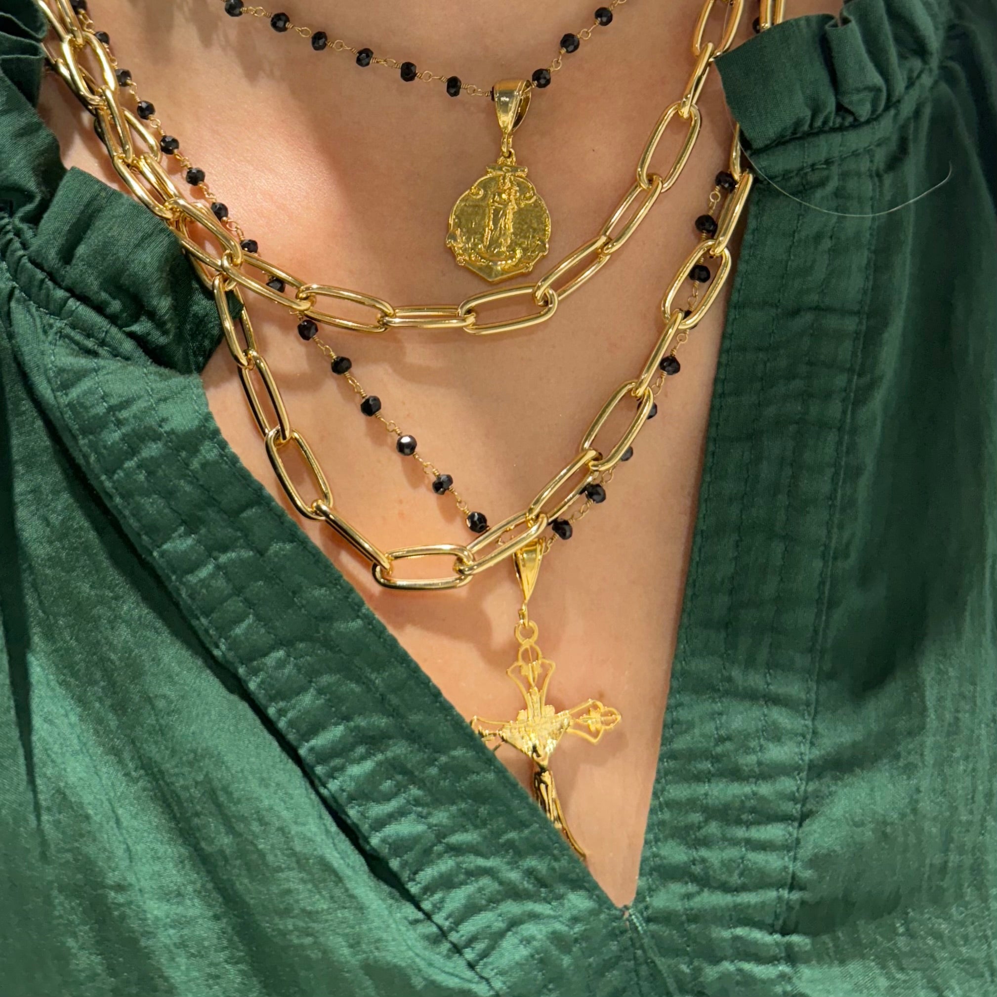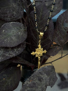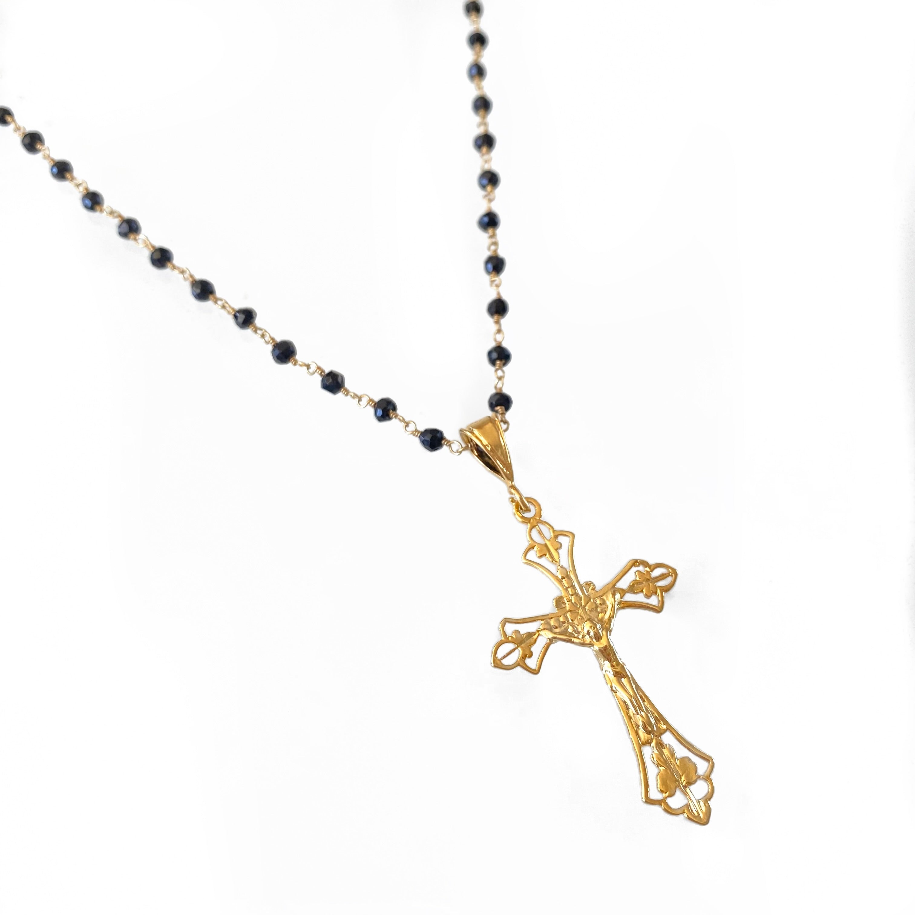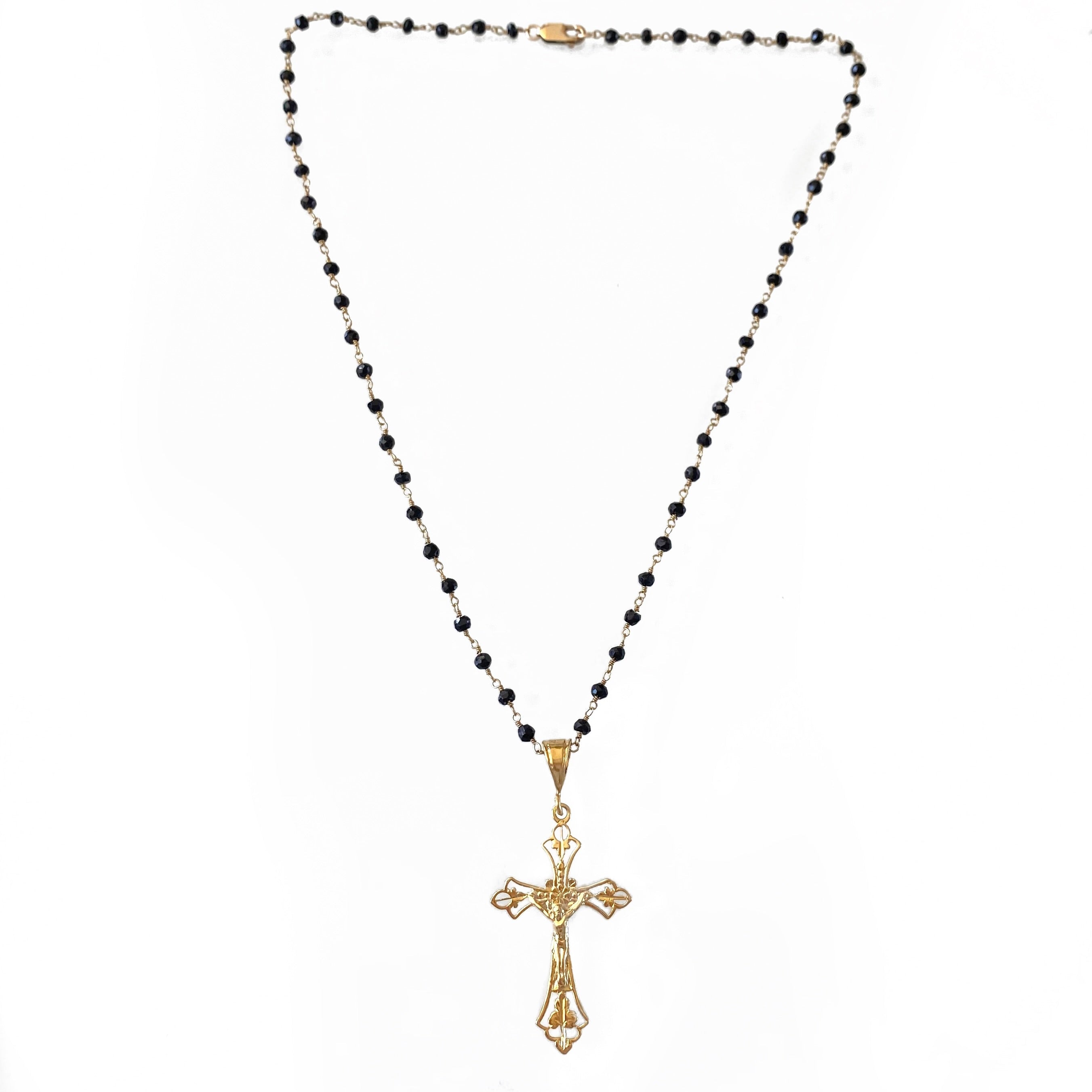 Elevate your style with the Black Onyx Cross Necklace, a timeless piece designed for both elegance and versatility. Handcrafted with 18K gold-filled material and featuring a wire-wrapped black onyx cross pendant, this necklace offers a distinctive look that complements any outfit. Measuring 18 inches, it is the perfect length for layering or wearing solo, making it a meaningful accessory for everyday wear or special occasions.