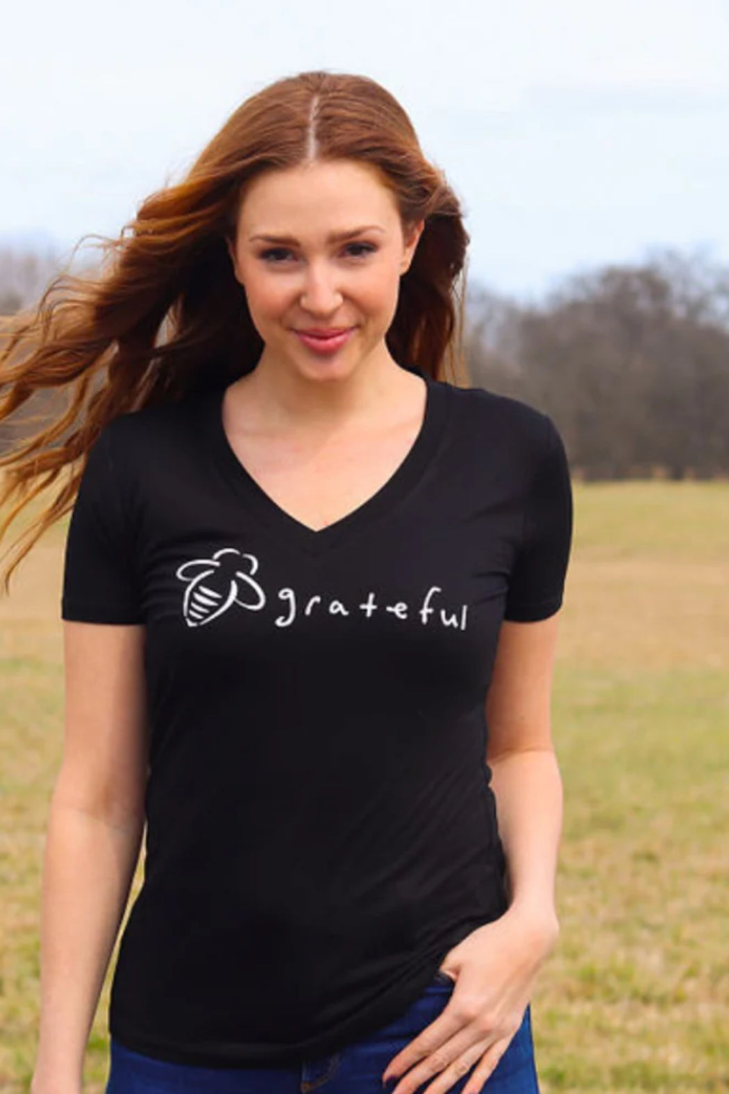 BEE Grateful tee with a flattering v-neckline and fabulous feeling fabric will be a gentle reminder of how to live your life!