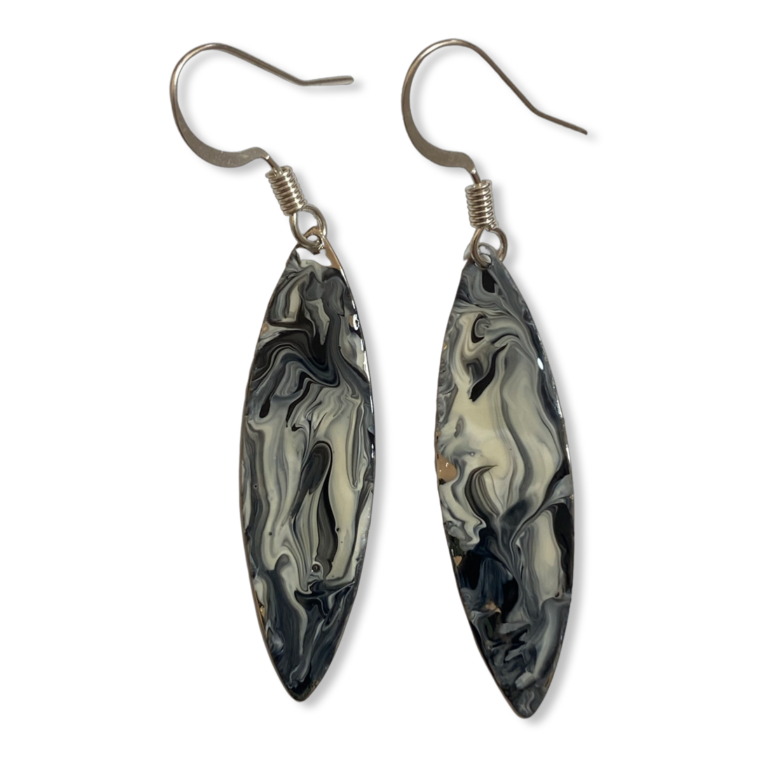 These hand painted Black & White-marbleized mini Navette earrings are from our signature collection of Lures of Love Earrings.