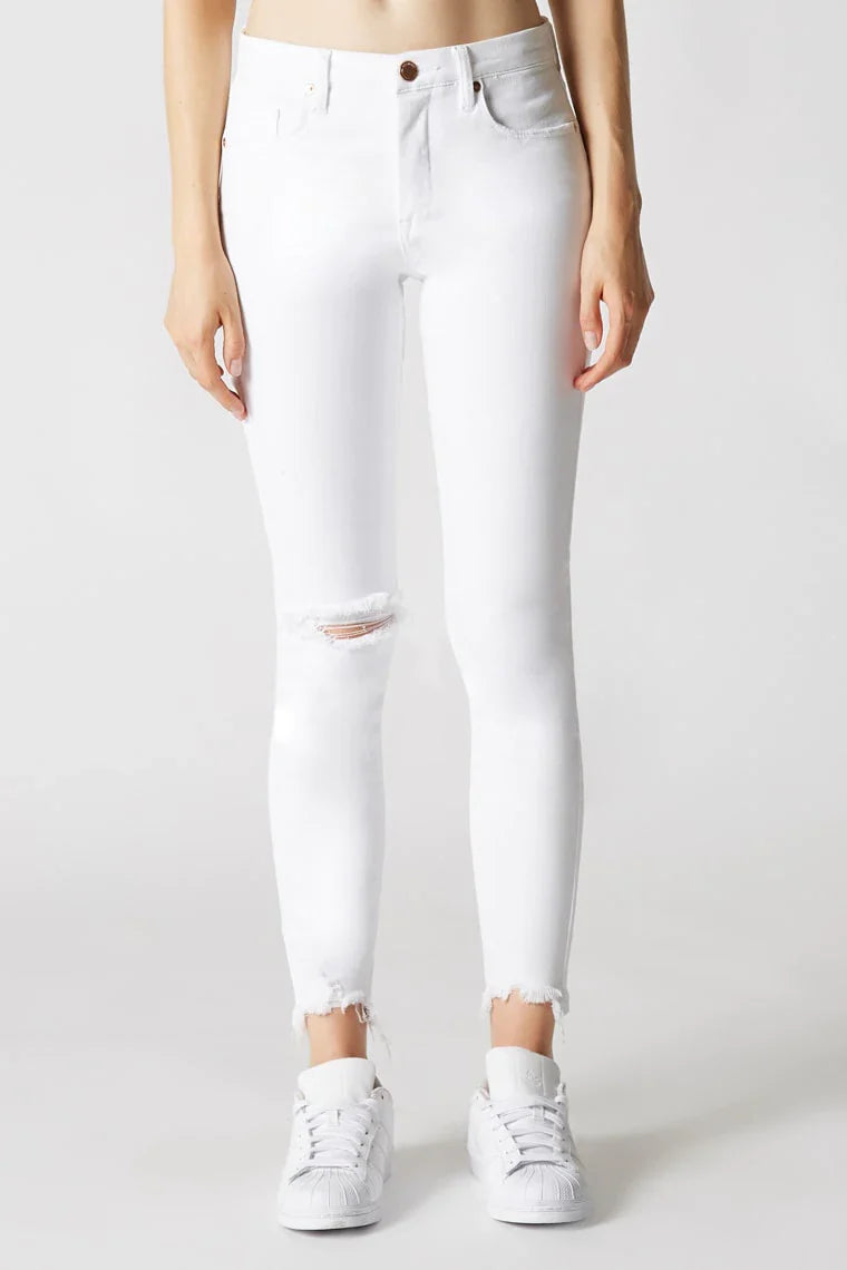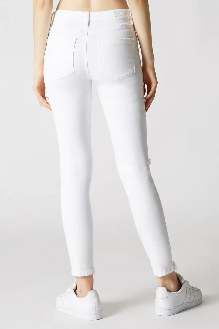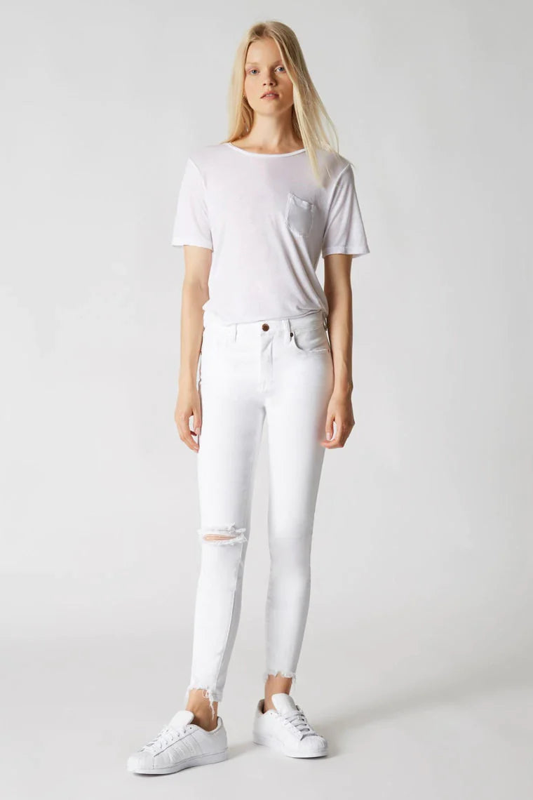 White skinny. 9 inch rise that flatters. A rip at the knee finshes these super soft staple jeans.
