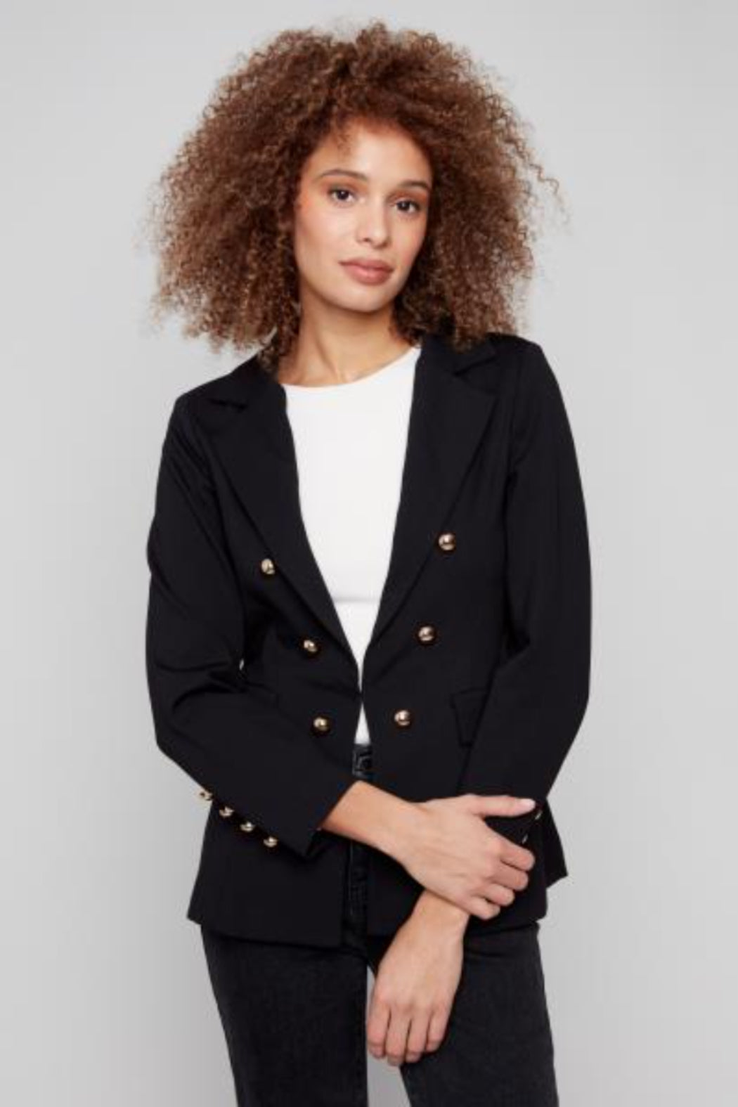 Our Classic Double-Breasted Blazer is a versatile staple designed to add a touch of polished elegance to any ensemble. Crafted in a sleek black fabric, this blazer features a tailored fit that flatters the figure and strong shoulders for a confident silhouette. The double-breasted front is accented with gleaming gold-toned buttons, adding a luxurious detail. Perfect for both professional settings and chic evening looks, this blazer can be effortlessly styled over a blouse and trousers, or draped over a dress.
