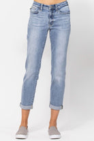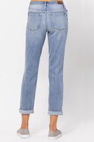 Your favorite denim in a relaxed fit, high waist jean! Five pocket design, light wash color. Has great stretch. See size chart in photos for sizing.