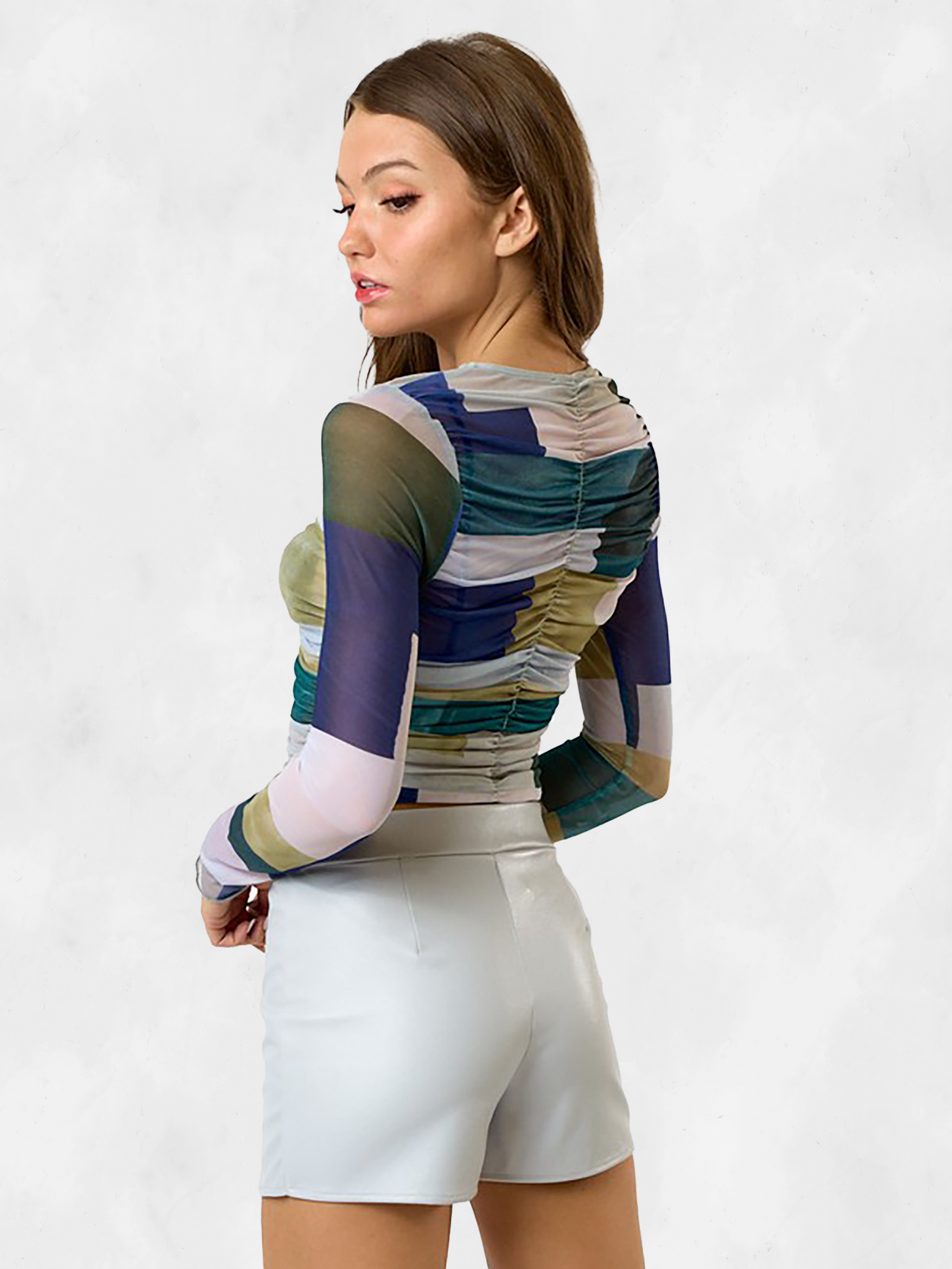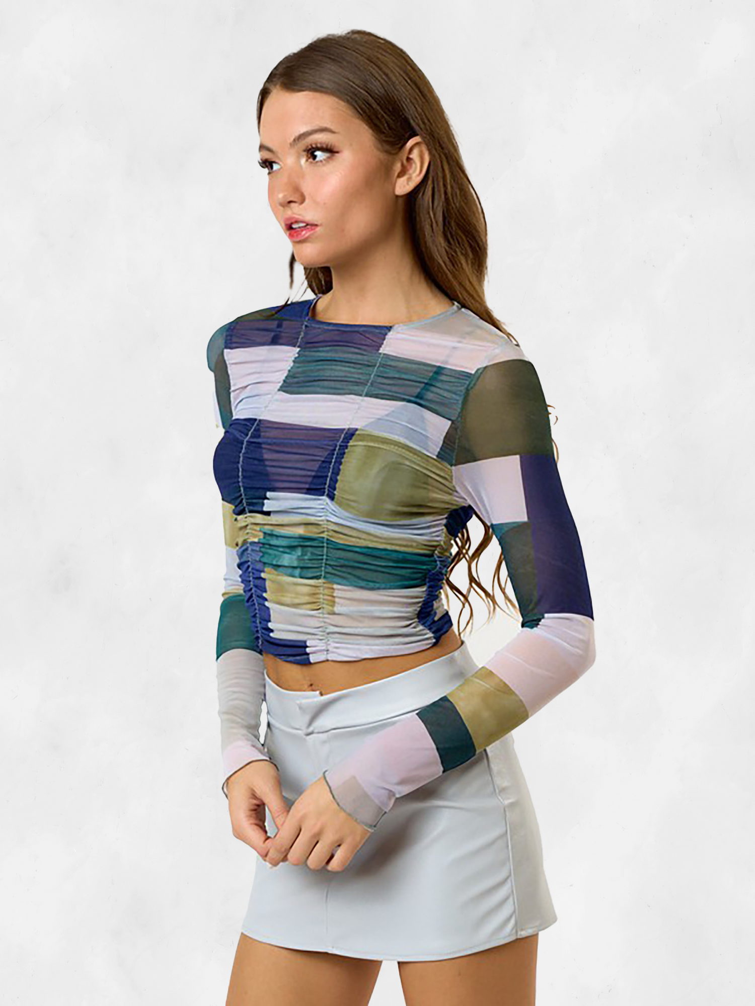 Description - Own your look with the Blue Blush. This mesh top features a captivating navy and green color block with a touch of blush for a playful twist. The airy, long-sleeve design offers a hint of intrigue and effortless layering.