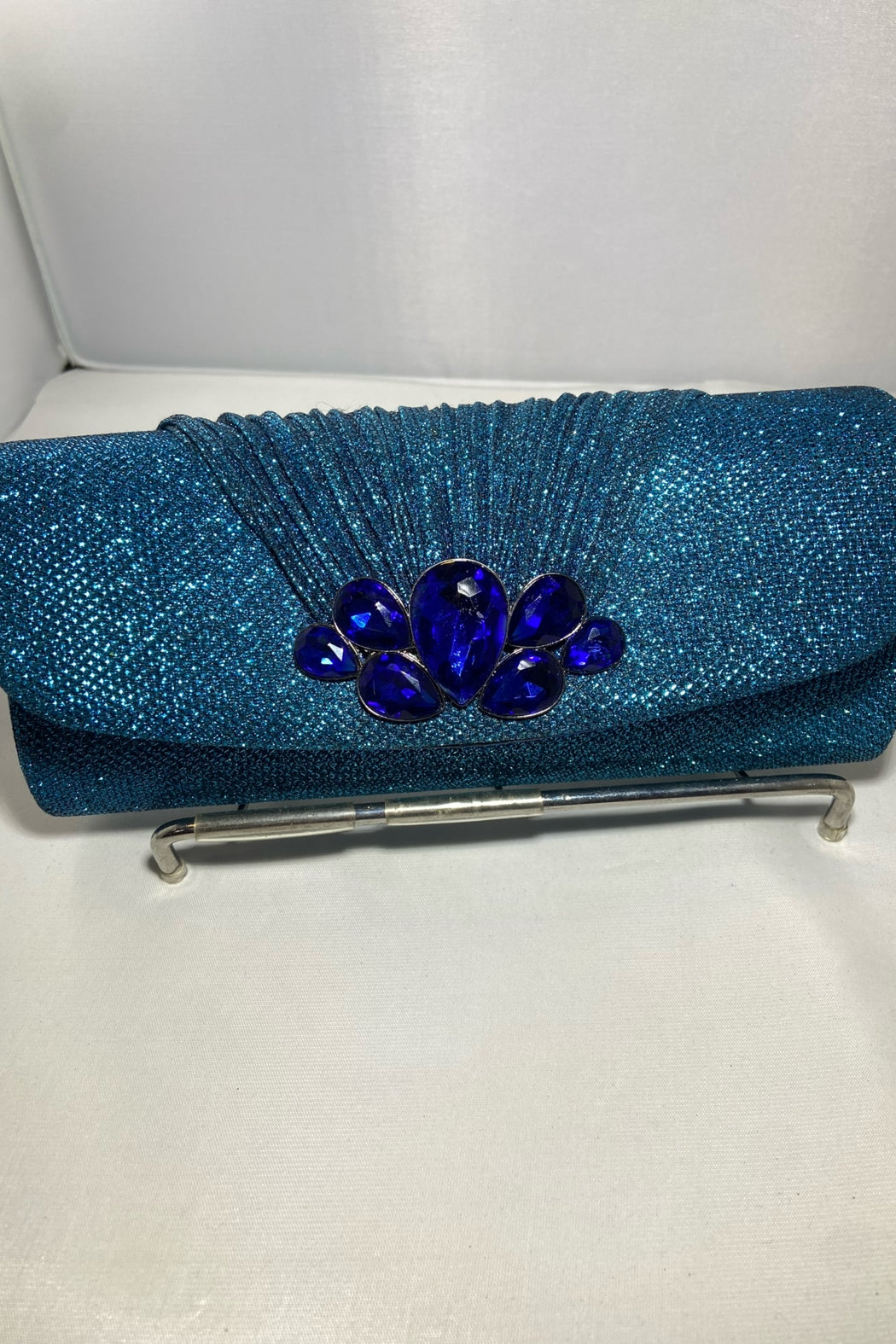 This is a beautiful navy clutch with a jewel detail in the center. It also has some ruching detail on the top of the clutch. It comes with 2 different length of chains for different ways to carry the clutch. The dimensions of the clutch are 8" long and 4" tall. Some phones may not fit in this clutch.