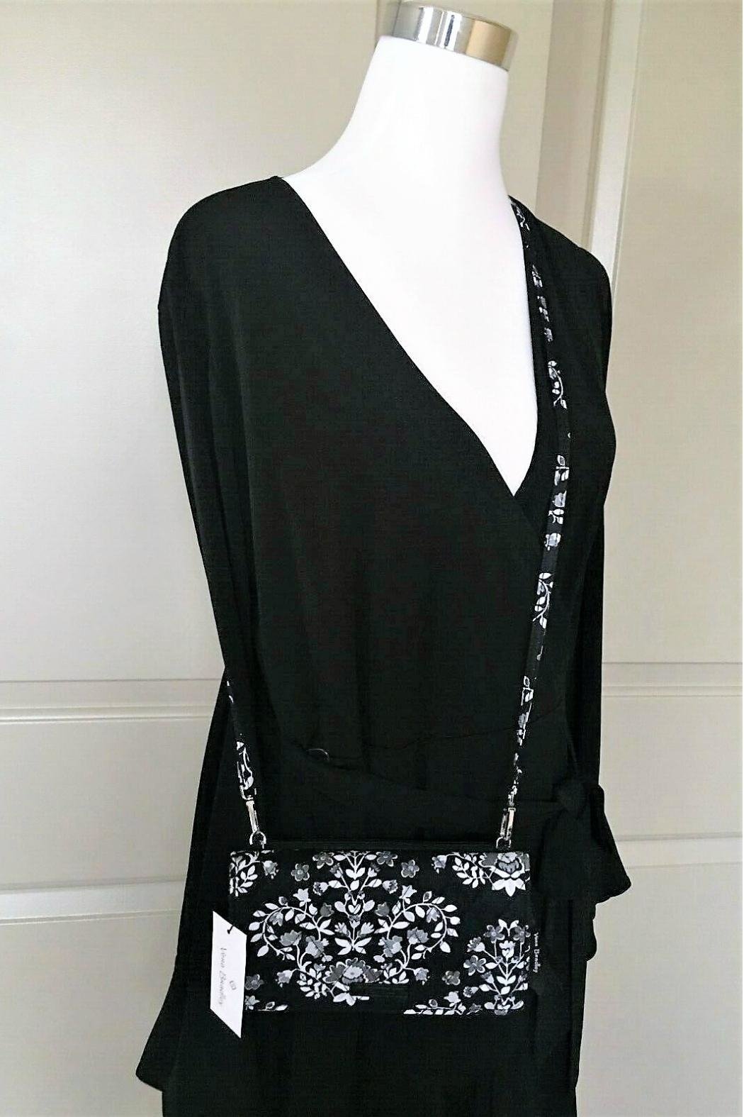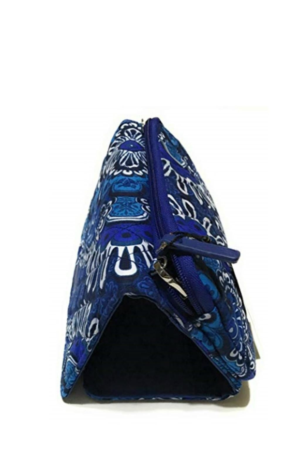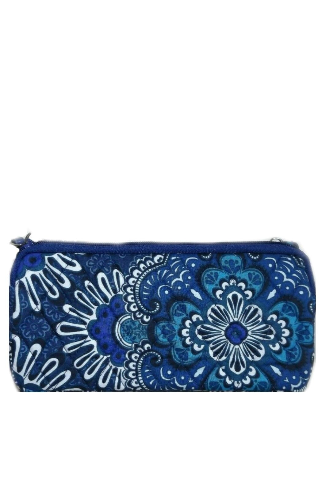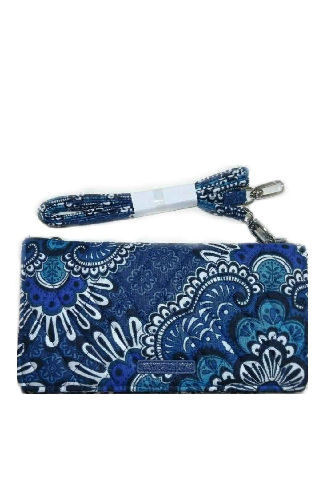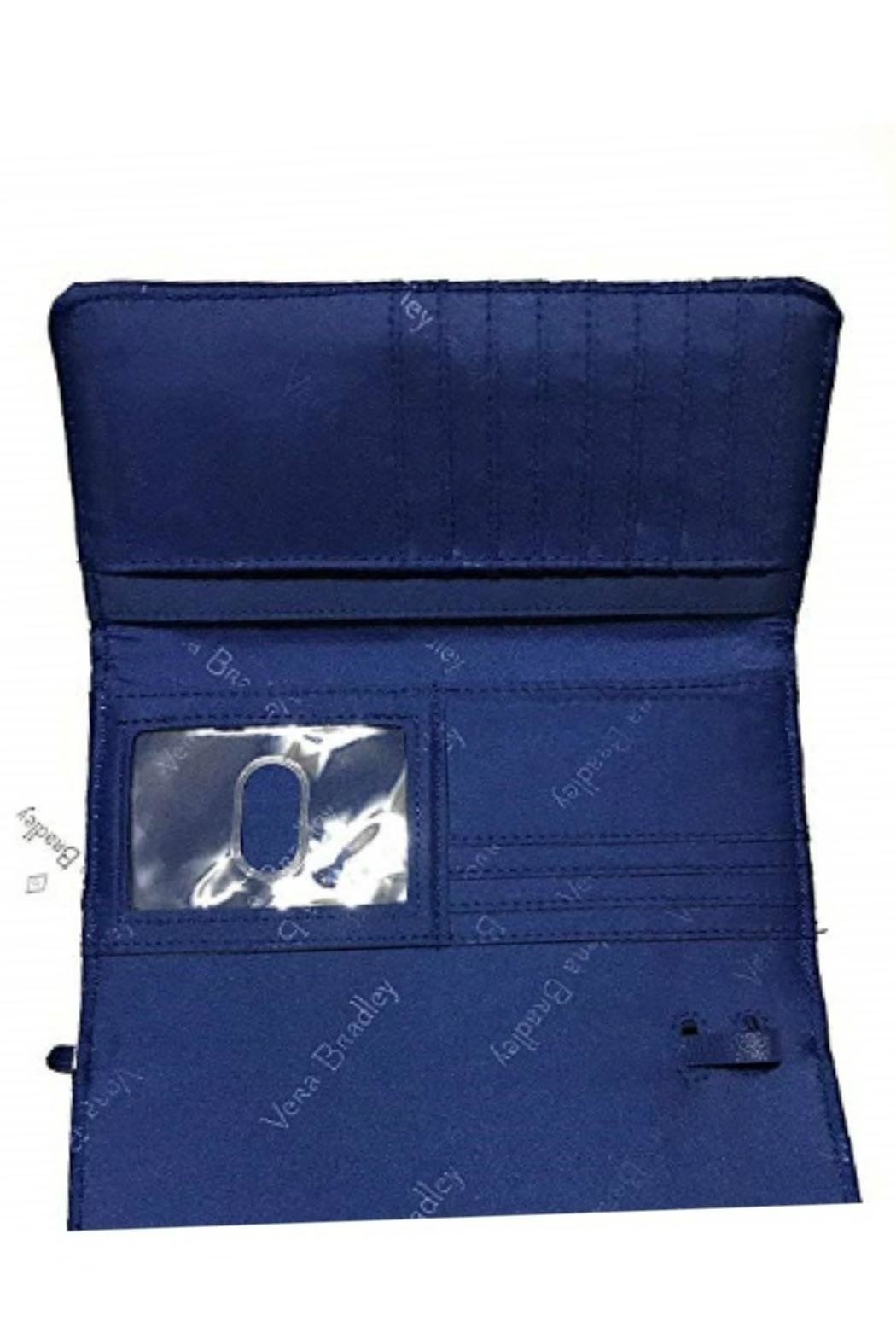 This is the Vera Bradley Wallet/Wristlet/Crossbody in the Blue Tapestry pattern. Made especially for today's larger phone's and for gals on the go. Front flap has engraved signature logo detail and fastens with a hidden magnetic snap. On the back is a large zip pocket big enough to keep today's largest cell phone (up to 7.5") accessible and secure. Under the magnetic flap is a retractable vegan leather wrist strap. The interior has 13 card slots, an ID window, and two bill pockets (or put your checkbook in here!) Made of sturdy light weight quilted cotton with a coordinating poly satin lining. It comes with a 53" removeable crossbody/shoulder strap for hands free use. Silver tone hardware. Pattern placement will vary making each wallet unique. Click on the "Mimi's Gift Gallery" boutique page to find other bags and accessories in the Blue Tapestry pattern. Dimensions: 8" wide x 4.5" high x 2" deep.