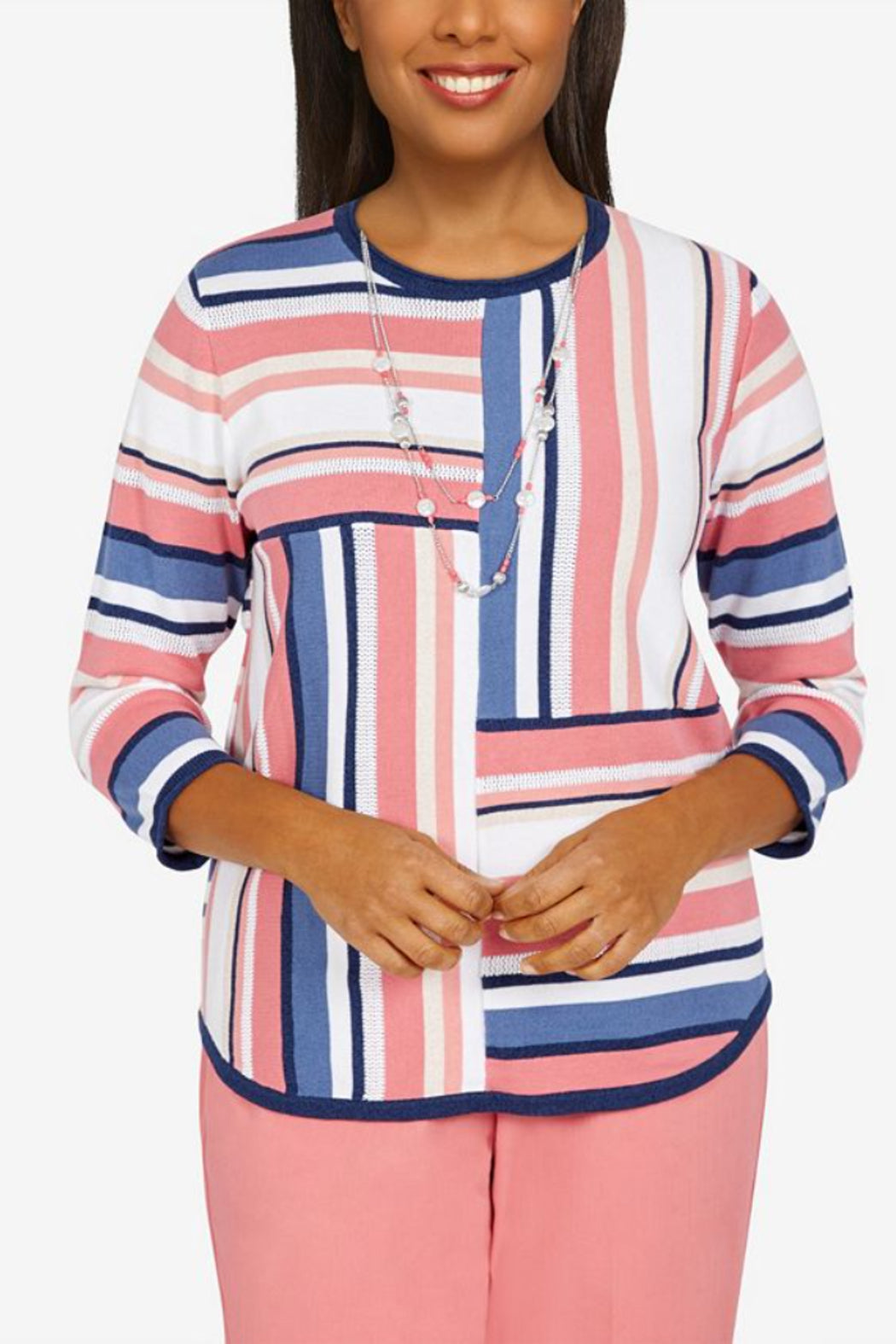 Boho colorblock 3/4 length sleeve sweater. Shirttail hem complete with detachable necklace at the crewneck.
